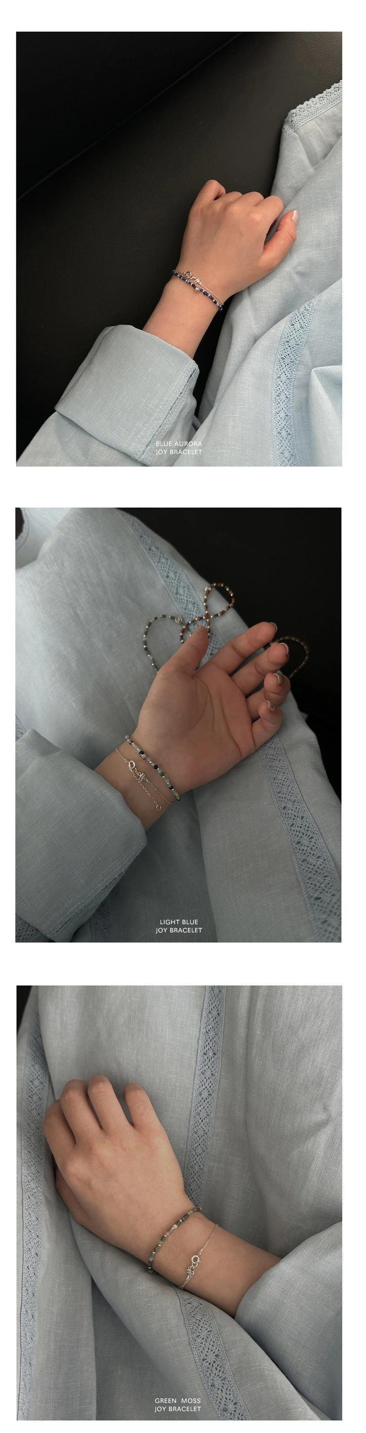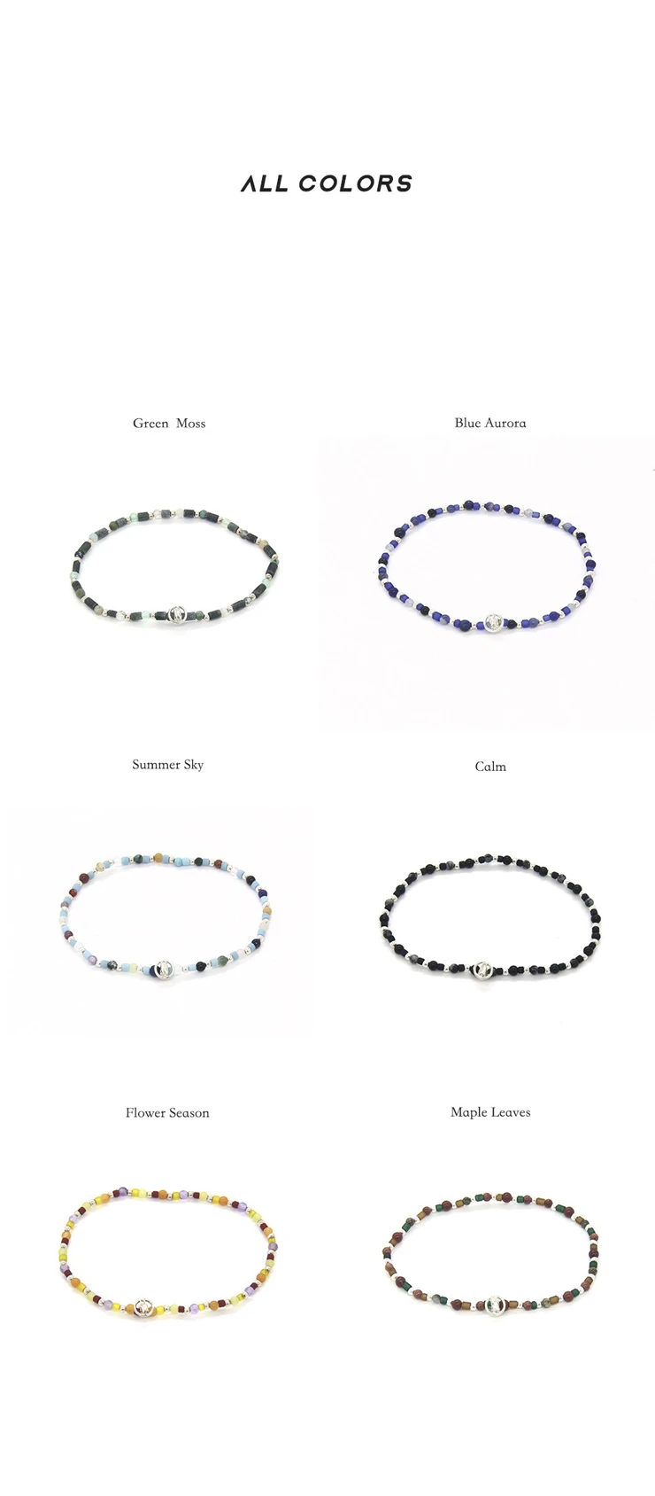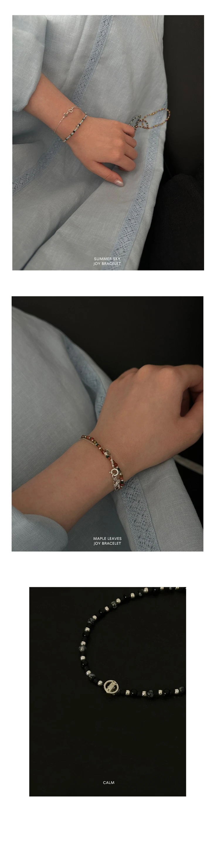 天然石とシルバーボールを使用し、カラーごとのイメージに合わせて四季の雰囲気を自然に表現したブレスレットです。小粒の天然石で仕上げた細めのデザインで、着脱が簡単で負担なく、どんなコーディネートにも重ね付けしやすいアイテムです。