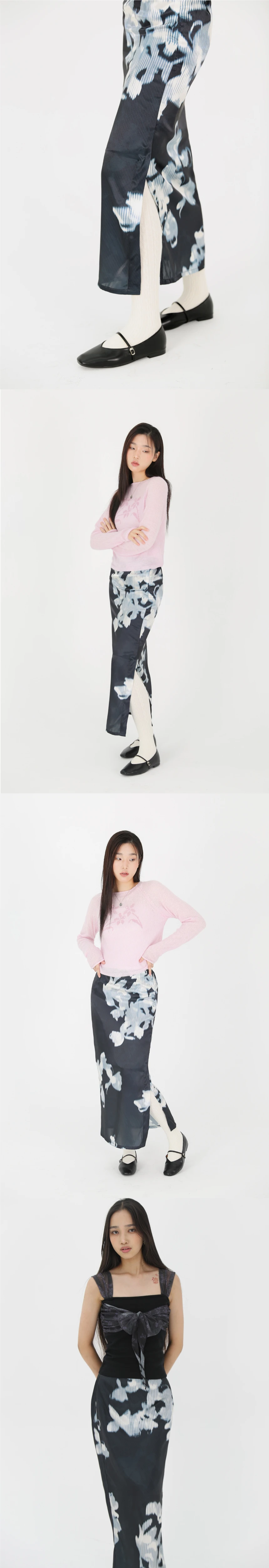 総丈92cmのマキシ丈スカート。バックゴム入りで44サイズから66サイズまで着用可能です。光沢感のある生地にスリムなペンシルラインを組み合わせ、ヒップはグラマラスに、脚はすっきり見えるデザイン。左下の重ねスリットが歩くたびにちらりと見え、ふくらはぎラインをより細くセクシーに演出します。