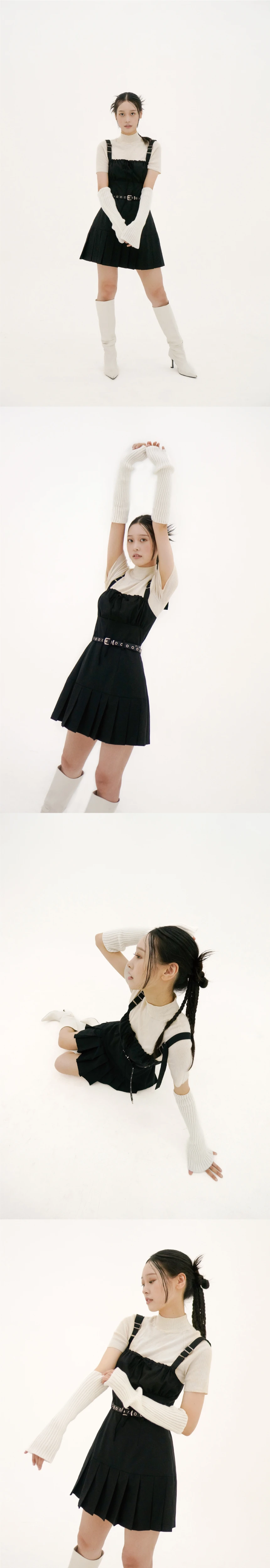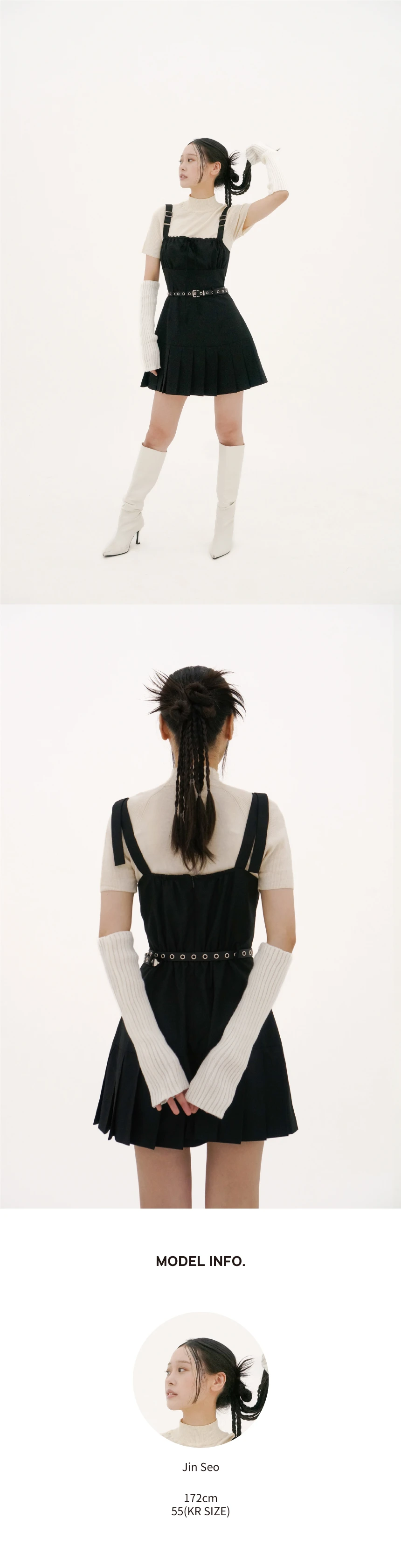 プリーツが魅力のプレッピーな雰囲気漂うバックルストラップドレスです。 フロントネックのドローストリングでバスト幅に合わせたサイズ調整が可能で、ショルダーバックルによってストラップの長さも調整できます。 ベルト付きのセットアイテムで、1枚での着用はもちろん、インナーやアウターとのレイヤードにも相性が良く、オールシーズン活躍する万能ドレスです。