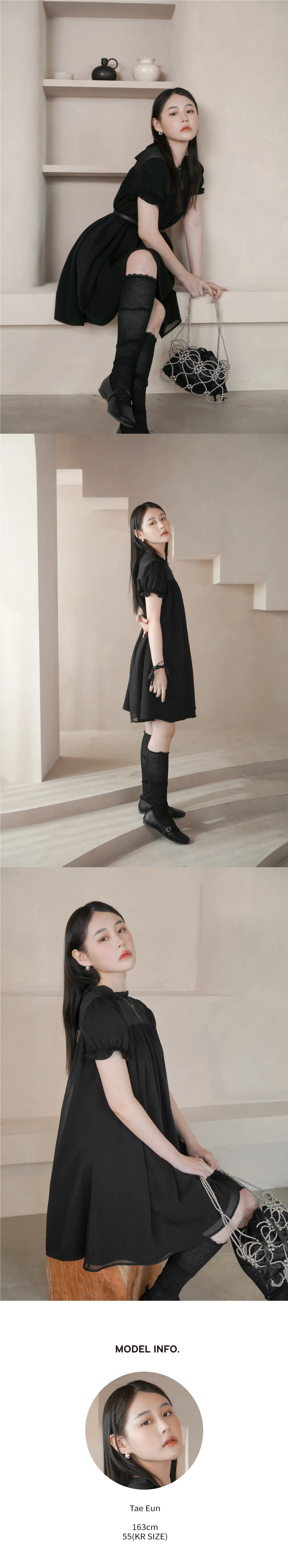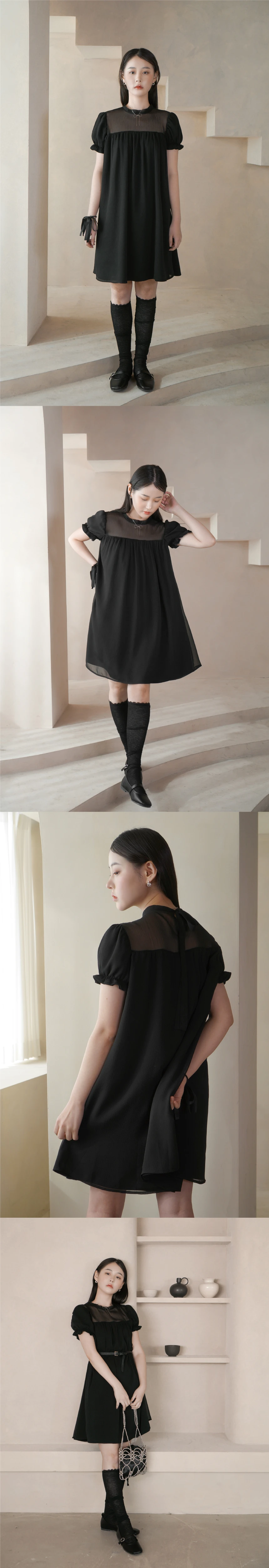 スクエアネックにあしらわれたシアーパネルが肩のラインを美しく引き立て、ベビードールシルエットでありながらも胸元が膨張して見えないよう、ボディラインに沿ってしなやかに落ちる美しいシルエットを演出します。