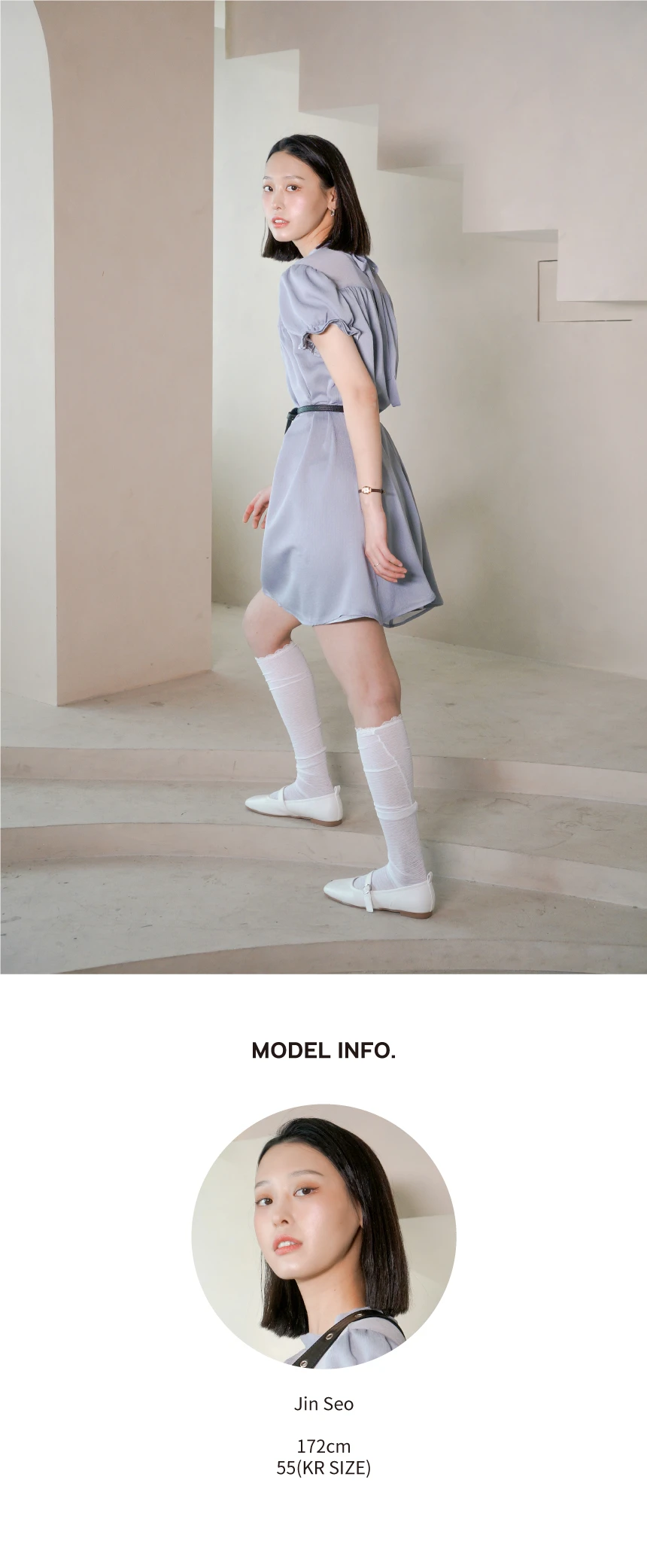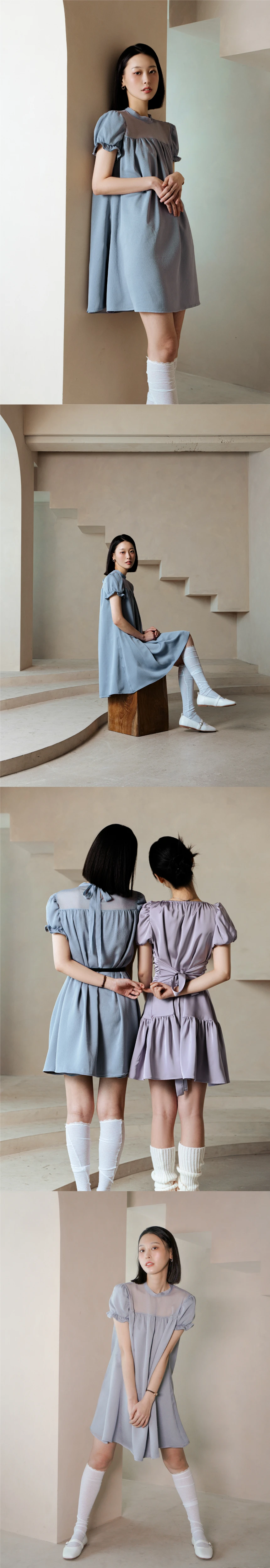 スクエアネックにあしらわれたシアーパネルが肩のラインを美しく引き立て、ベビードールシルエットでありながらも胸元が膨張して見えないよう、ボディラインに沿ってしなやかに落ちる美しいシルエットを演出します。