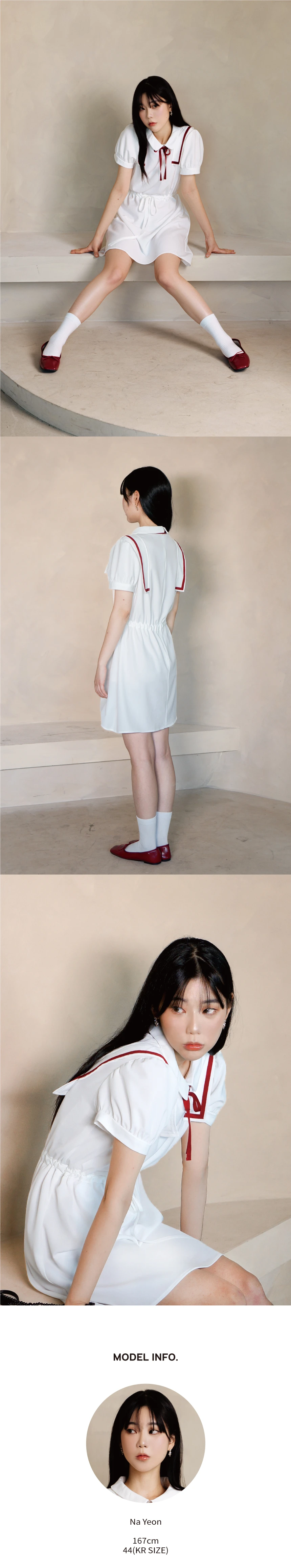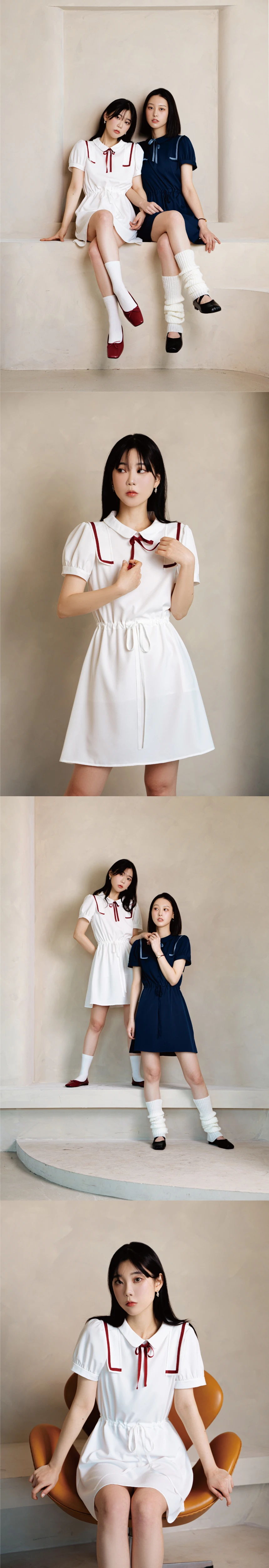 セミパフスリーブと肩の内側にあしらわれたセーラーカラーがポイントのミニワンピースです。 取り外し可能なリボンタイが付属しており、ウエストのドローストリングでサイズやお好みに合わせてシルエットを調整できます。 身頃全体に夏用の裏地を施しており、インナーが透けにくく安心して着用いただける一着です。