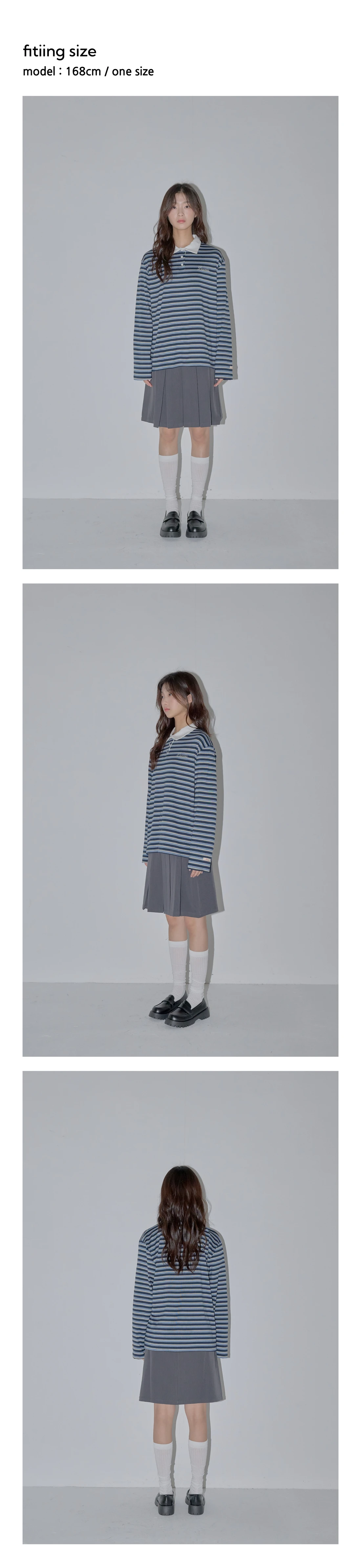 [DESCRIPTION] Dearsisが提案する、クラシックなスクールガールムードのストライプラグビーTシャツです。しっかりとした編み感でありながらも柔らかく伸縮性のある素材を使用し、 肌触りが良く、着心地も抜群です。ゆとりのあるシルエットでどなたでも快適に着用でき、手の甲までかかる袖丈とやや長めの着丈が安定感のあるシルエットを演出します。襟とボタンのディテールがきちんとした印象を与え、左胸のDearsisロゴ刺繍と袖のラベルがさりげないポイントになっています。グレーとネイビーの2色展開で、どちらもトーンオントーンのストライプパターンが特徴。秋には一枚で、冬にはニットやアウターのインナーとして活躍する、 F/Wシーズンに重宝する魅力的なアイテムです。 [SIZE GUIDE] 着丈 70cm 肩幅 47cm バスト 54cm 裾幅 55cm 袖幅 59cm [DETAILS] 95% POLYESTER 5% SPANDEX MADE IN KOREA