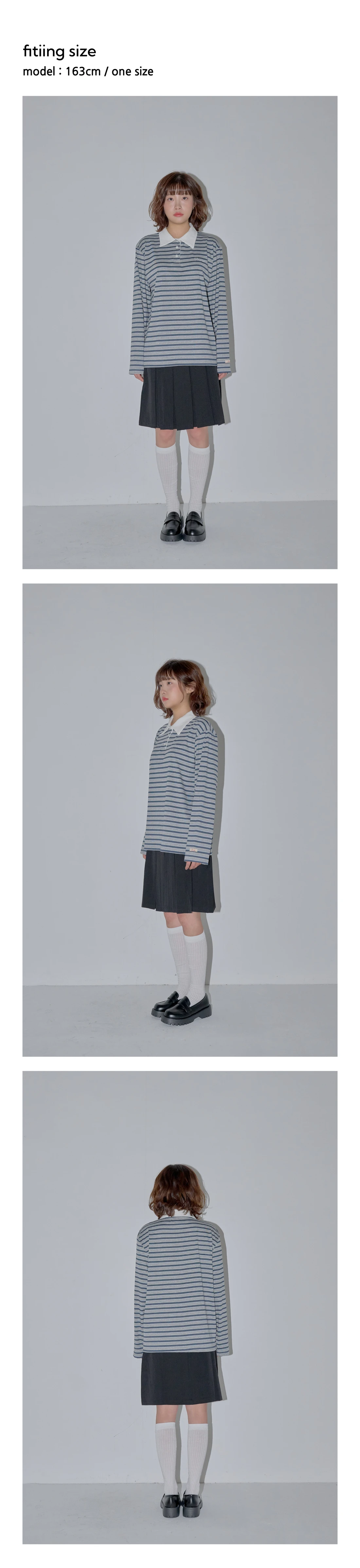 [DESCRIPTION] Dearsisが提案する、クラシックなスクールガールムードのストライプラグビーTシャツです。しっかりとした編み感でありながらも柔らかく伸縮性のある素材を使用し、 肌触りが良く、着心地も抜群です。ゆとりのあるシルエットでどなたでも快適に着用でき、手の甲までかかる袖丈とやや長めの着丈が安定感のあるシルエットを演出します。襟とボタンのディテールがきちんとした印象を与え、左胸のDearsisロゴ刺繍と袖のラベルがさりげないポイントになっています。グレーとネイビーの2色展開で、どちらもトーンオントーンのストライプパターンが特徴。秋には一枚で、冬にはニットやアウターのインナーとして活躍する、 F/Wシーズンに重宝する魅力的なアイテムです。 [SIZE GUIDE] 着丈 70cm 肩幅 47cm バスト 54cm 裾幅 55cm 袖幅 59cm [DETAILS] 95% POLYESTER 5% SPANDEX MADE IN KOREA