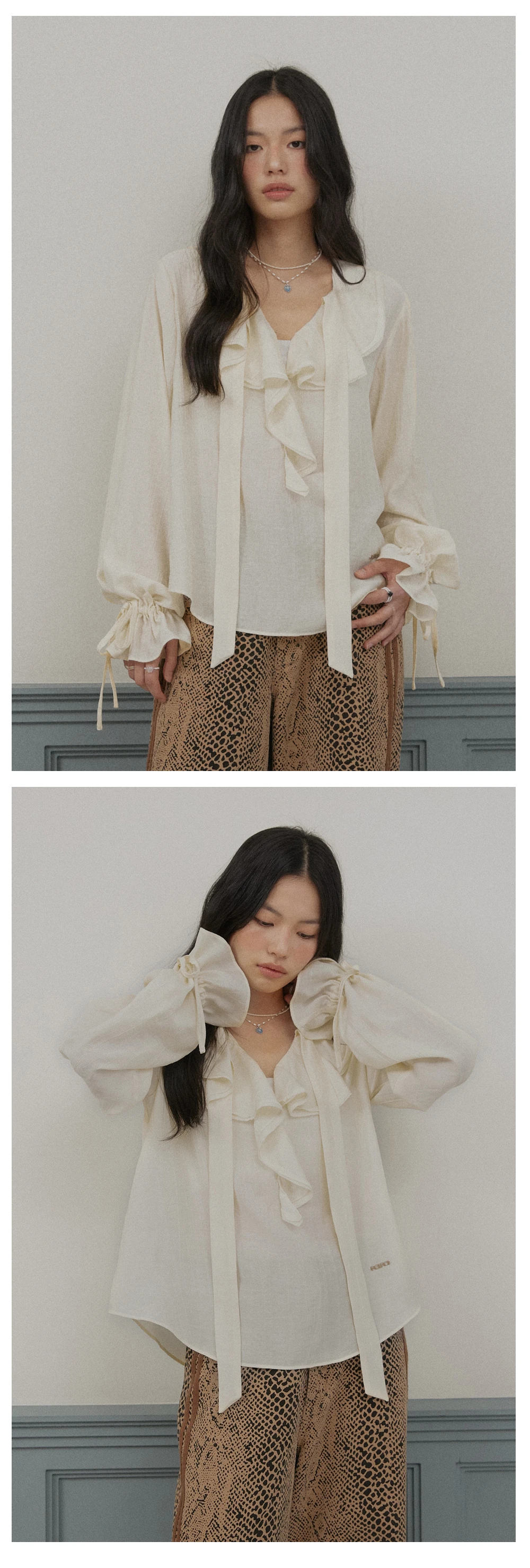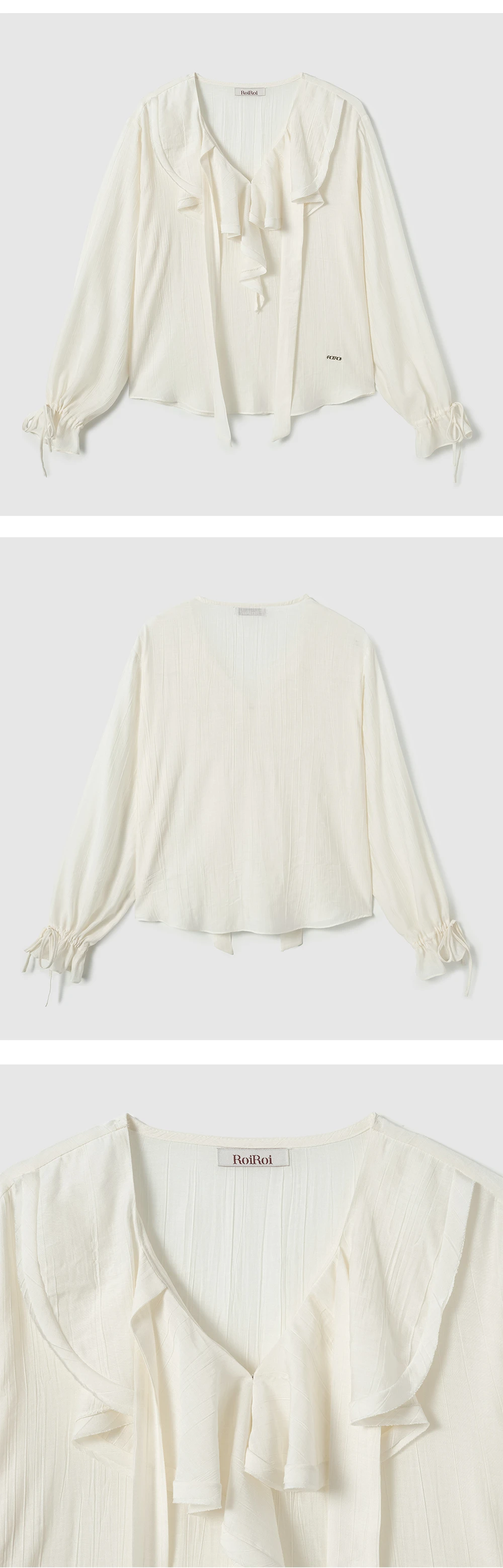 ボリューム感のあるラッフルディテールと、袖口に同素材のリボンをあしらったブラウス。通気性に優れたレーヨン混素材を使用し、ほのかな光沢感のある生地が上品な印象を演出します。さらにナイロン素材を加えることで、シワになりにくく仕上げました。