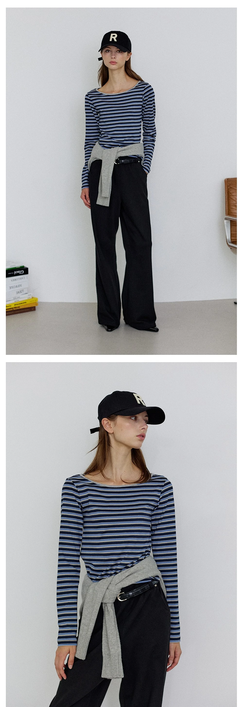 クラシックなストライプロングスリーブTシャツ。ボートネックデザインで、しっかりとしたシルキーな素材を使用しています。
