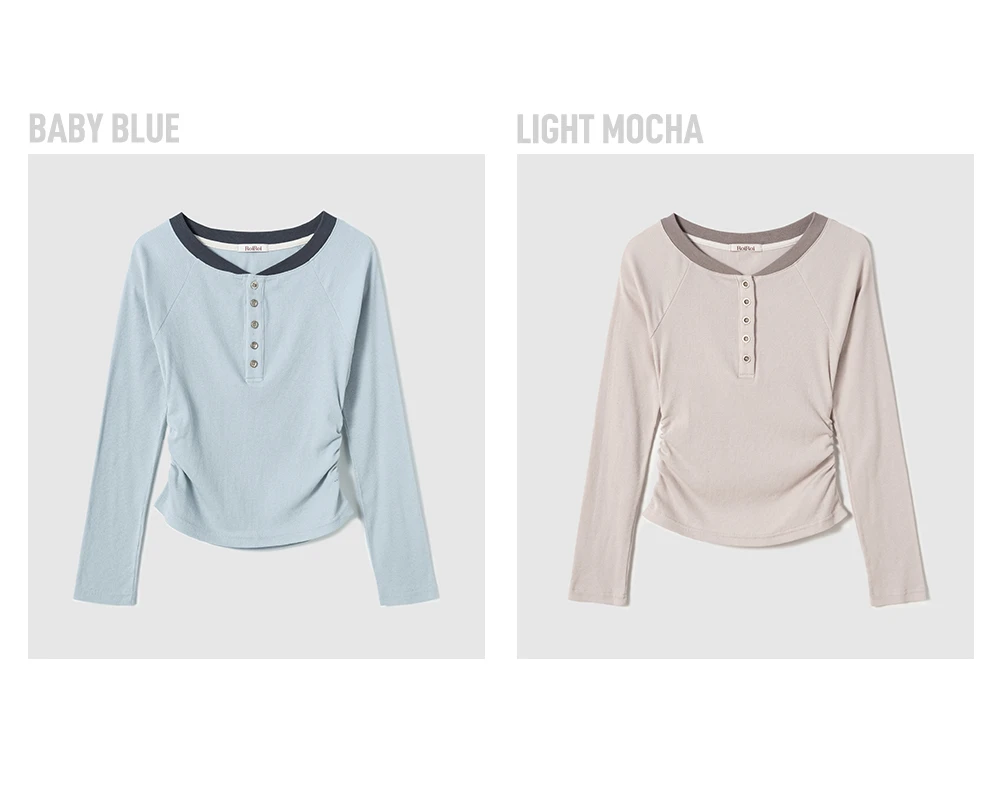 クラシックなヘンリーネックのロングスリーブTシャツ。サイドのシャーリングディテールが特徴で、軽く伸縮性のあるリブ素材を使用。ネックラインの配色デザインがポイントです。