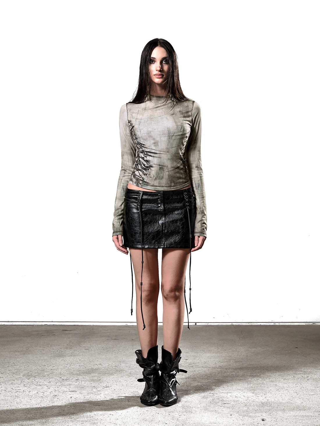 ・クラッキング加工を施したフェイクレザーのローライズミニスカート