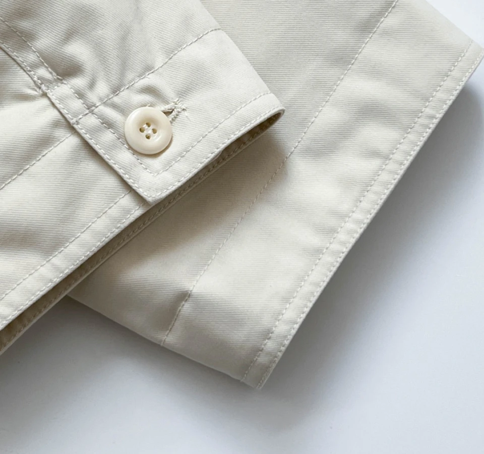 袖のボタンをゆるめてワイドに、あるいはしっかり留めてスリムに演出できるデザイン。