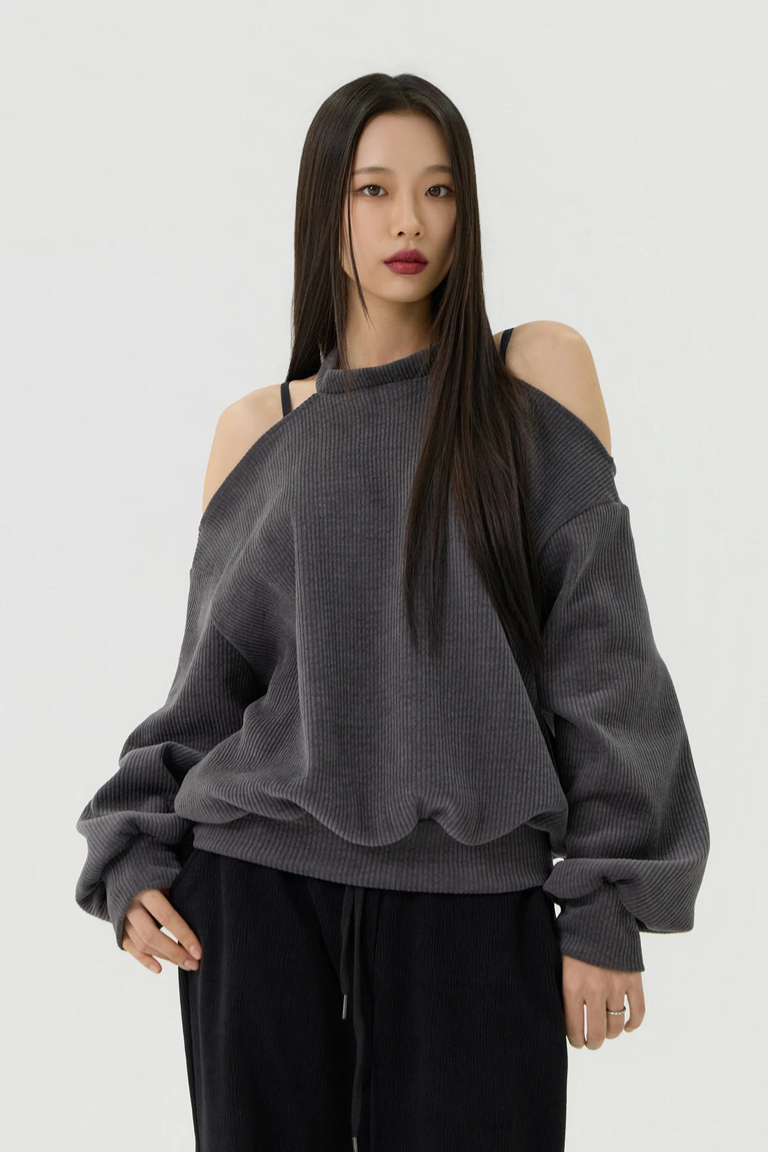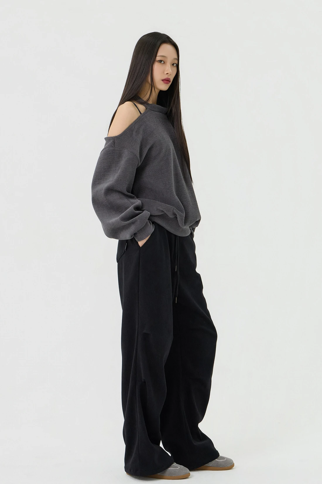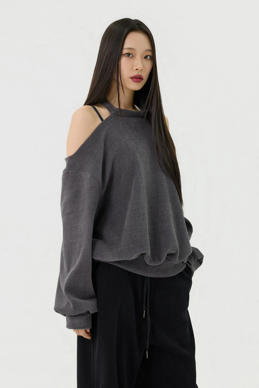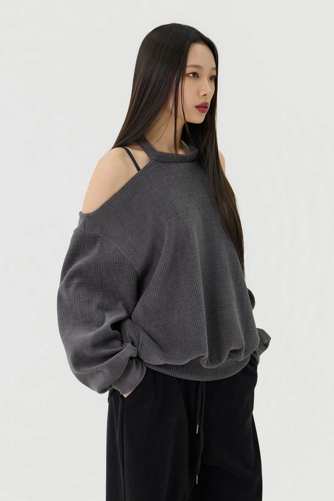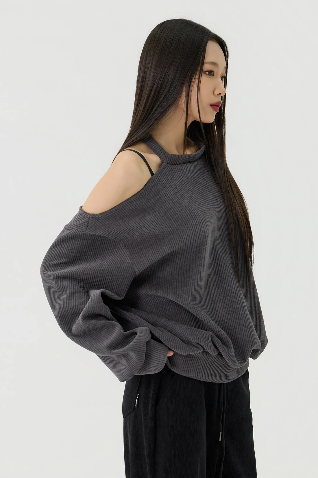 ドロップショルダーラインとカットアウトディテールがポイントのルーズフィットトップス。セミオフショルダーシルエットに、細やかなリブテクスチャーの生地を使用し、カジュアルながらも個性的なスタイルを演出します。 素材:ポリエステル 95%、スパン 5% カラー:チャコール モデル:168cm/BUST 32/WAIST 26/ONEサイズ着用 サイズ(cm) ONE SIZE:着丈 65/肩幅 50/バスト 52/ウエスト 55/袖丈 67