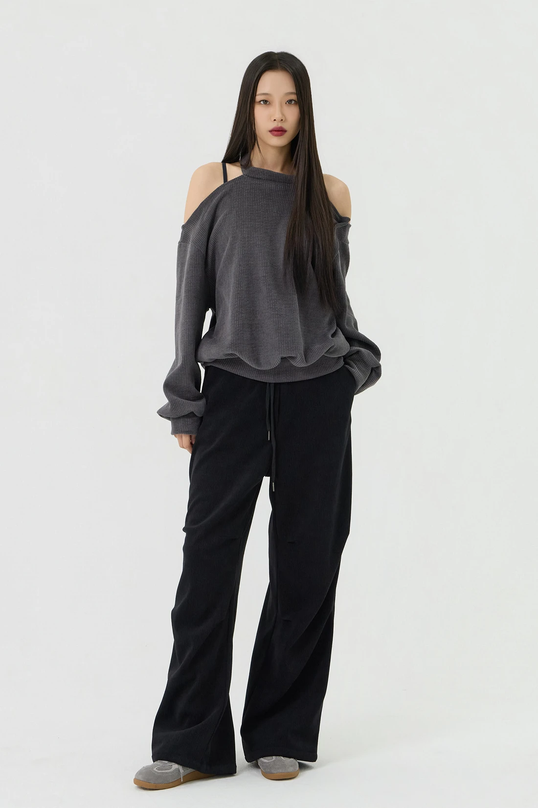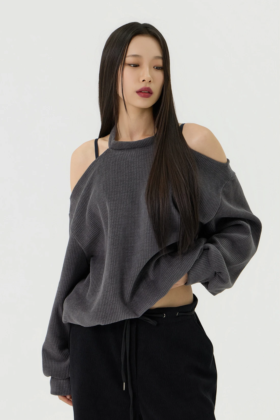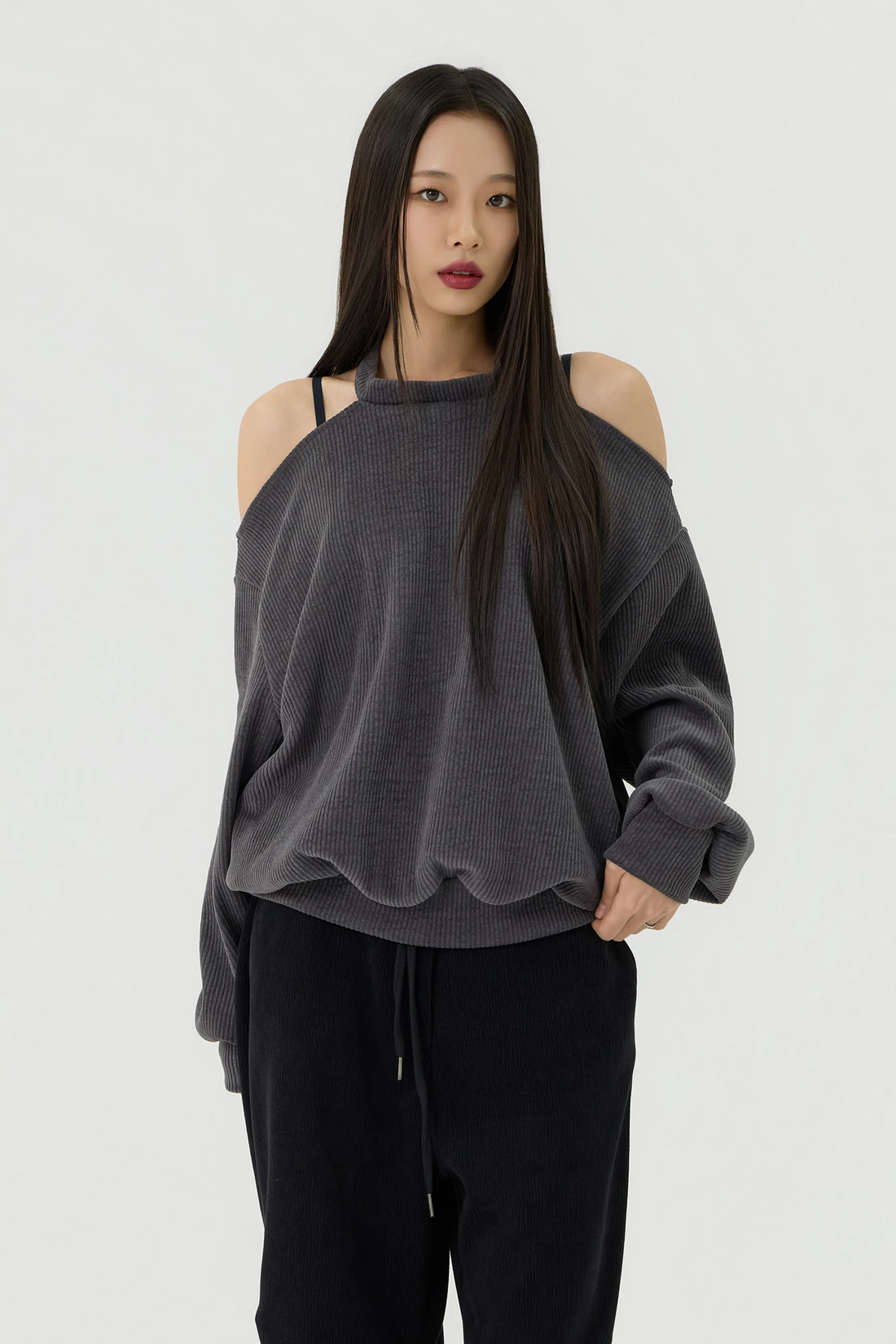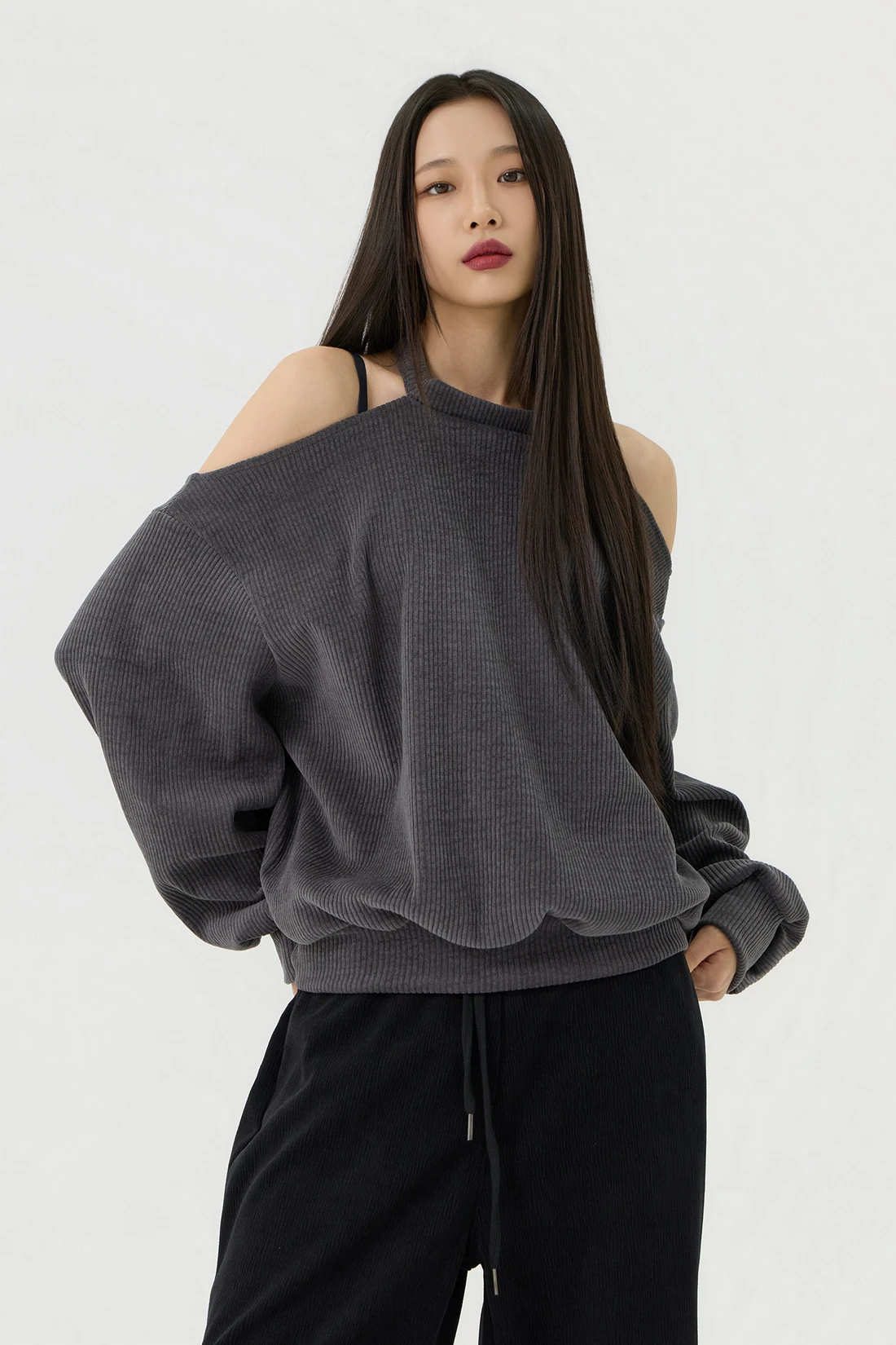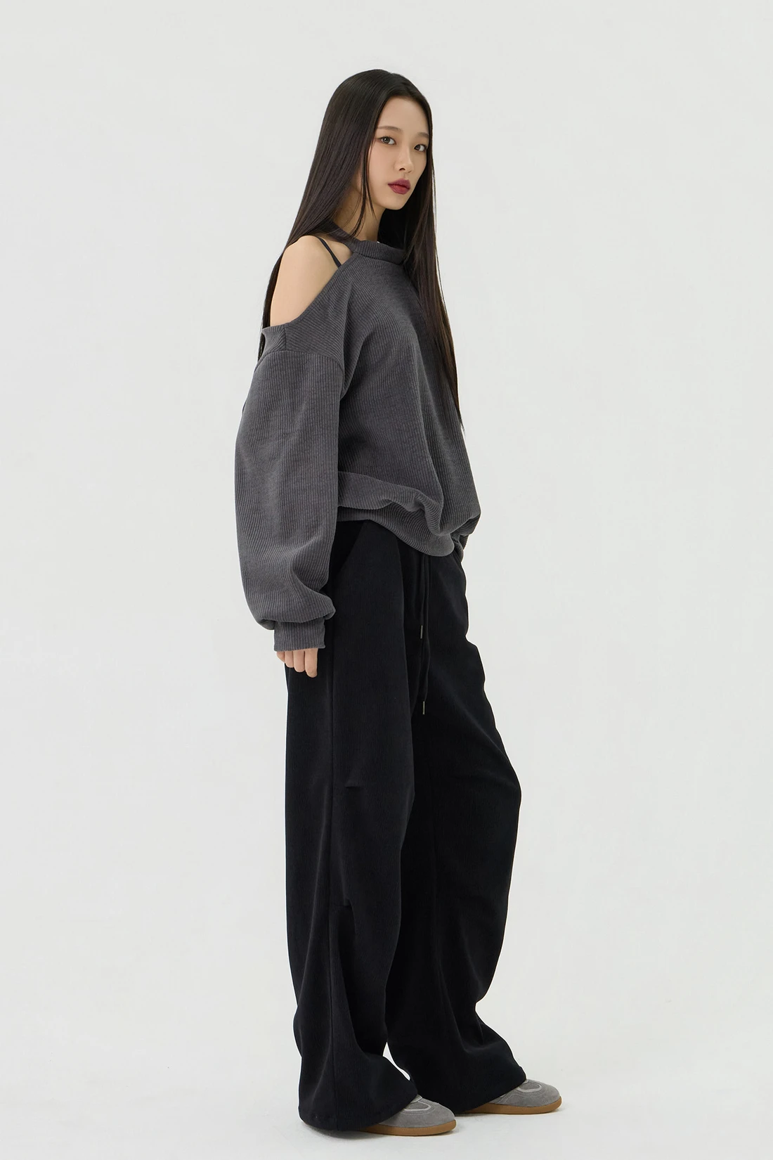 ドロップショルダーラインとカットアウトディテールがポイントのルーズフィットトップス。セミオフショルダーシルエットに、細やかなリブテクスチャーの生地を使用し、カジュアルながらも個性的なスタイルを演出します。 素材:ポリエステル 95%、スパン 5% カラー:チャコール モデル:168cm/BUST 32/WAIST 26/ONEサイズ着用 サイズ(cm) ONE SIZE:着丈 65/肩幅 50/バスト 52/ウエスト 55/袖丈 67
