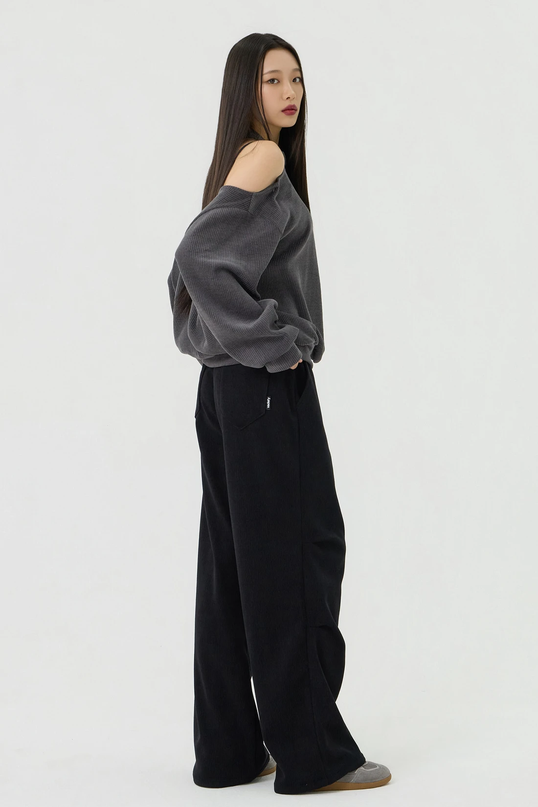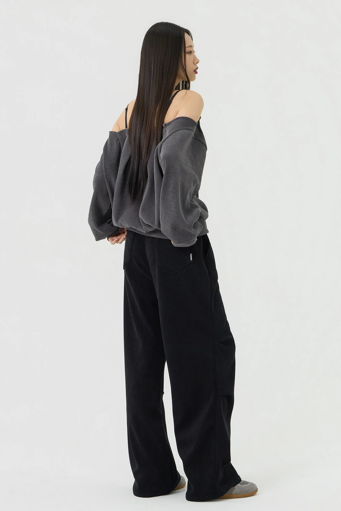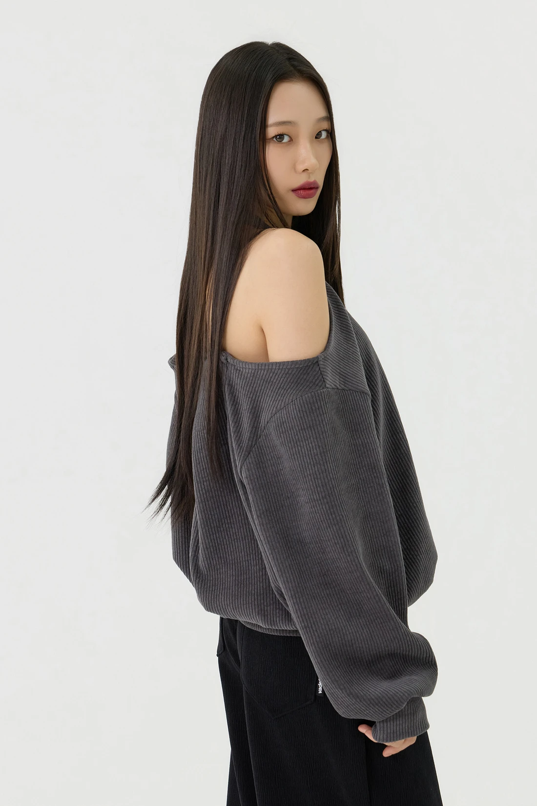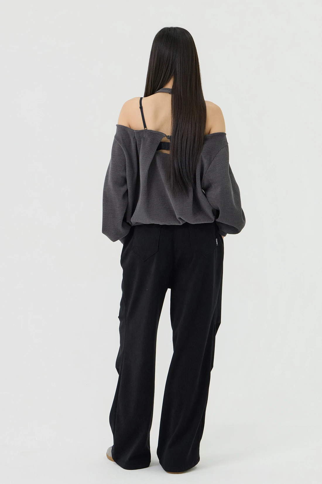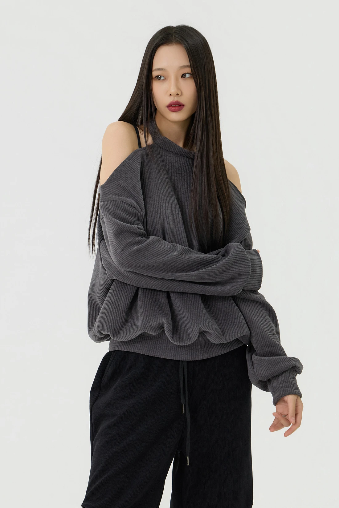 ドロップショルダーラインとカットアウトディテールがポイントのルーズフィットトップス。セミオフショルダーシルエットに、細やかなリブテクスチャーの生地を使用し、カジュアルながらも個性的なスタイルを演出します。 素材:ポリエステル 95%、スパン 5% カラー:チャコール モデル:168cm/BUST 32/WAIST 26/ONEサイズ着用 サイズ(cm) ONE SIZE:着丈 65/肩幅 50/バスト 52/ウエスト 55/袖丈 67