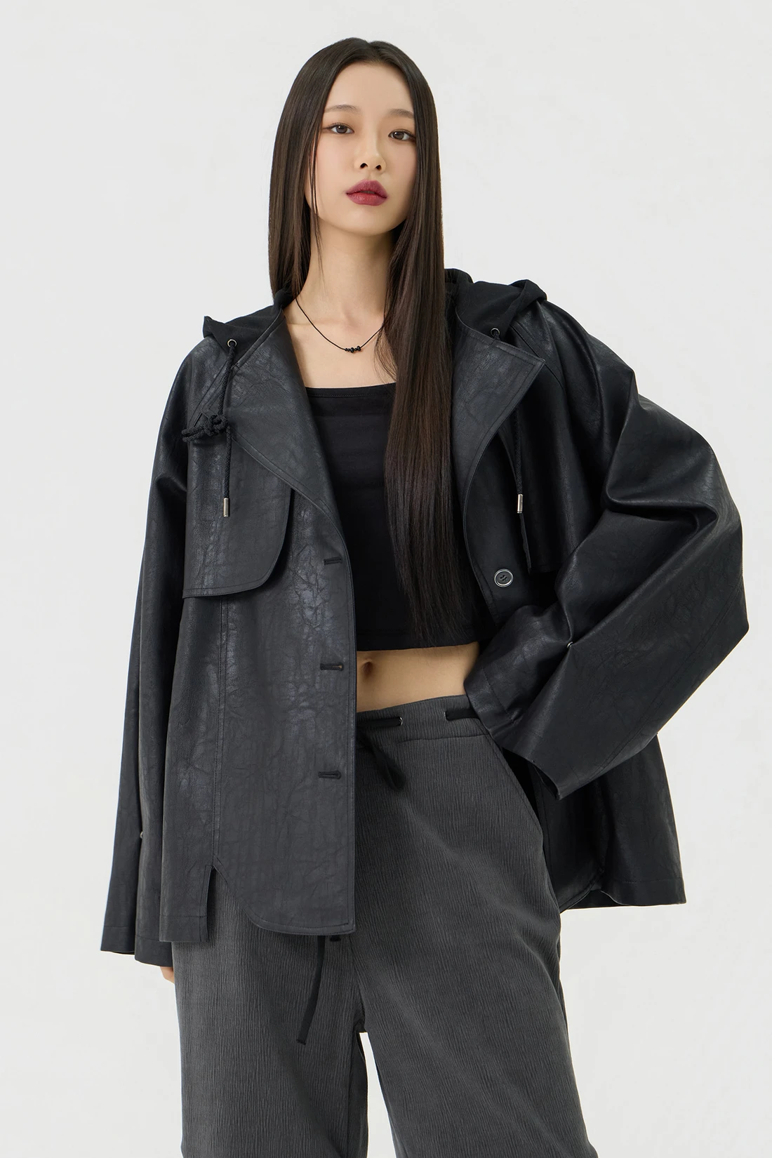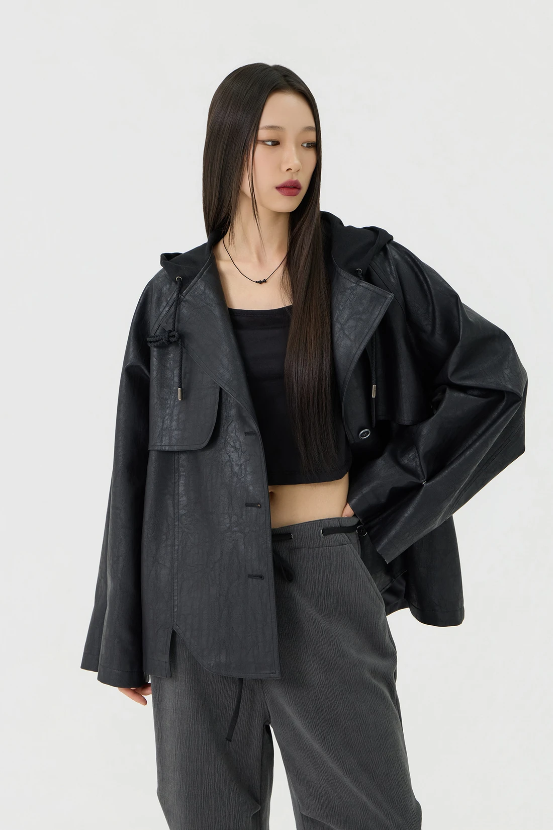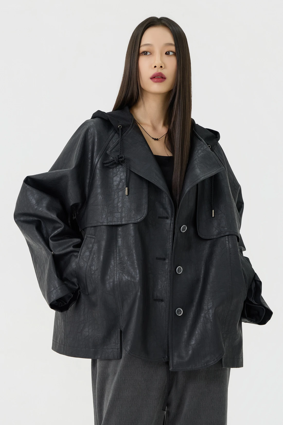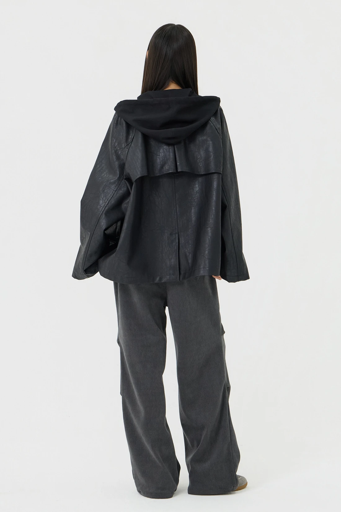 オーバーフィット トレンチ フーディーレザージャケット - Black