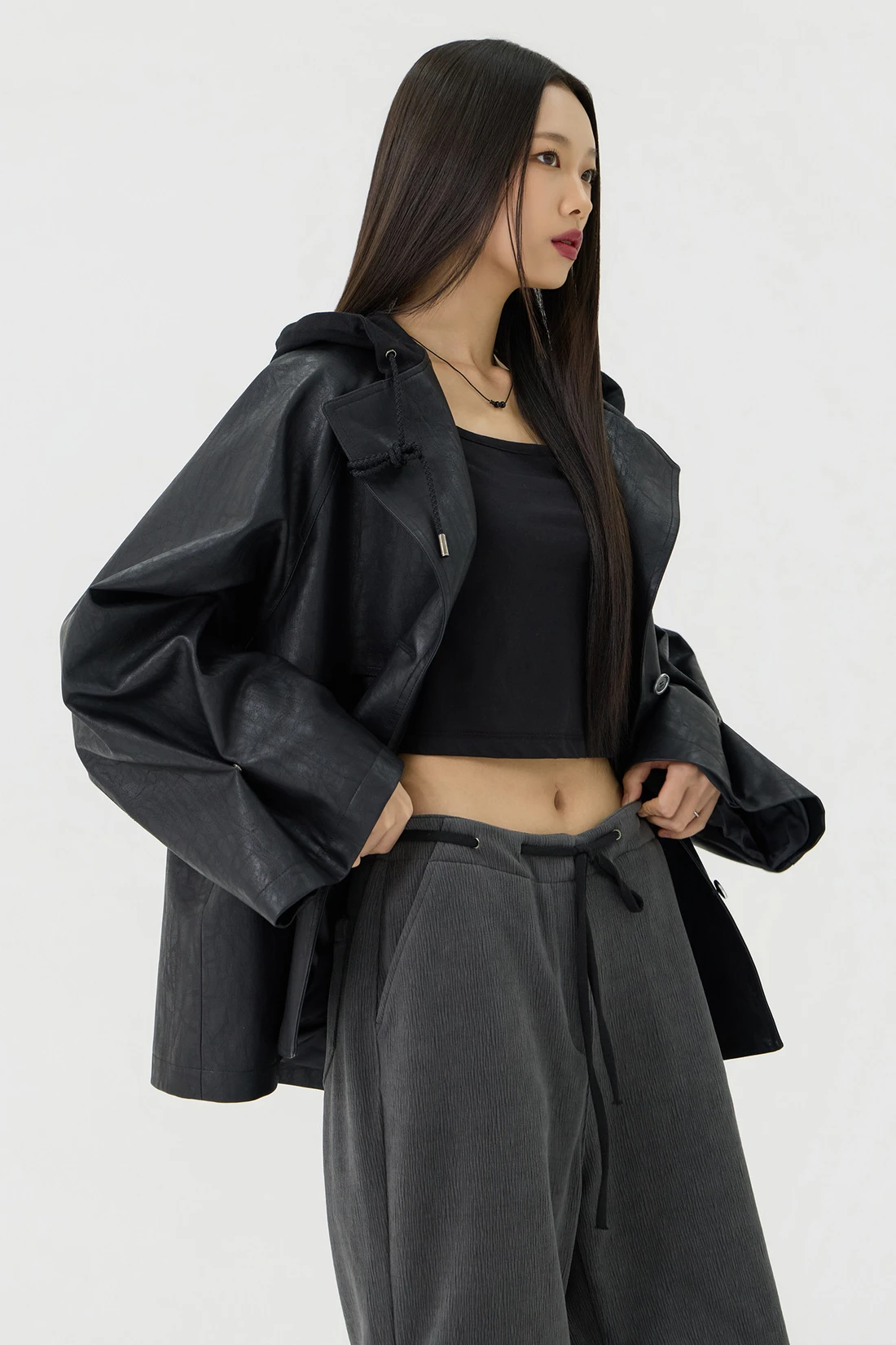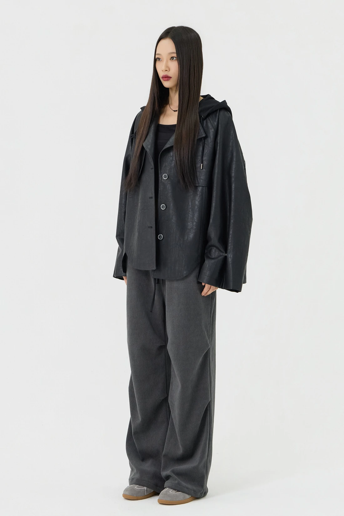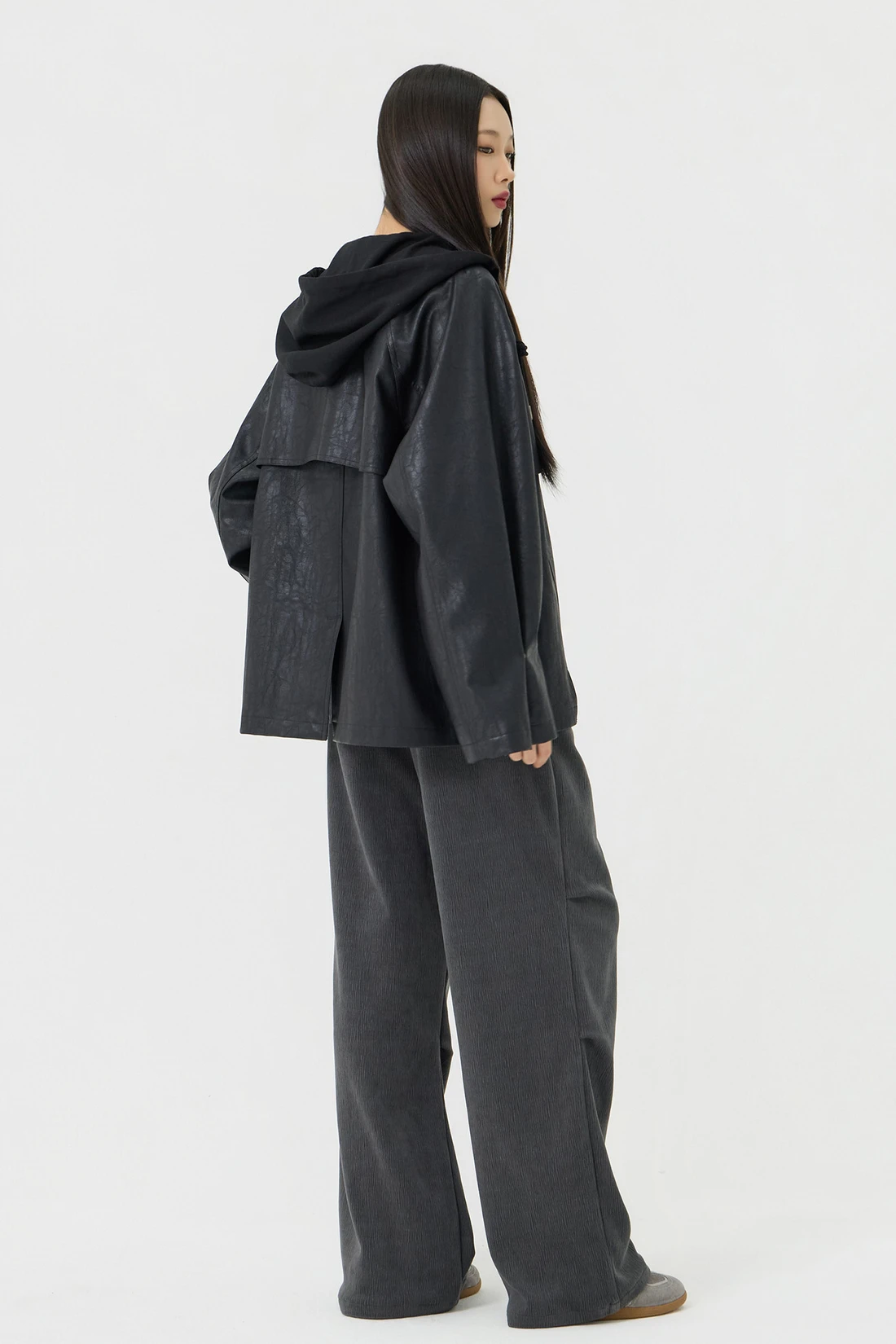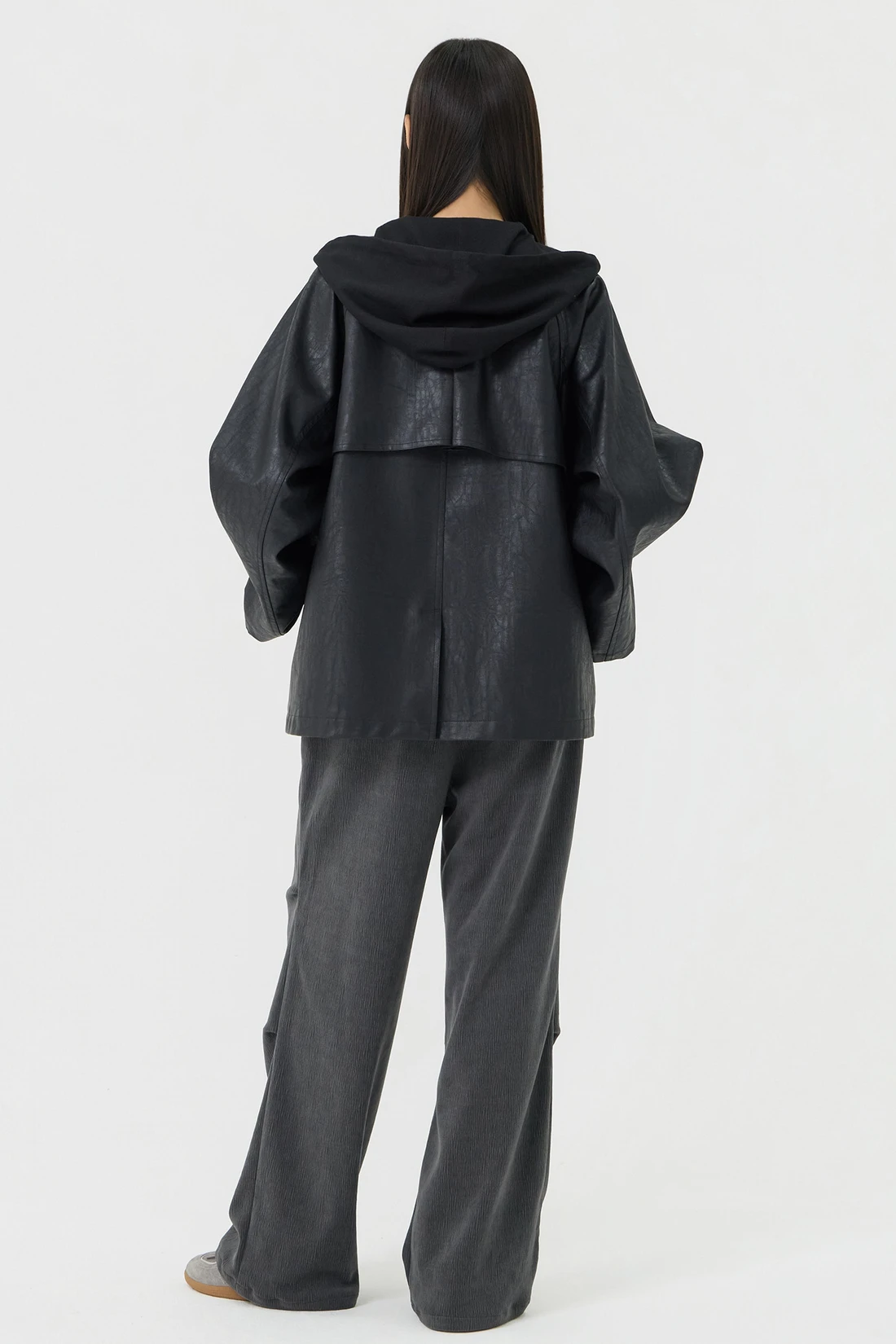 オーバーフィットシルエットのトレンチフーディーレザージャケット。フード一体型デザインとヨーク切り替えが動きやすさとデザイン性を高め、存在感のあるスタイルを演出します。デイリーウェアとしてはもちろん、アウターとのレイヤードにも活躍する万能アイテム。 素材:〈レザー部分〉ポリウレタン 50%、ポリエステル 35%、コットン 15% 〈フード部分〉ポリエステル 75%、レーヨン 22%、ポリウレタン 3% カラー:ブラック モデル:168cm/BUST 32/WAIST 26/ONEサイズ着用 サイズ(cm) ONE SIZE:着丈 67.5/バスト 62.5/裾幅 65.5/袖丈 74.5