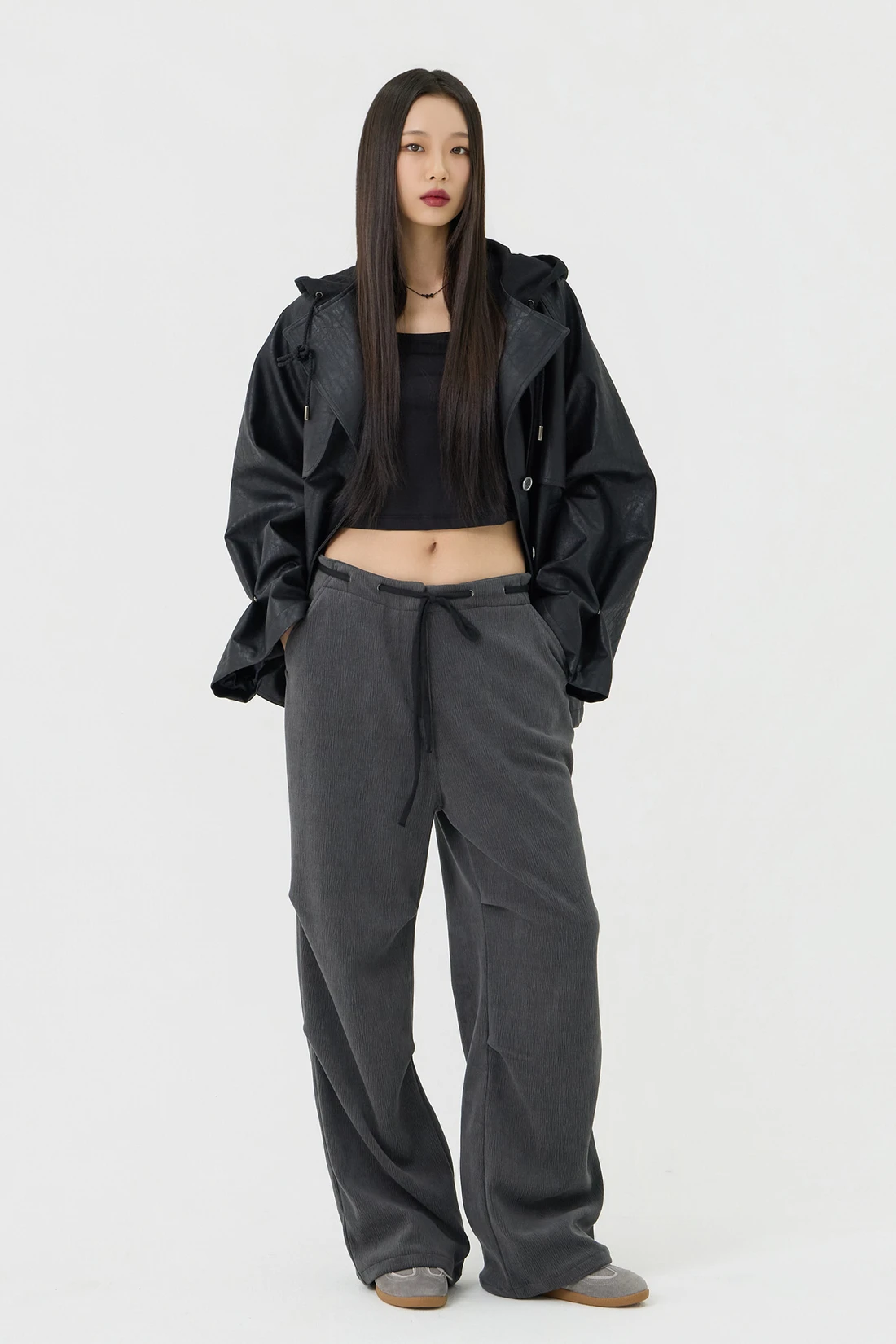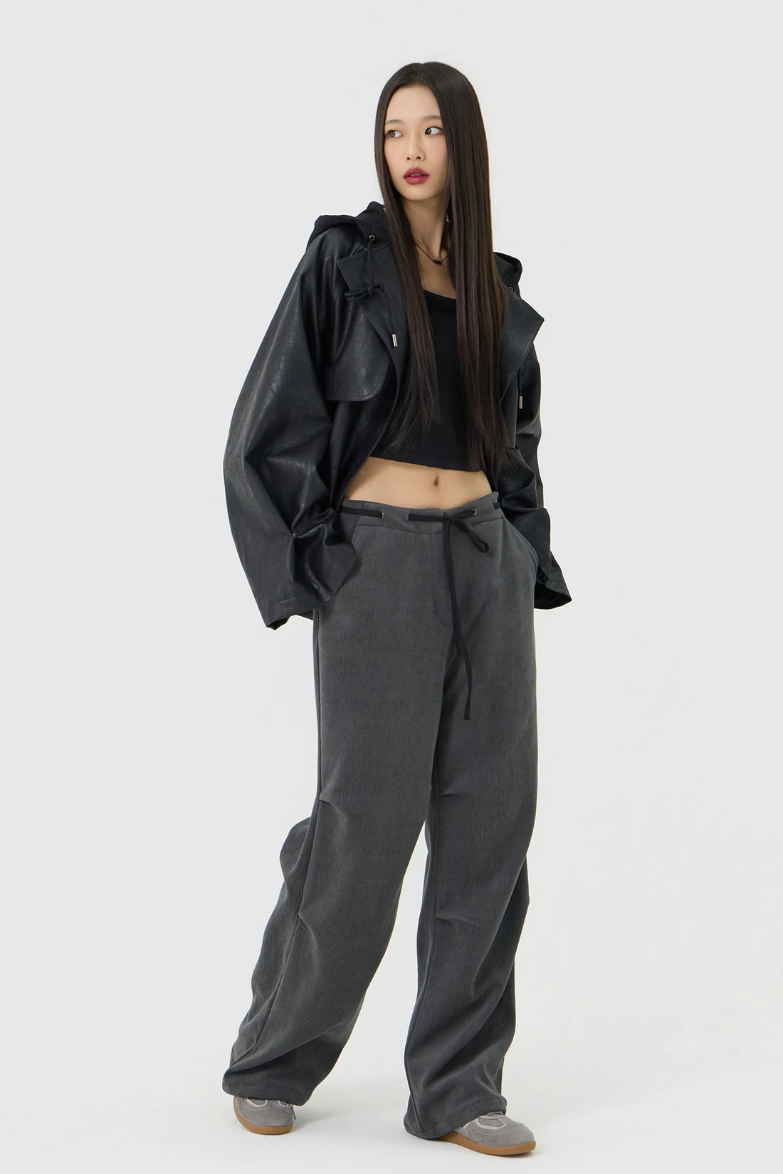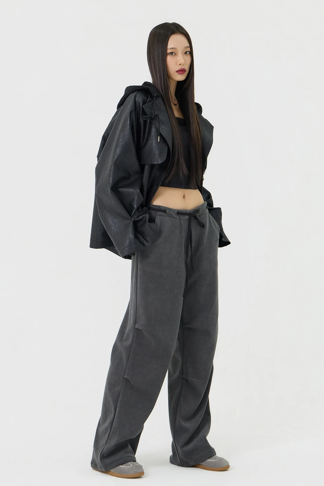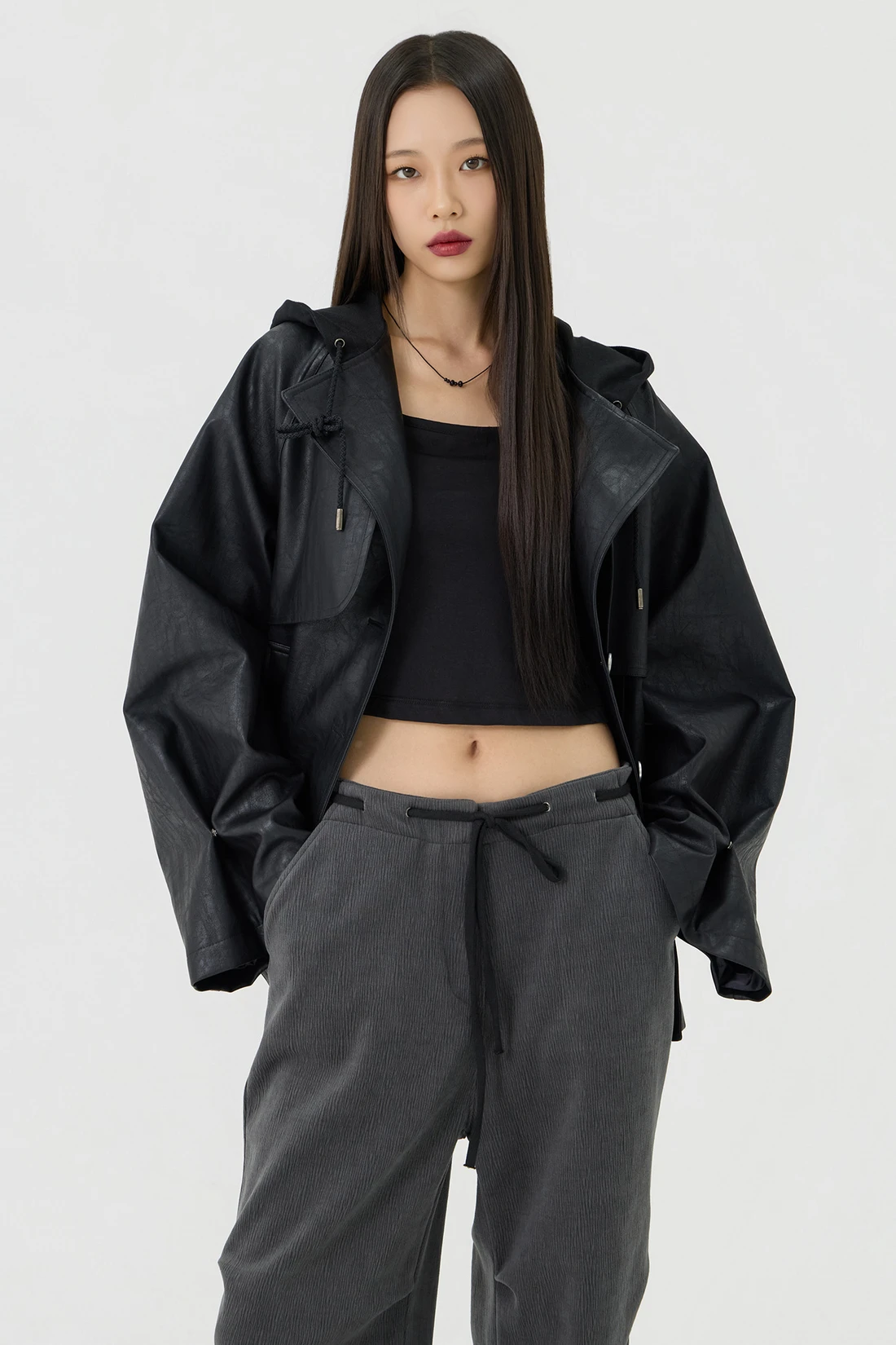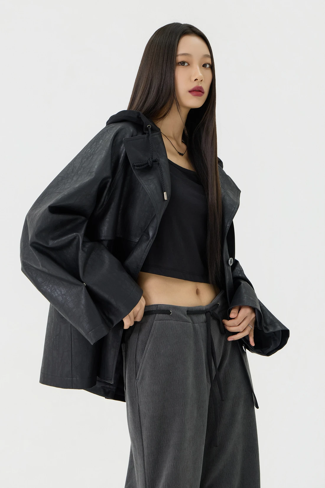 オーバーフィットシルエットのトレンチフーディーレザージャケット。フード一体型デザインとヨーク切り替えが動きやすさとデザイン性を高め、存在感のあるスタイルを演出します。デイリーウェアとしてはもちろん、アウターとのレイヤードにも活躍する万能アイテム。 素材:〈レザー部分〉ポリウレタン 50%、ポリエステル 35%、コットン 15% 〈フード部分〉ポリエステル 75%、レーヨン 22%、ポリウレタン 3% カラー:ブラック モデル:168cm/BUST 32/WAIST 26/ONEサイズ着用 サイズ(cm) ONE SIZE:着丈 67.5/バスト 62.5/裾幅 65.5/袖丈 74.5