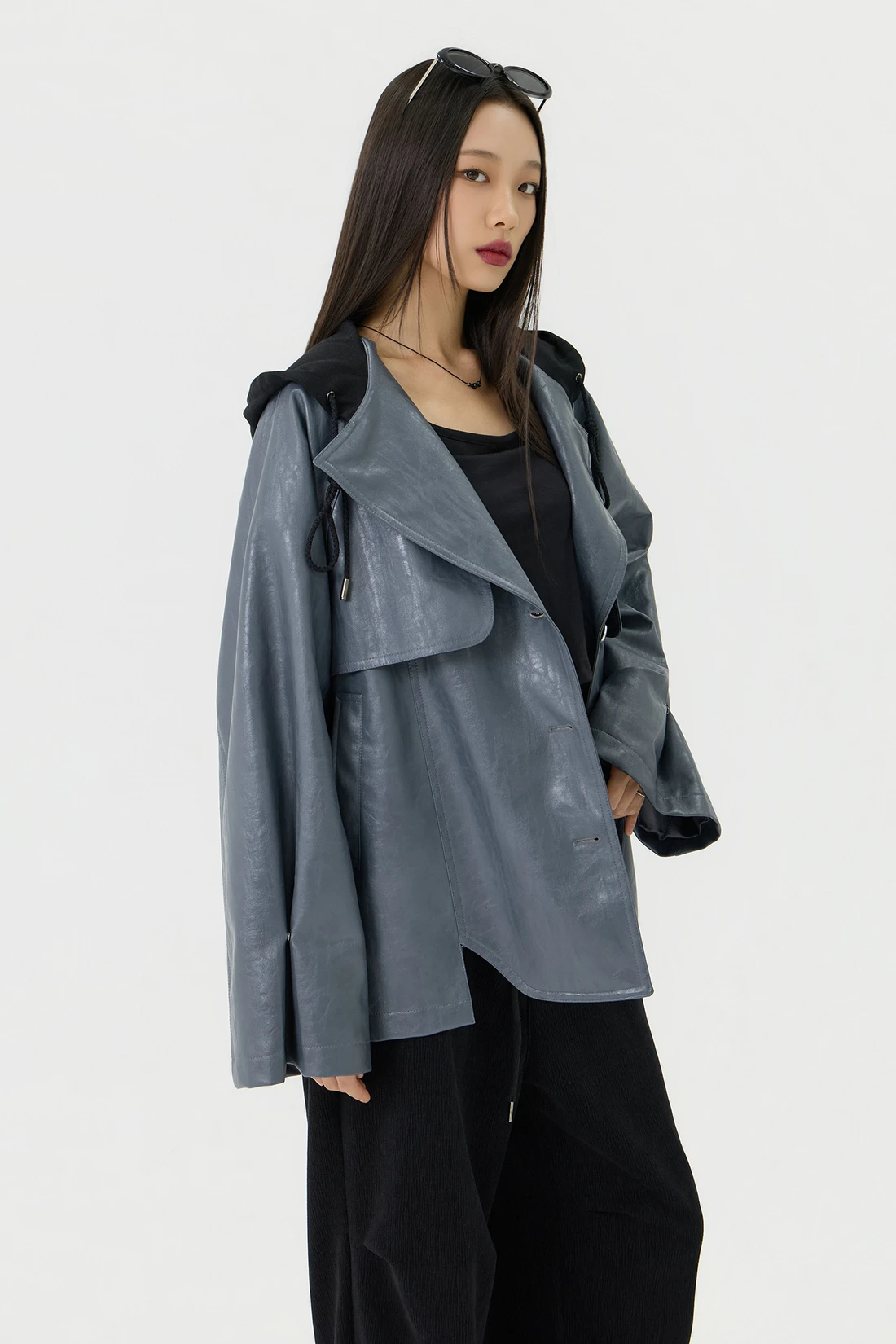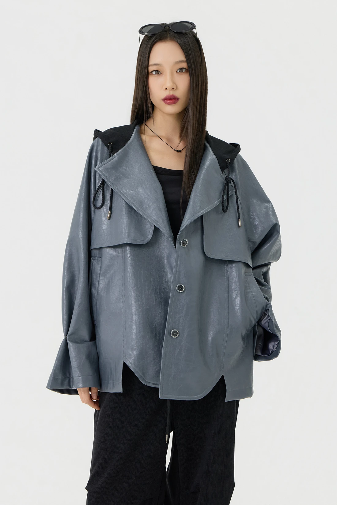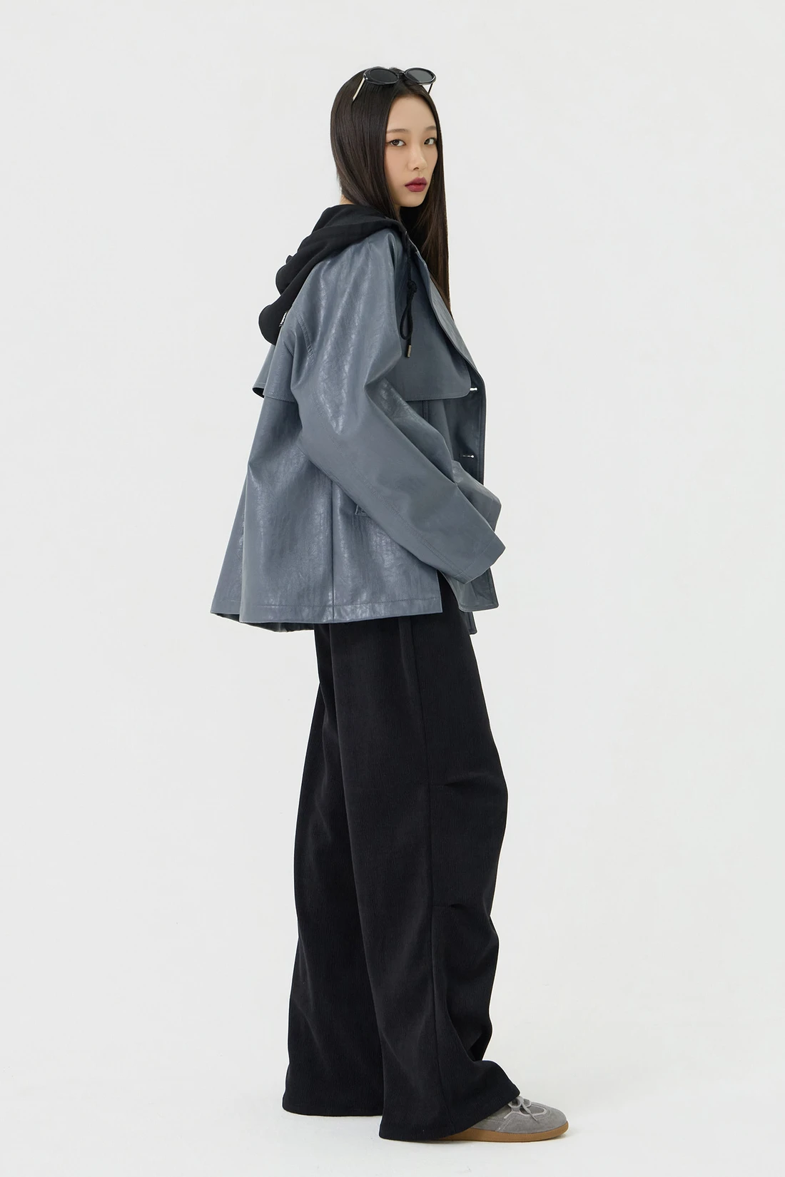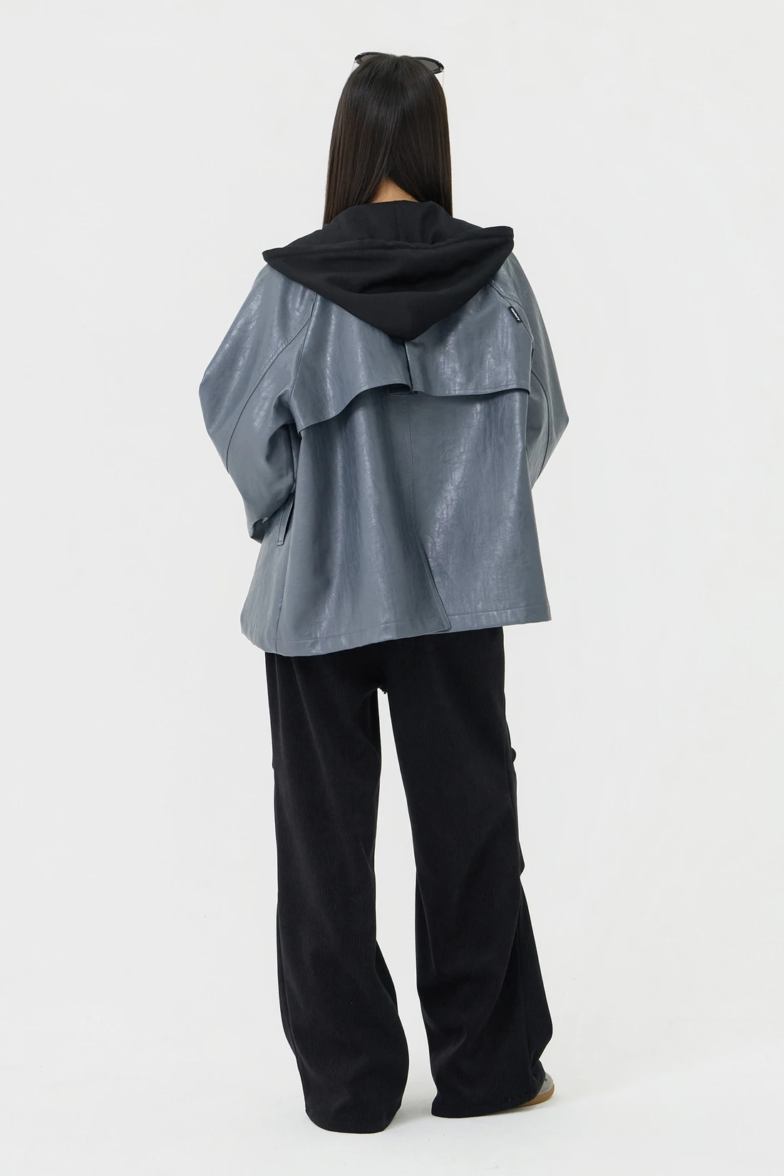 オーバーフィットシルエットのトレンチフーディーレザージャケット。フード一体型デザインとヨーク切り替えが動きやすさとデザイン性を高め、存在感のあるスタイルを演出します。デイリーウェアとしてはもちろん、アウターとのレイヤードにも活躍する万能アイテム。 素材:〈レザー部分〉ポリウレタン 50%、ポリエステル 35%、コットン 15% 〈フード部分〉ポリエステル 75%、レーヨン 22%、ポリウレタン 3% カラー:グレー モデル:168cm/BUST 32/WAIST 26/ONEサイズ着用 サイズ(cm) ONE SIZE:着丈 67.5/バスト 62.5/裾幅 65.5/袖丈 74.5