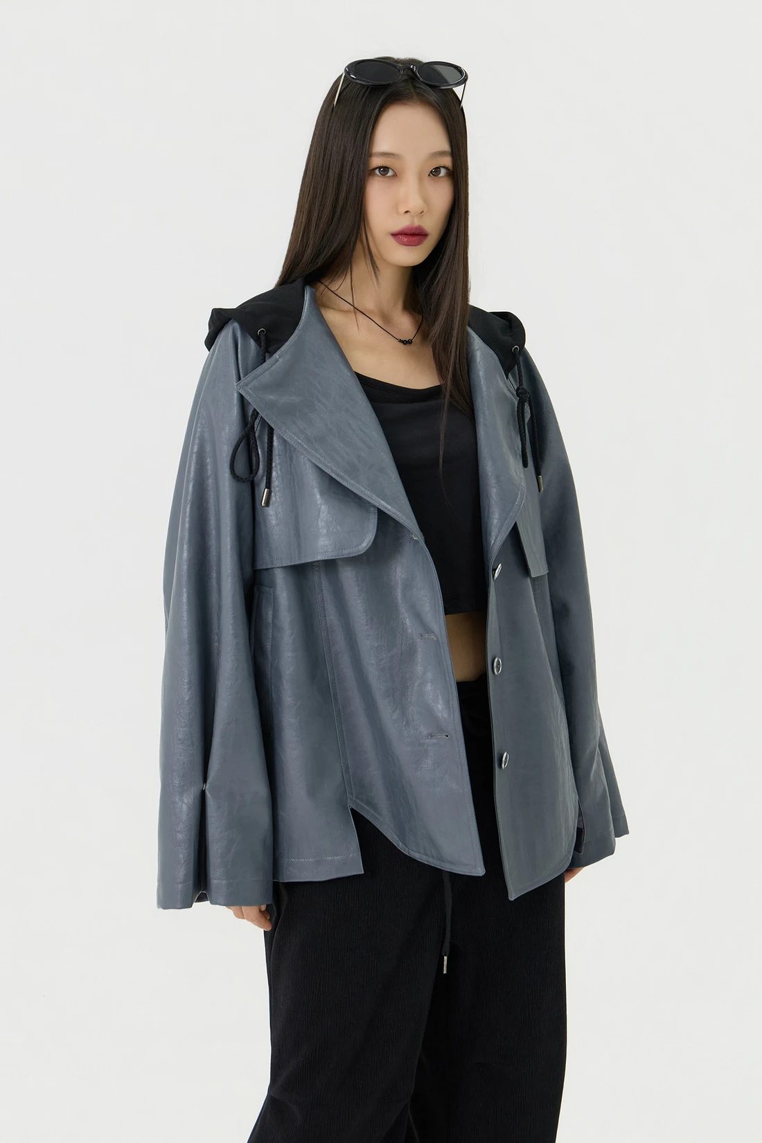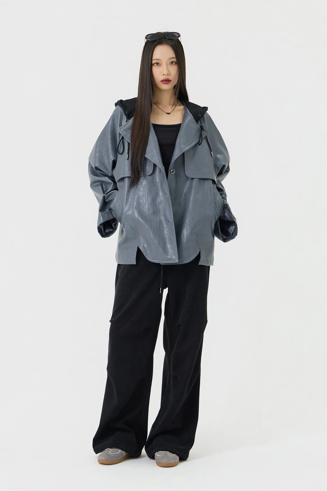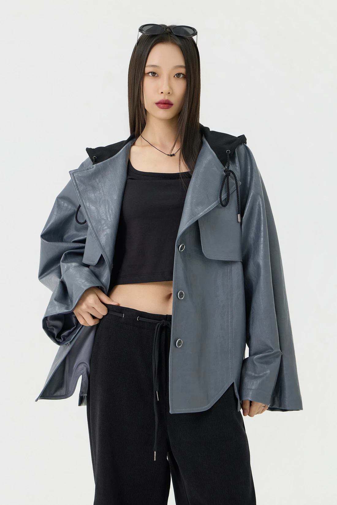 オーバーフィットシルエットのトレンチフーディーレザージャケット。フード一体型デザインとヨーク切り替えが動きやすさとデザイン性を高め、存在感のあるスタイルを演出します。デイリーウェアとしてはもちろん、アウターとのレイヤードにも活躍する万能アイテム。 素材:〈レザー部分〉ポリウレタン 50%、ポリエステル 35%、コットン 15% 〈フード部分〉ポリエステル 75%、レーヨン 22%、ポリウレタン 3% カラー:グレー モデル:168cm/BUST 32/WAIST 26/ONEサイズ着用 サイズ(cm) ONE SIZE:着丈 67.5/バスト 62.5/裾幅 65.5/袖丈 74.5