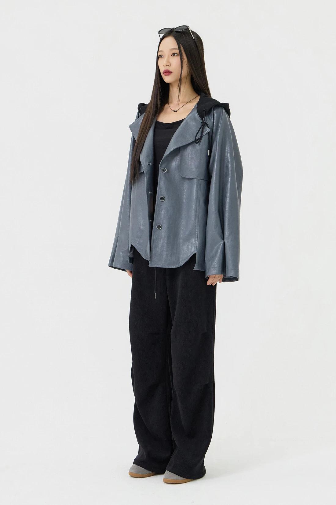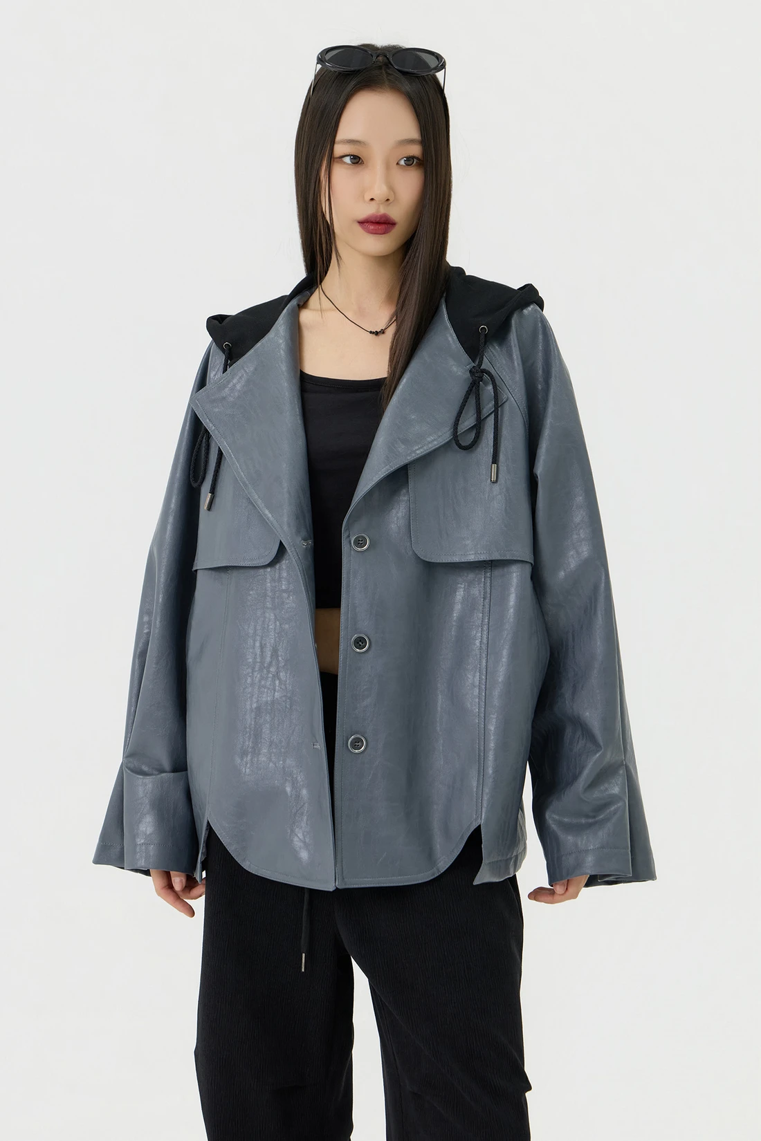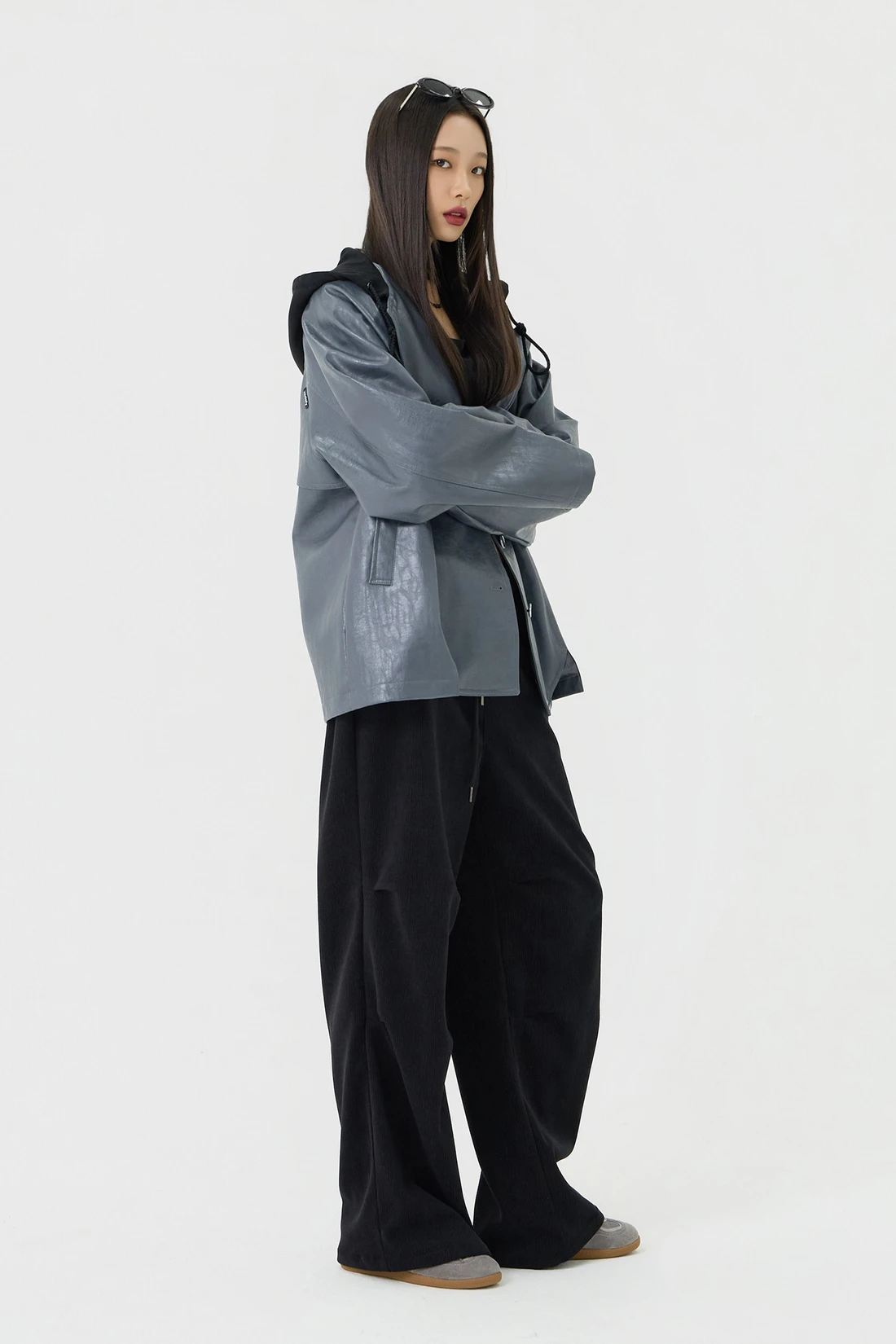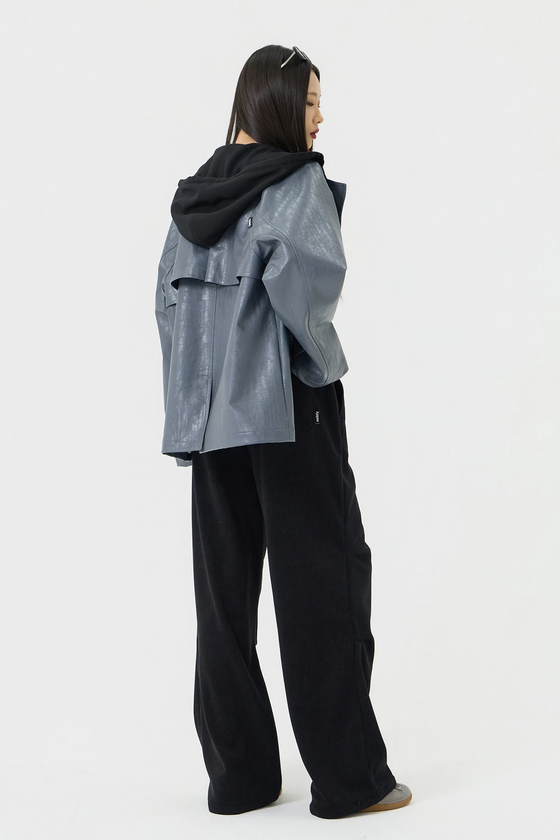 オーバーフィットシルエットのトレンチフーディーレザージャケット。フード一体型デザインとヨーク切り替えが動きやすさとデザイン性を高め、存在感のあるスタイルを演出します。デイリーウェアとしてはもちろん、アウターとのレイヤードにも活躍する万能アイテム。 素材:〈レザー部分〉ポリウレタン 50%、ポリエステル 35%、コットン 15% 〈フード部分〉ポリエステル 75%、レーヨン 22%、ポリウレタン 3% カラー:グレー モデル:168cm/BUST 32/WAIST 26/ONEサイズ着用 サイズ(cm) ONE SIZE:着丈 67.5/バスト 62.5/裾幅 65.5/袖丈 74.5