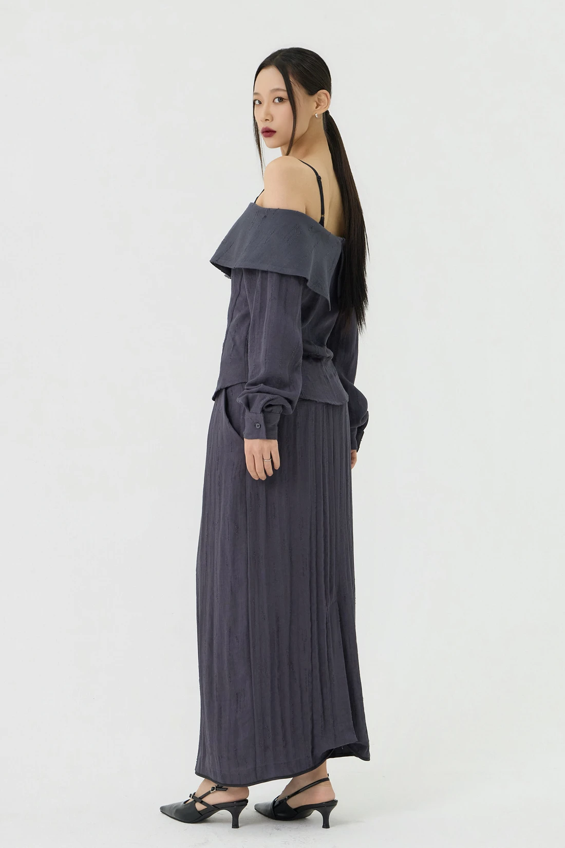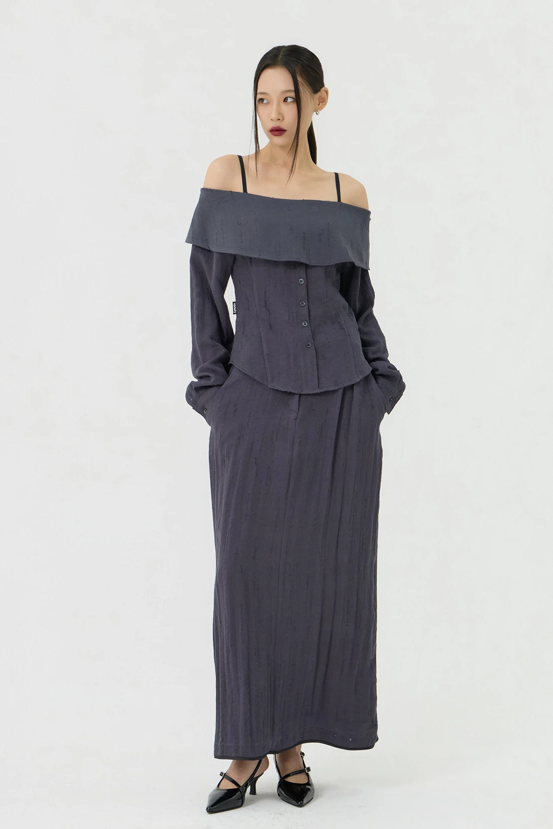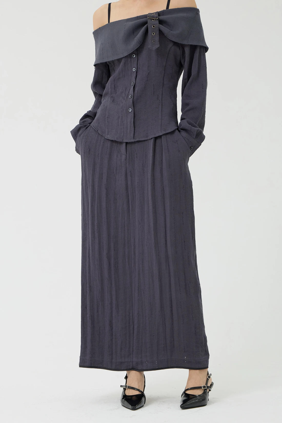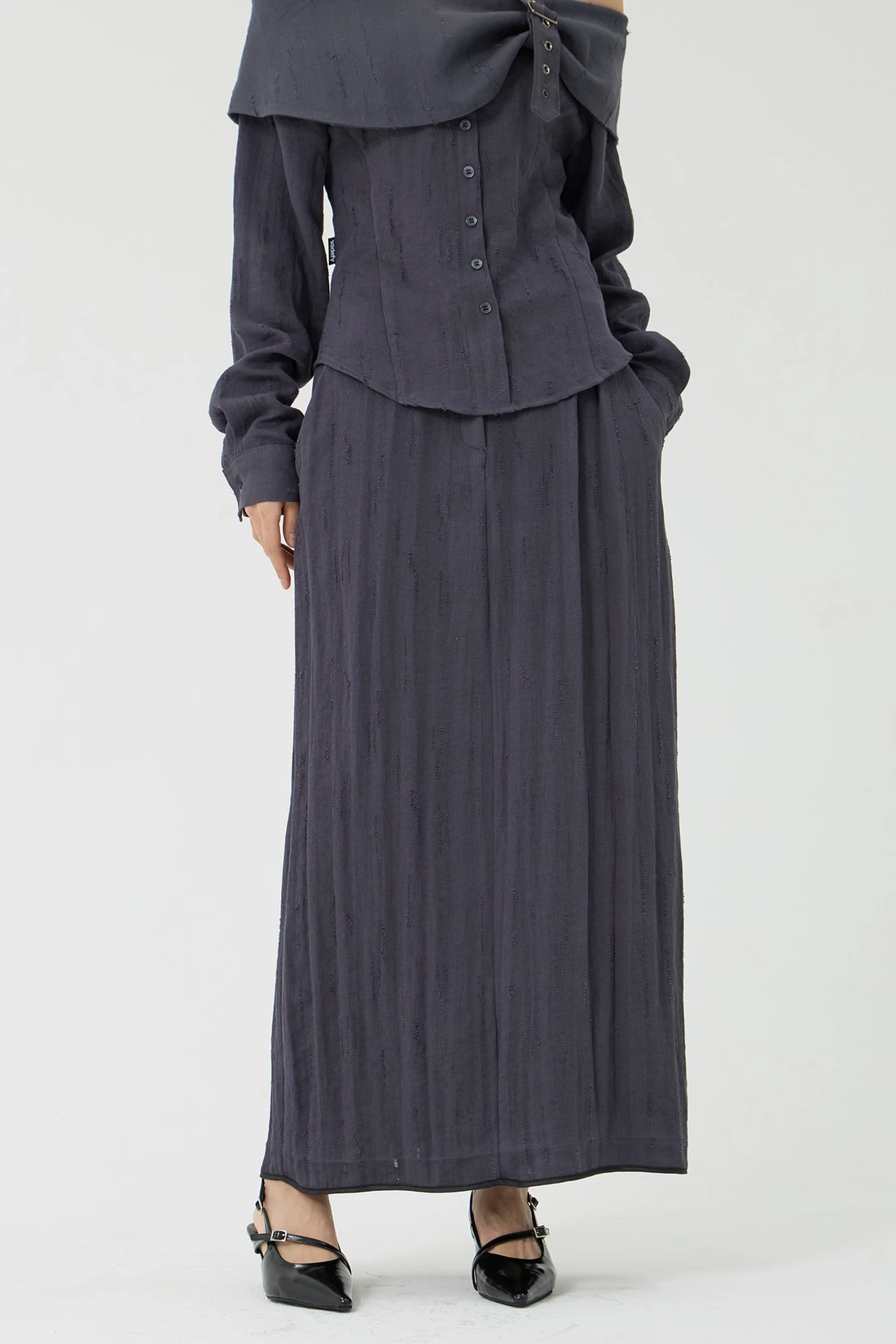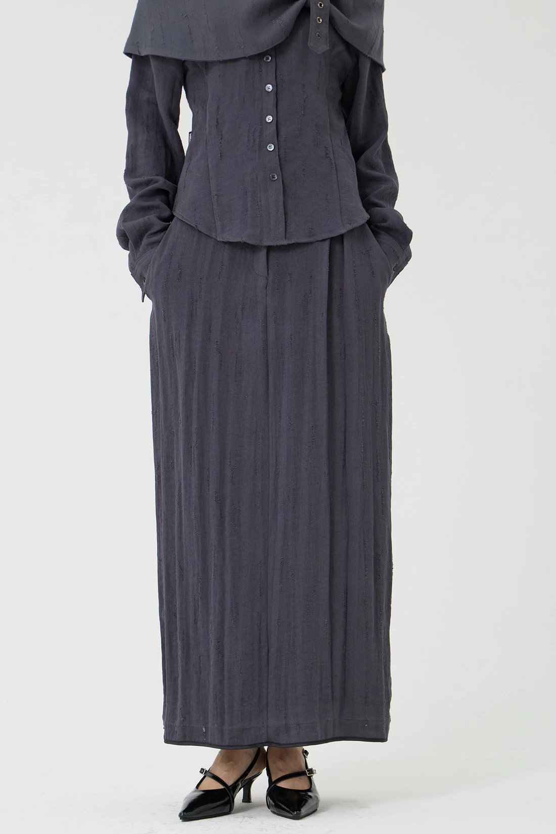 繊細なスクラッチテクスチャーが際立つロングスカート。ウエストのストリングディテールとフレアラインが、自然に体型をカバーしながら美しいシルエットを演出します。サイドポケットを施し、実用性とデザイン性を両立。同素材のトップスとセットアップで着用すれば、モダンでフェミニンなムードが完成します。 素材:レーヨン 80%、ナイロン 20% カラー:チャコール モデル:168cm/BUST 32/WAIST 26/ONEサイズ着用 サイズ(cm) ONE SIZE:総丈 88/ウエスト 37/ヒップ 47.5/裾幅 51.5