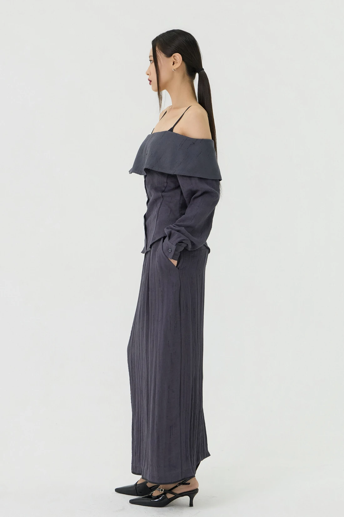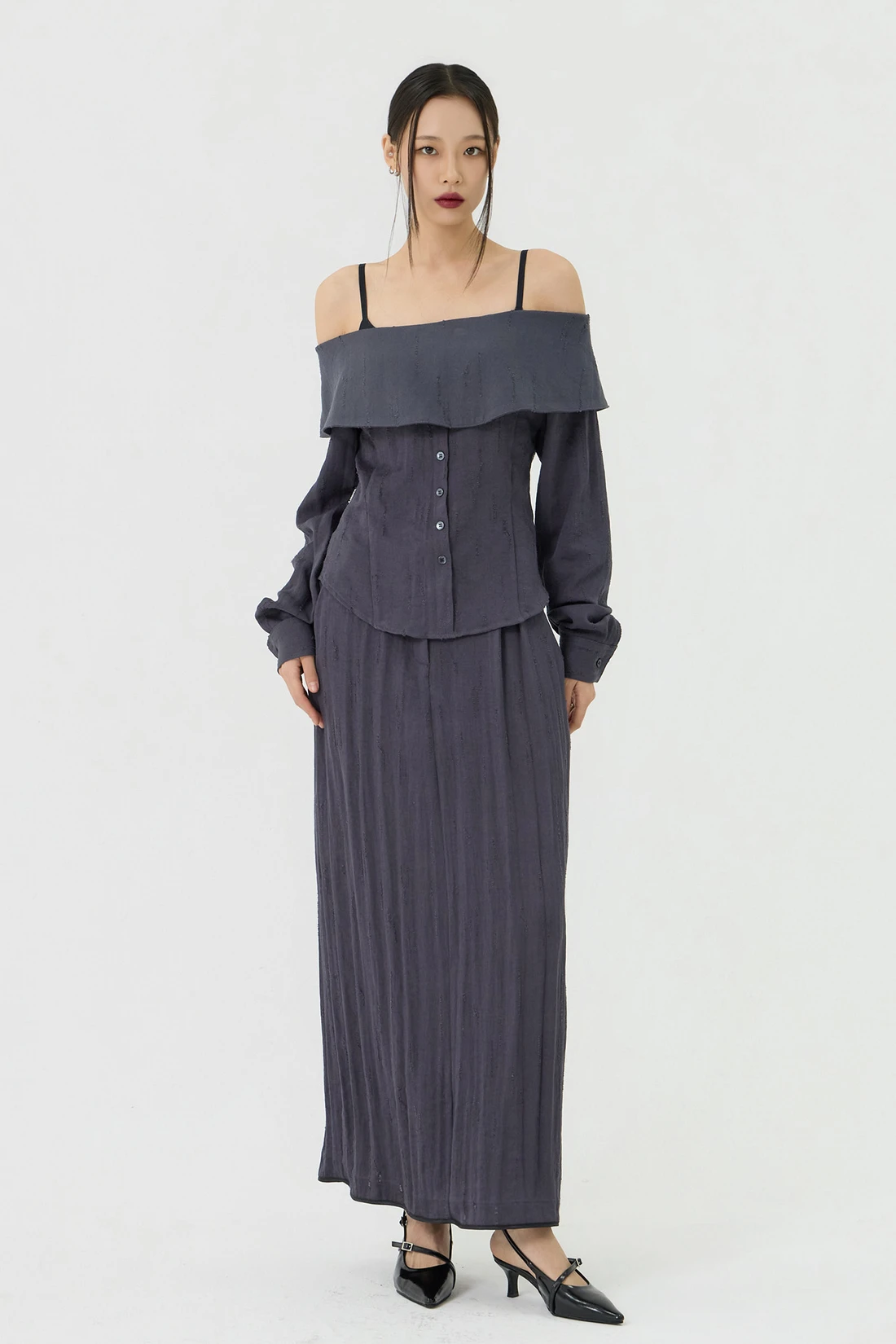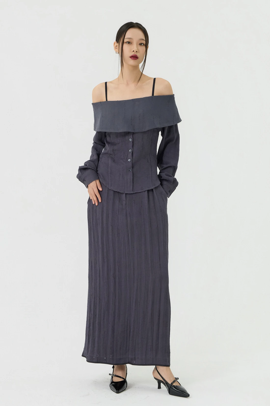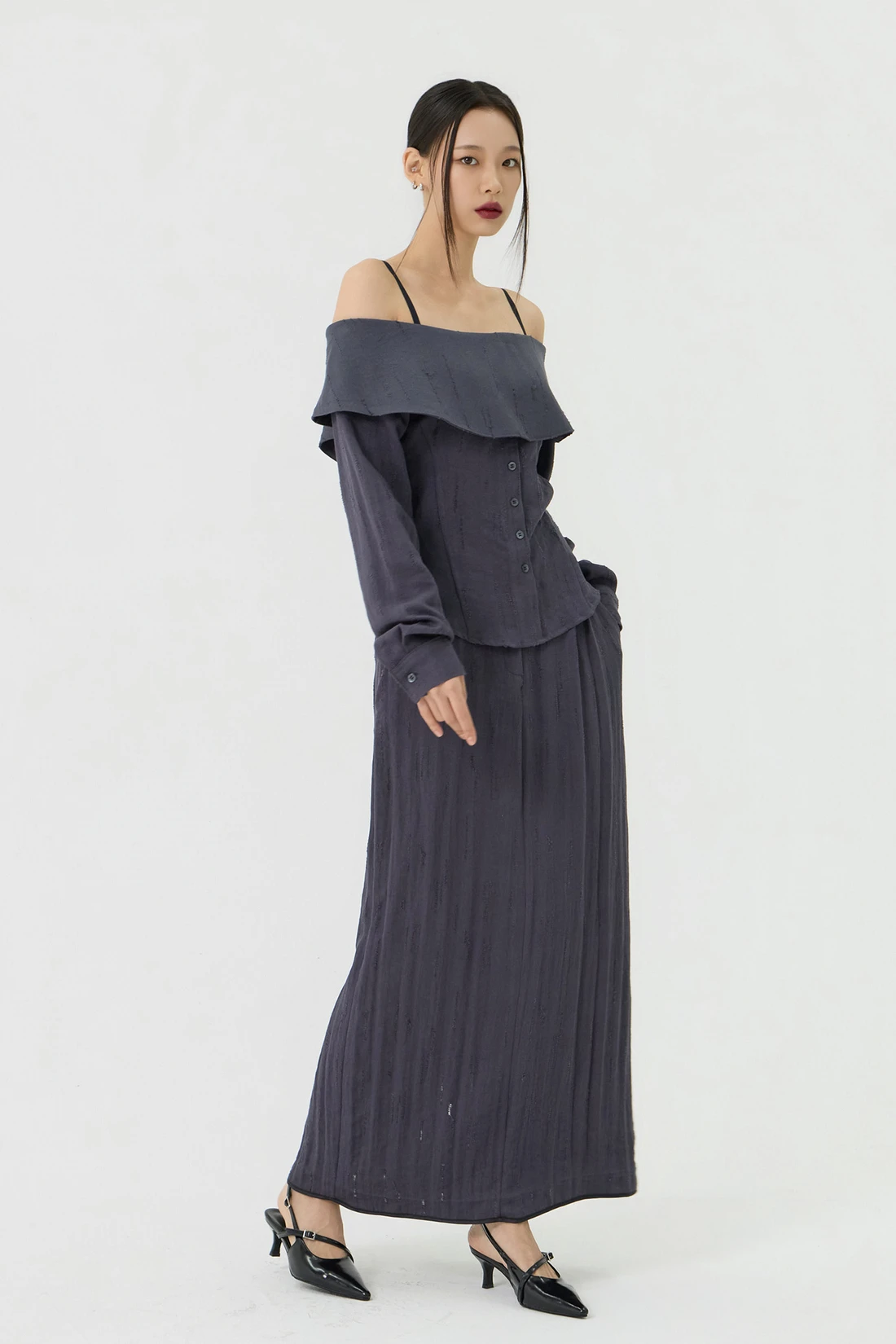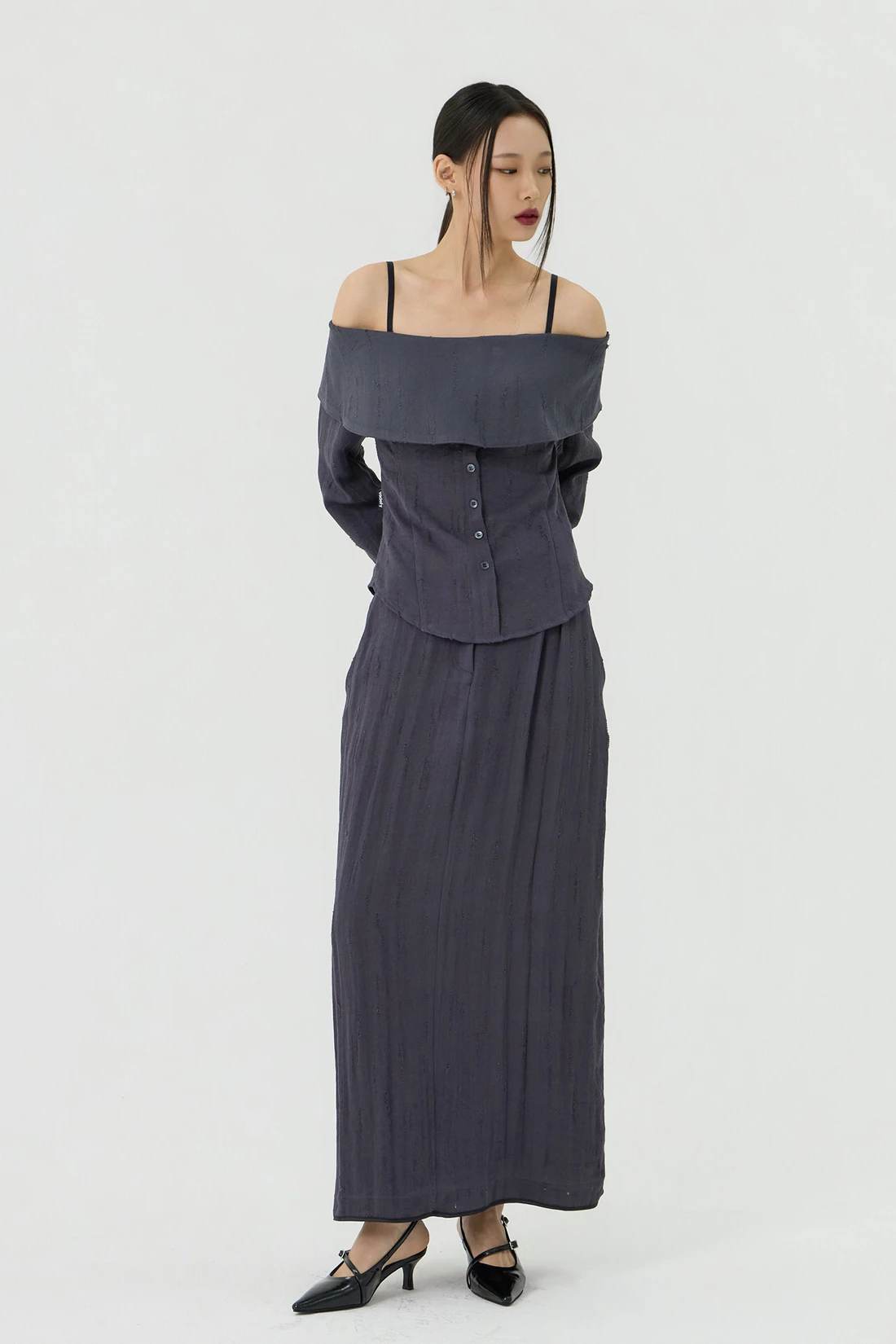 繊細なスクラッチテクスチャーが際立つロングスカート。ウエストのストリングディテールとフレアラインが、自然に体型をカバーしながら美しいシルエットを演出します。サイドポケットを施し、実用性とデザイン性を両立。同素材のトップスとセットアップで着用すれば、モダンでフェミニンなムードが完成します。 素材:レーヨン 80%、ナイロン 20% カラー:チャコール モデル:168cm/BUST 32/WAIST 26/ONEサイズ着用 サイズ(cm) ONE SIZE:総丈 88/ウエスト 37/ヒップ 47.5/裾幅 51.5