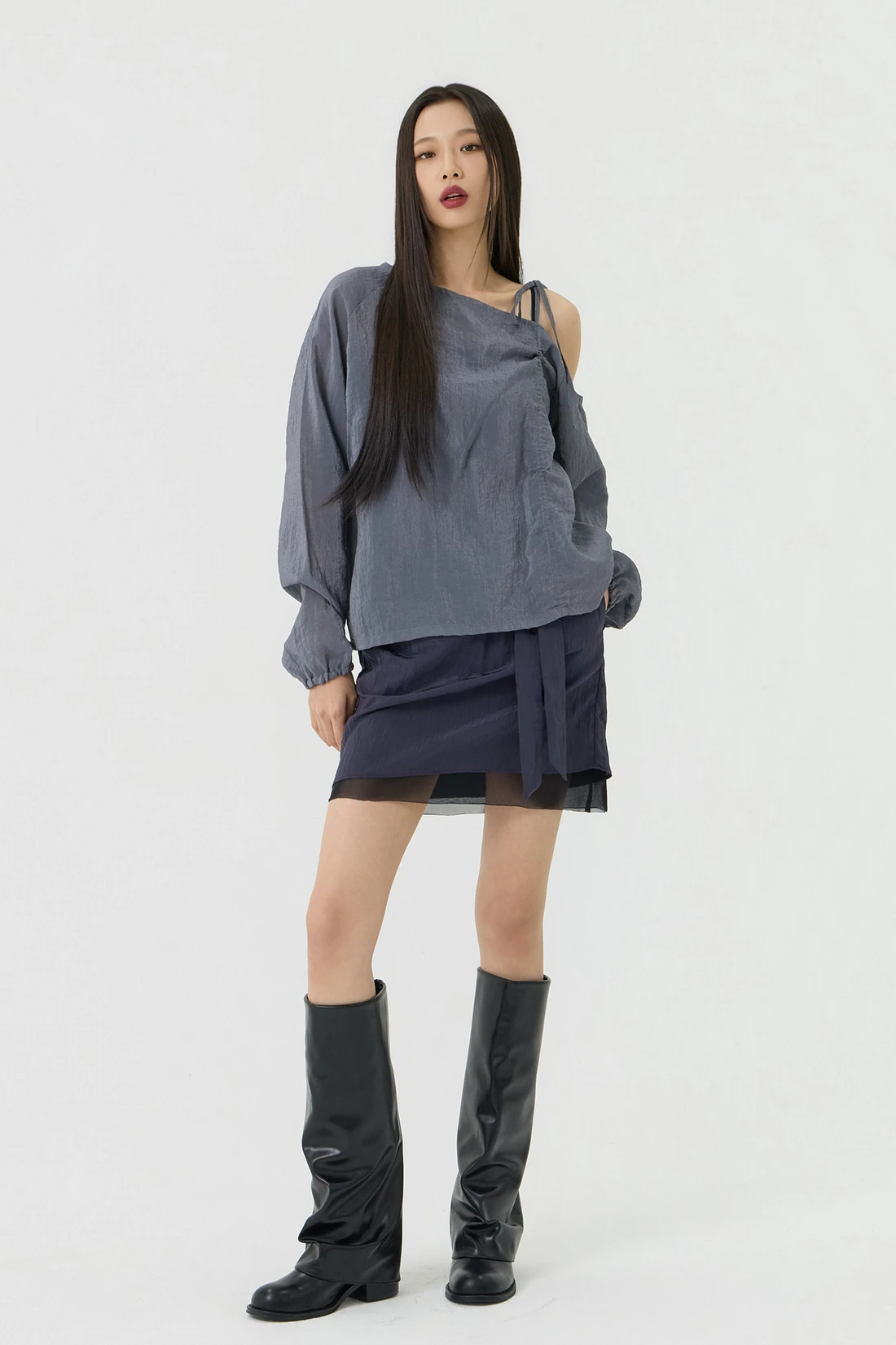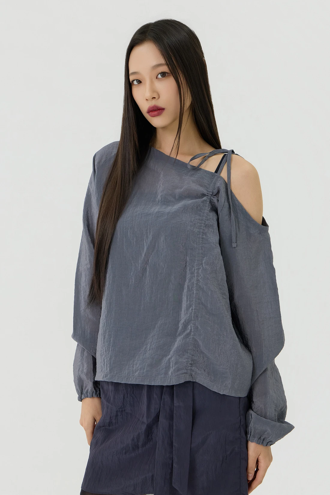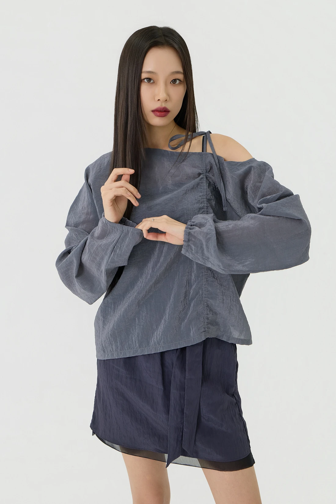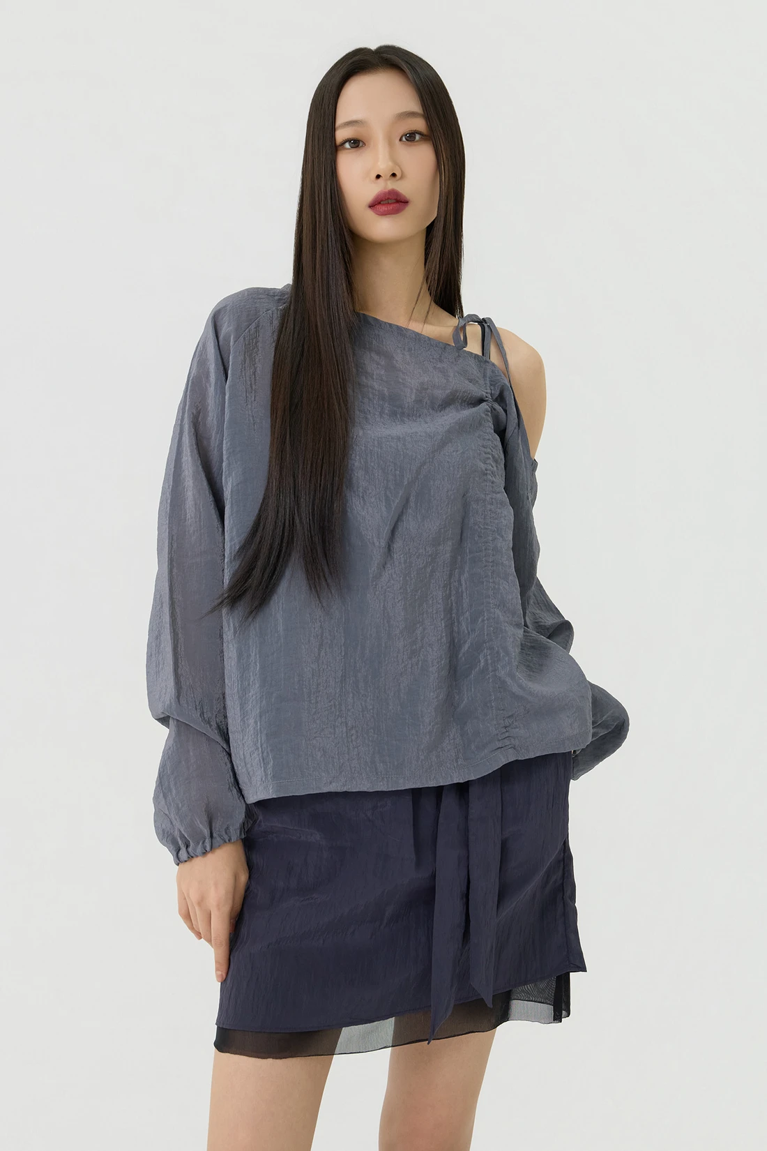 ワンショルダー ブラン リボンシャーリングディテール トップス - Charcoal