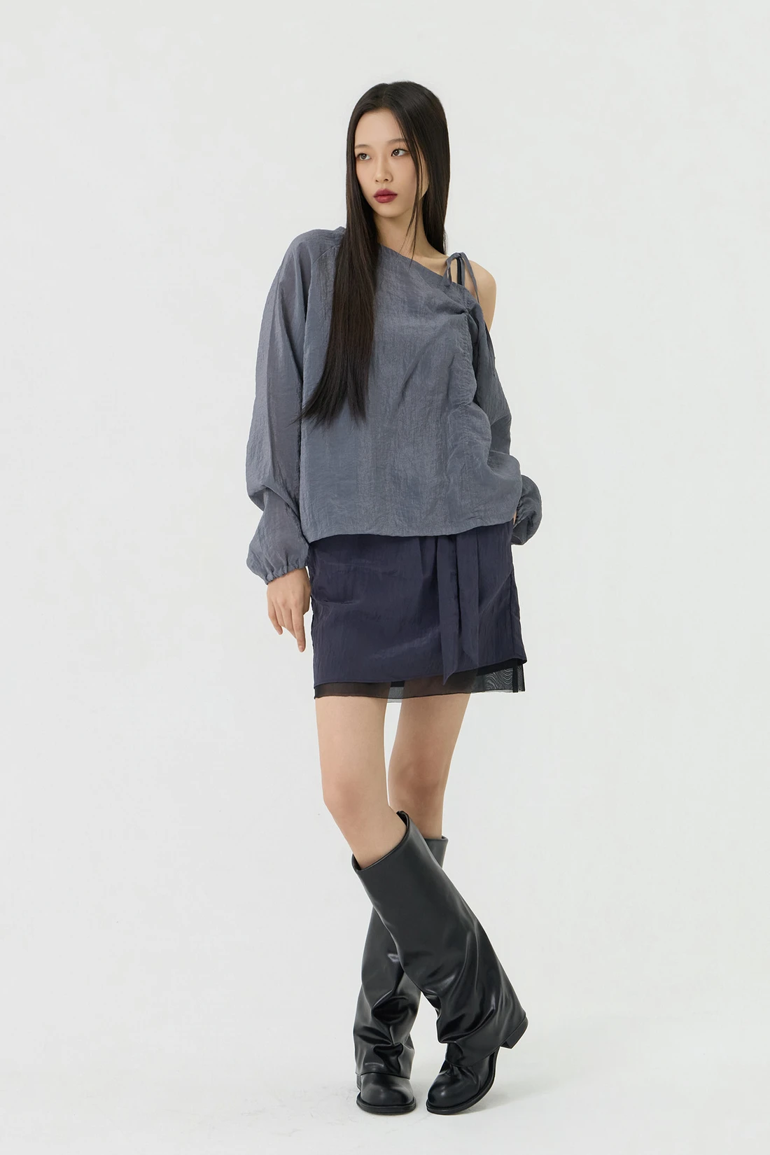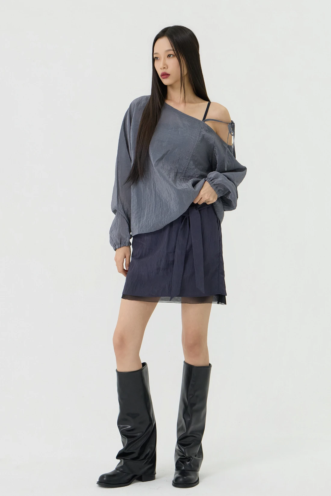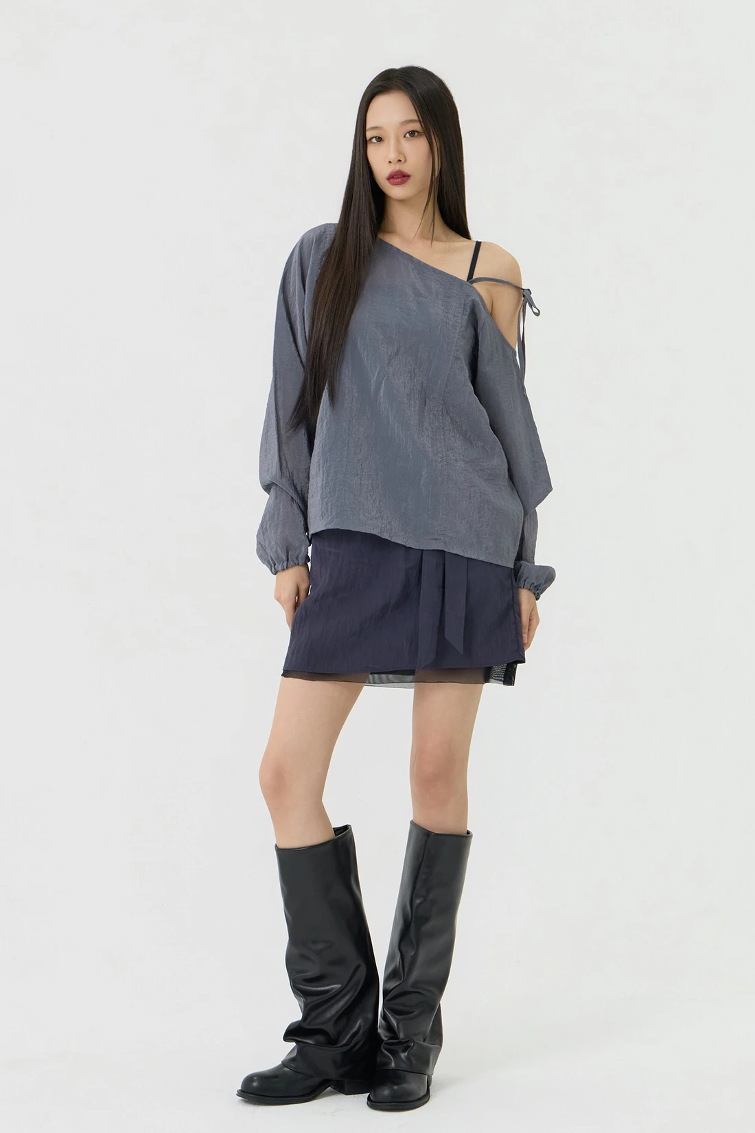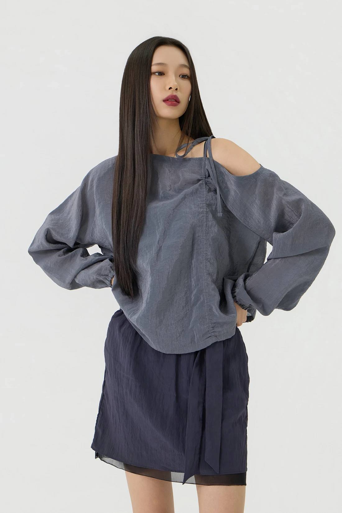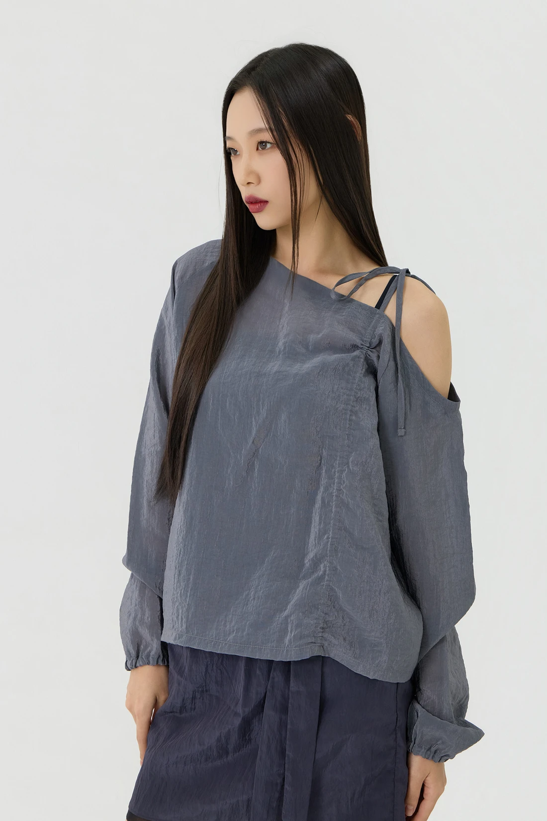ワンショルダー ブラン リボンシャーリングディテール トップス - Charcoal