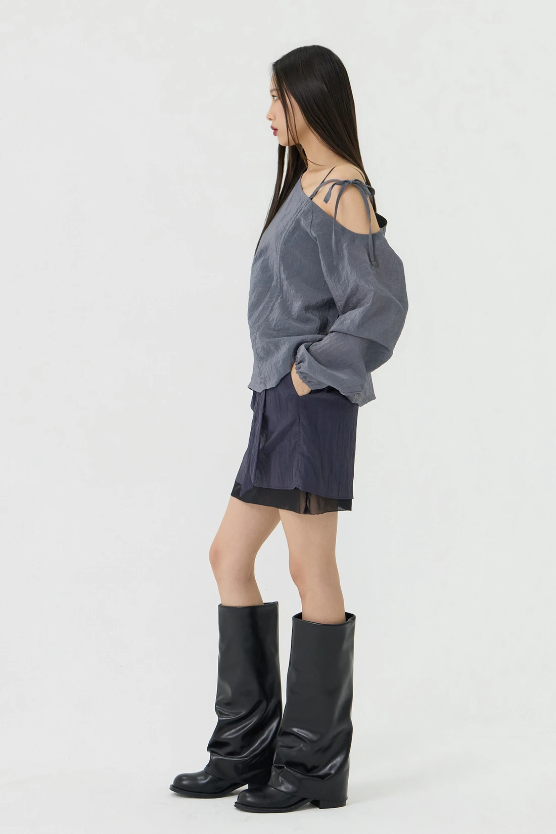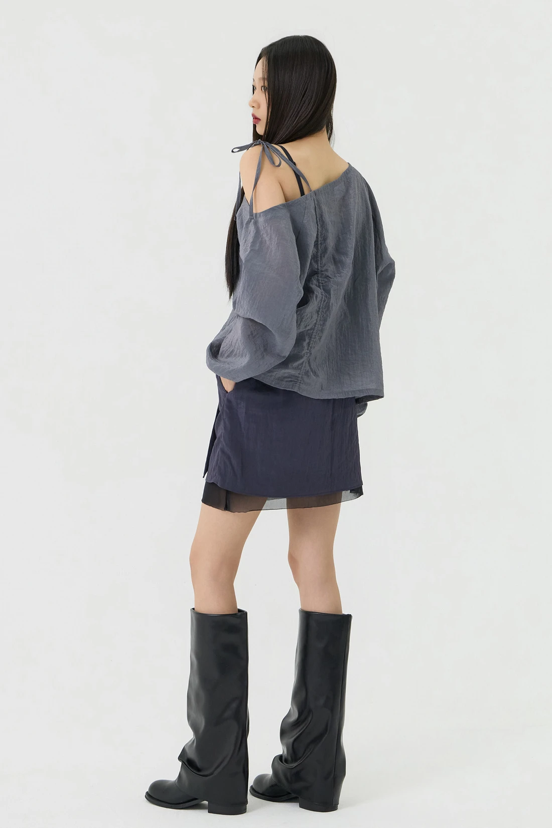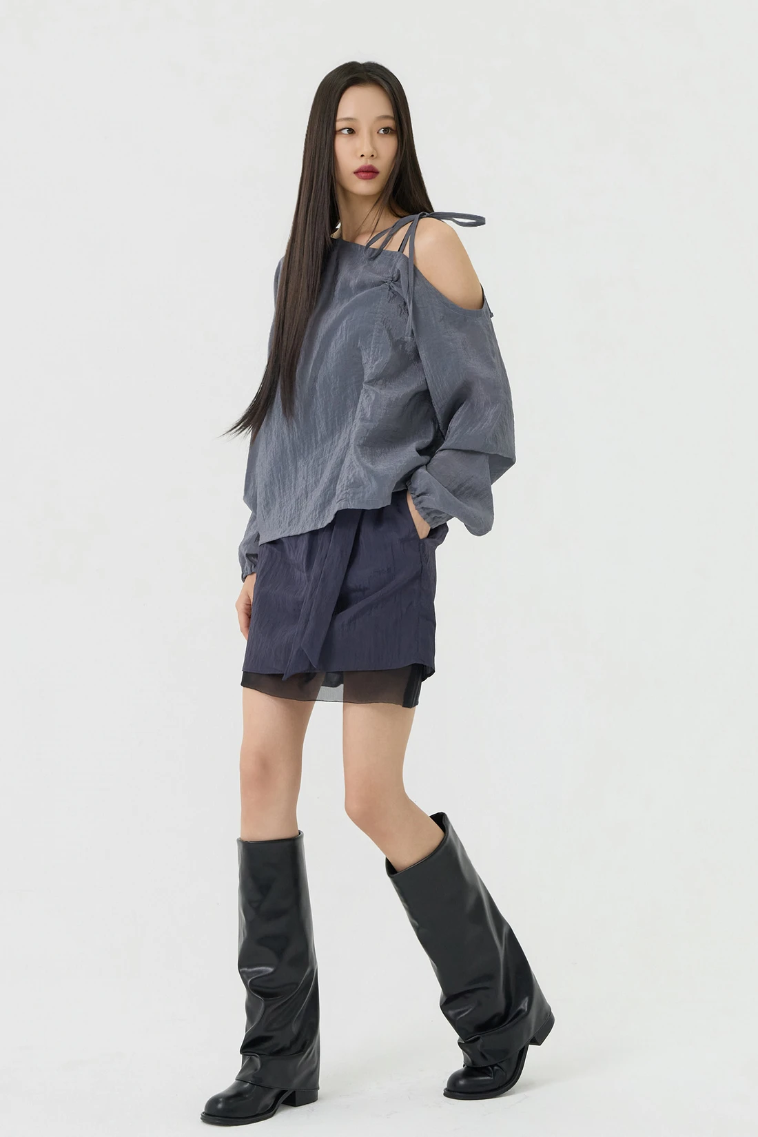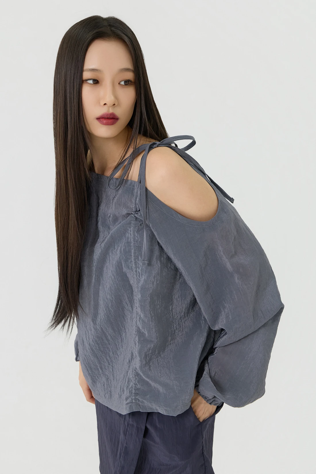 ワンショルダー ブラン リボンシャーリングディテール トップス - Charcoal