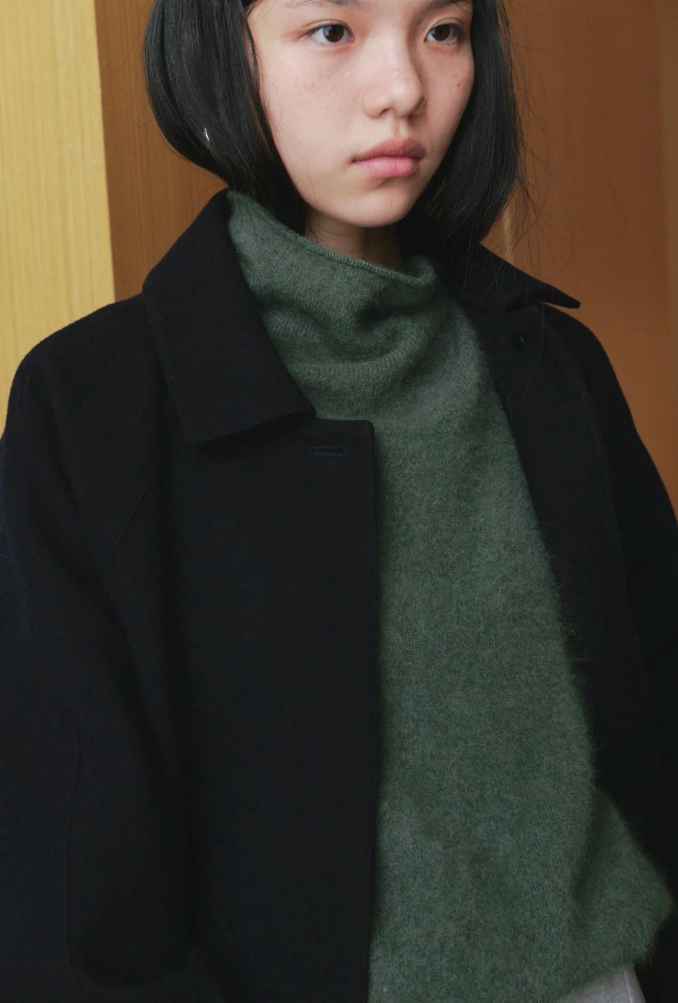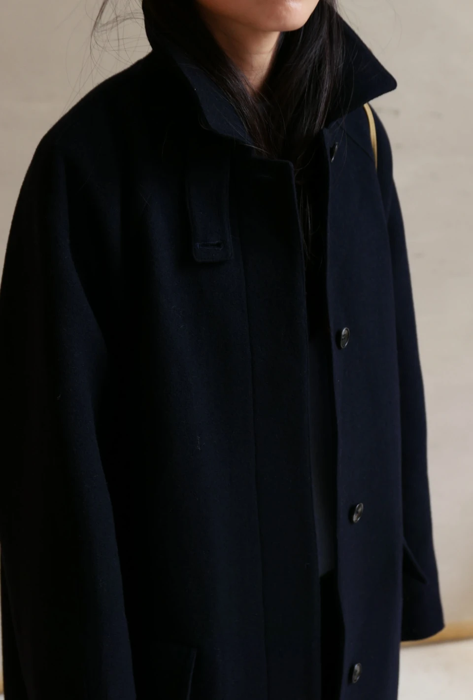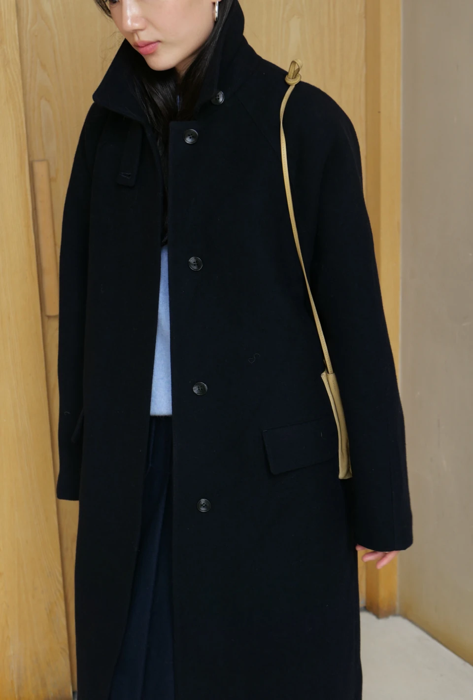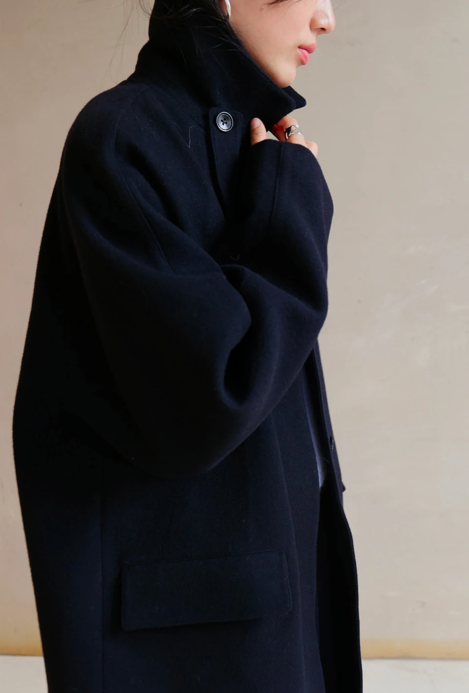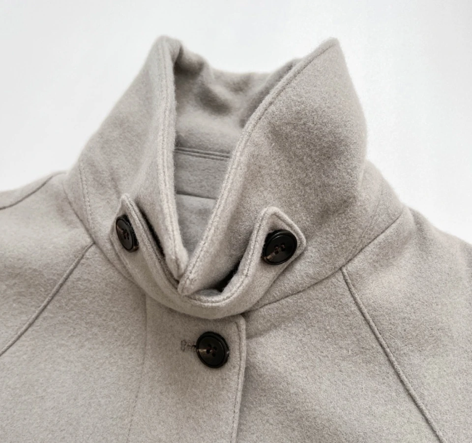 ボタンで閉じるハイネックデザインが、保温性と立体的なシルエットをプラスするディテール。