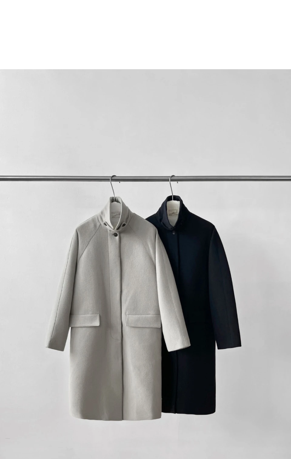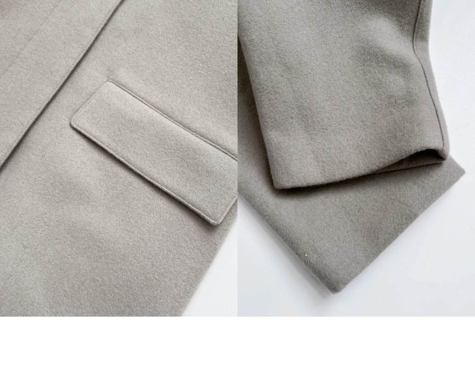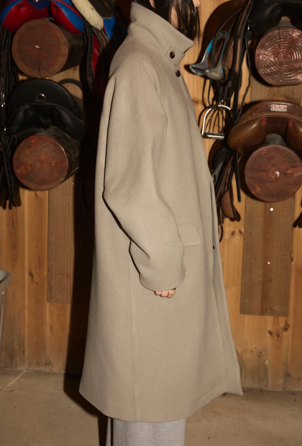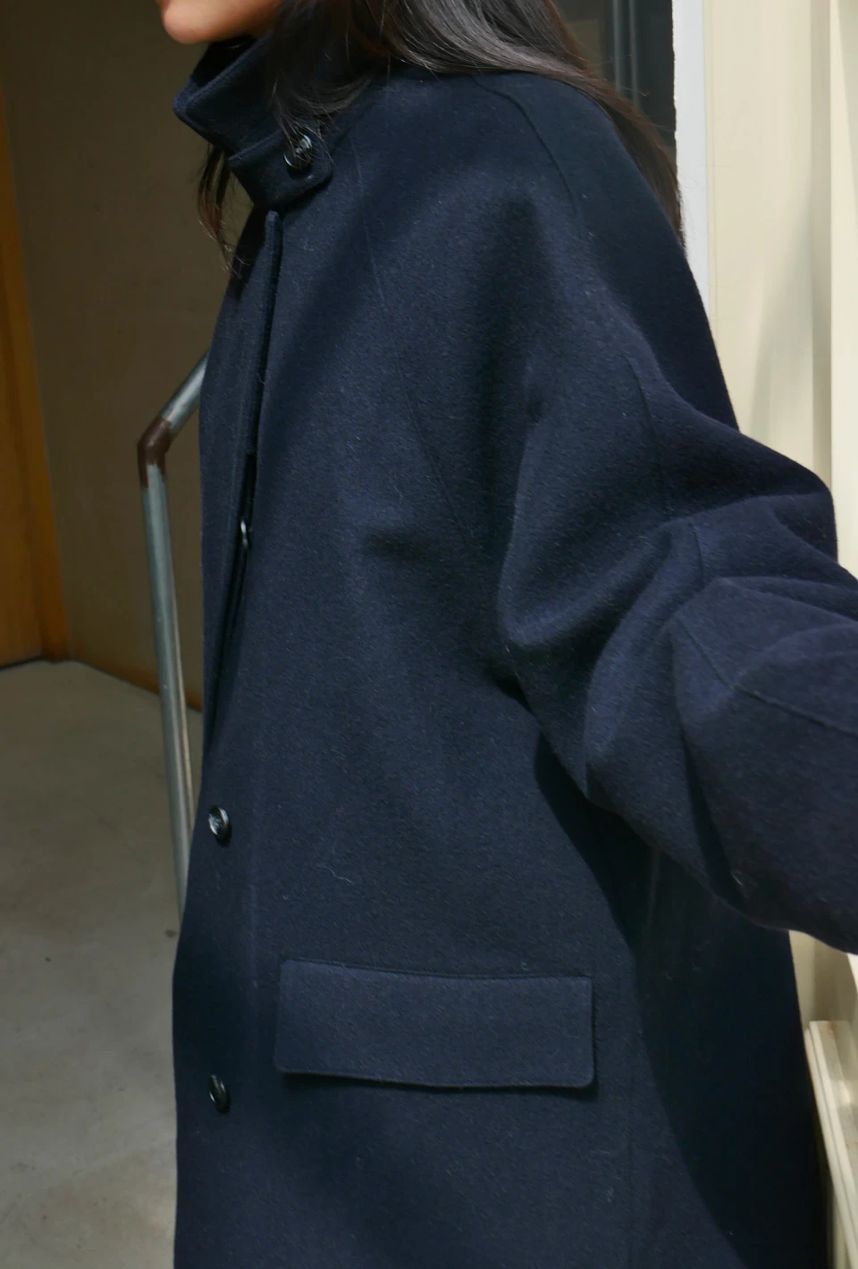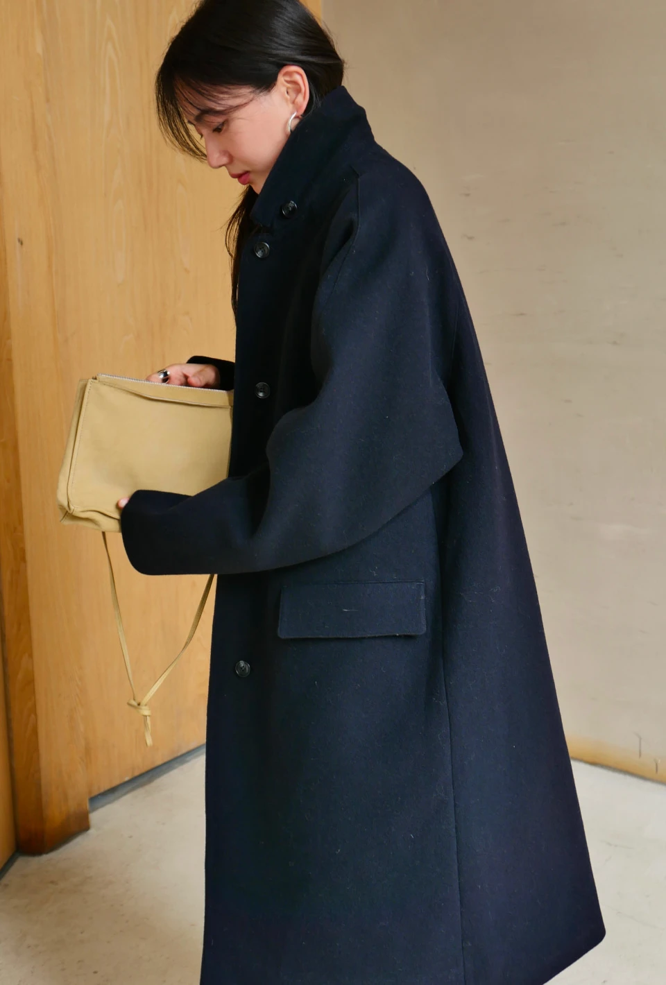 ボタンで閉じるハイネックデザインが、保温性と立体的なシルエットをプラスするディテール。
