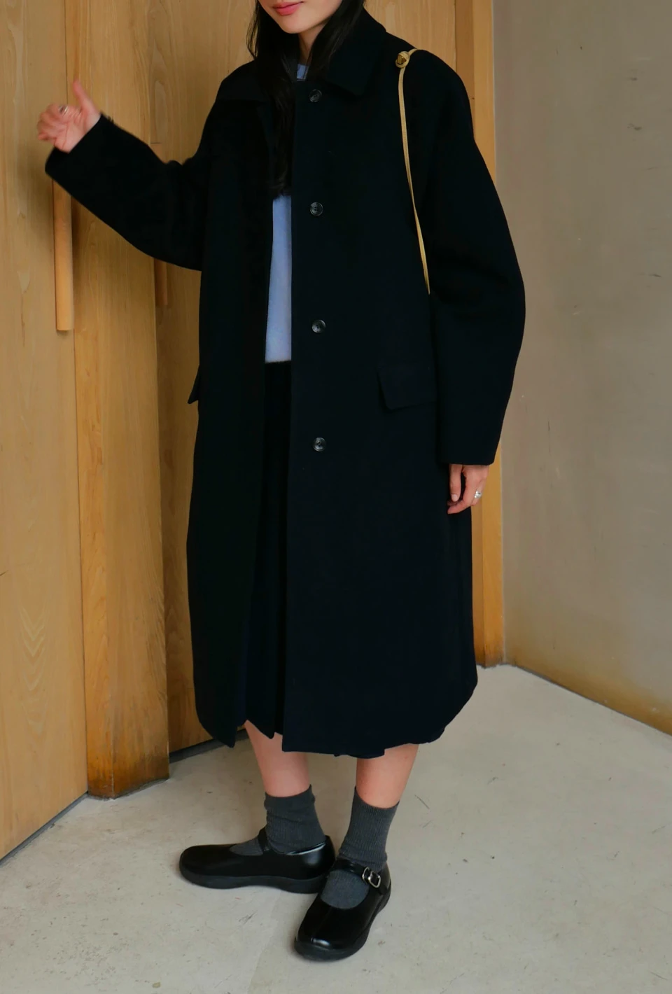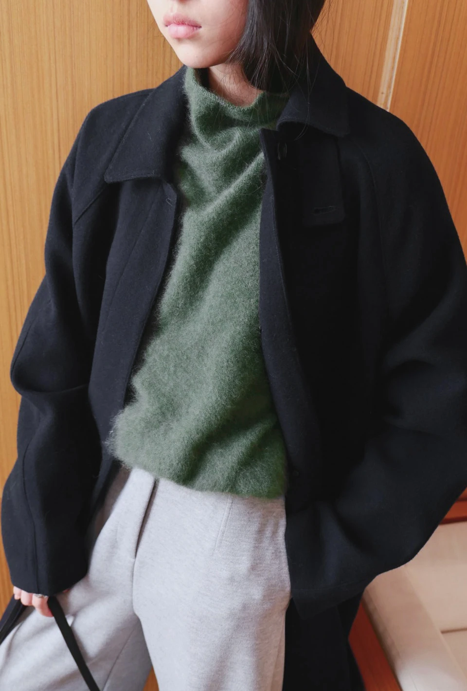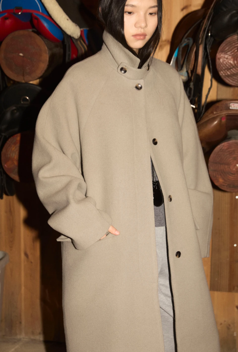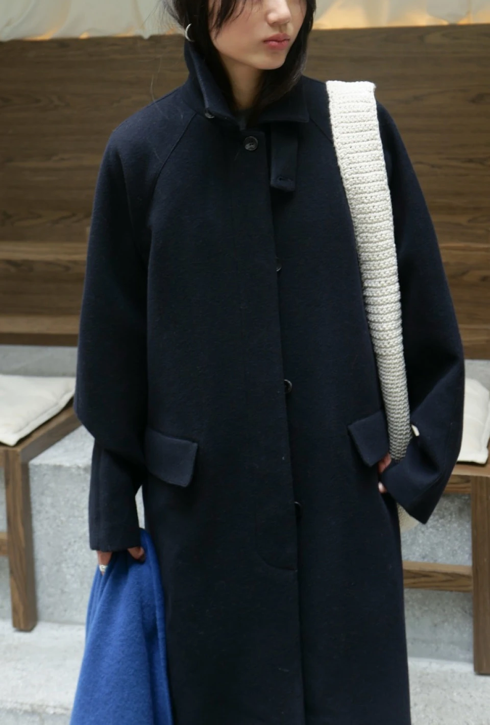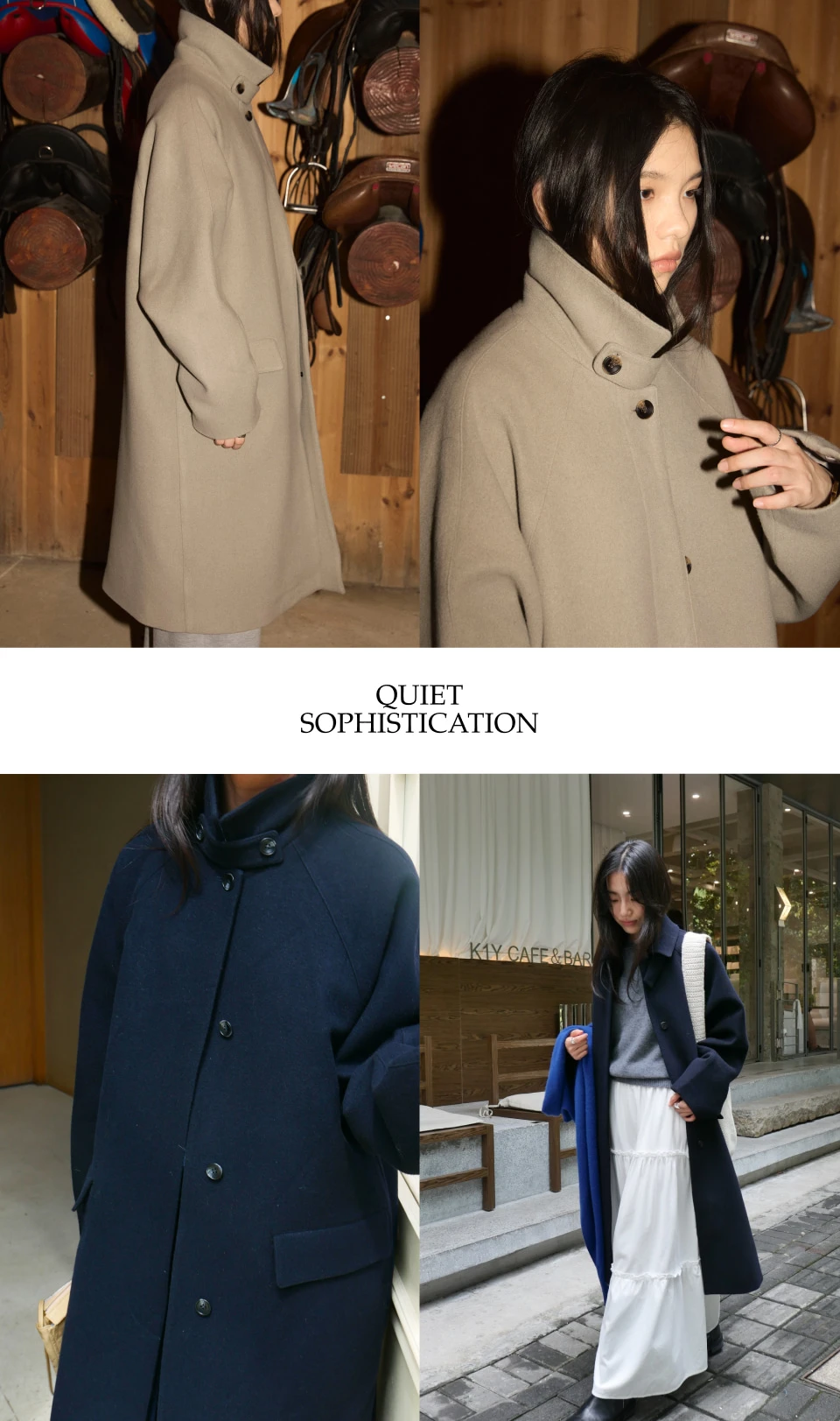 ボタンで閉じるハイネックデザインが、保温性と立体的なシルエットをプラスするディテール。