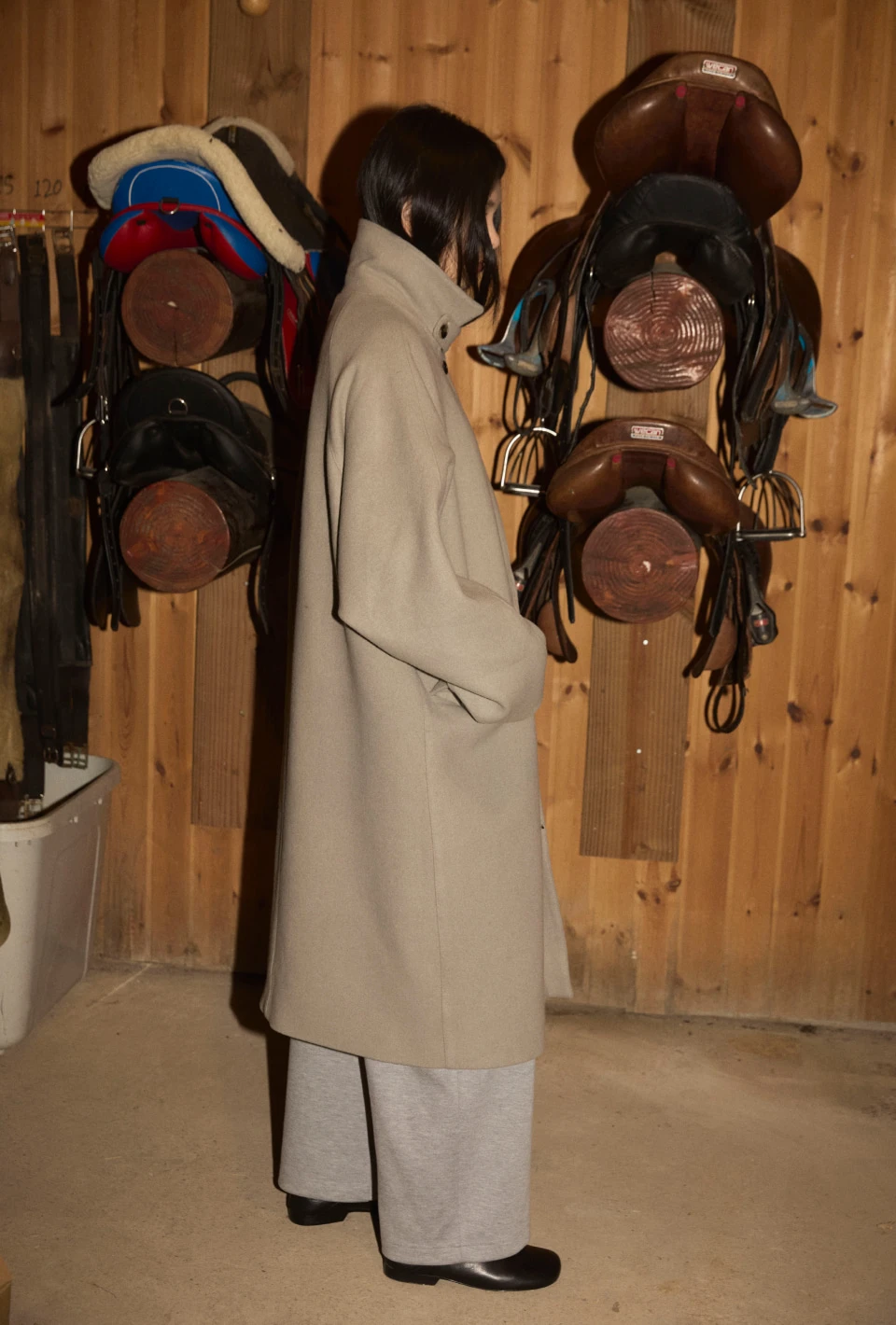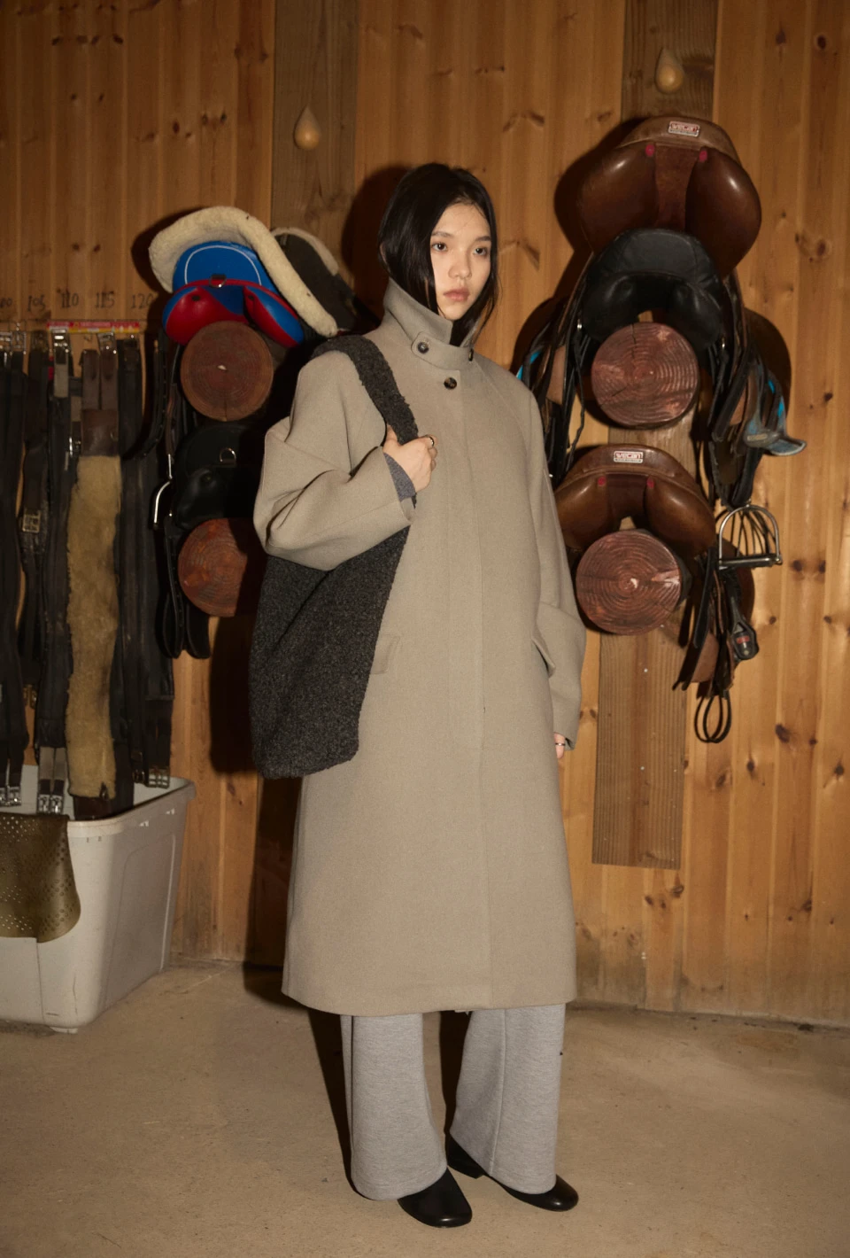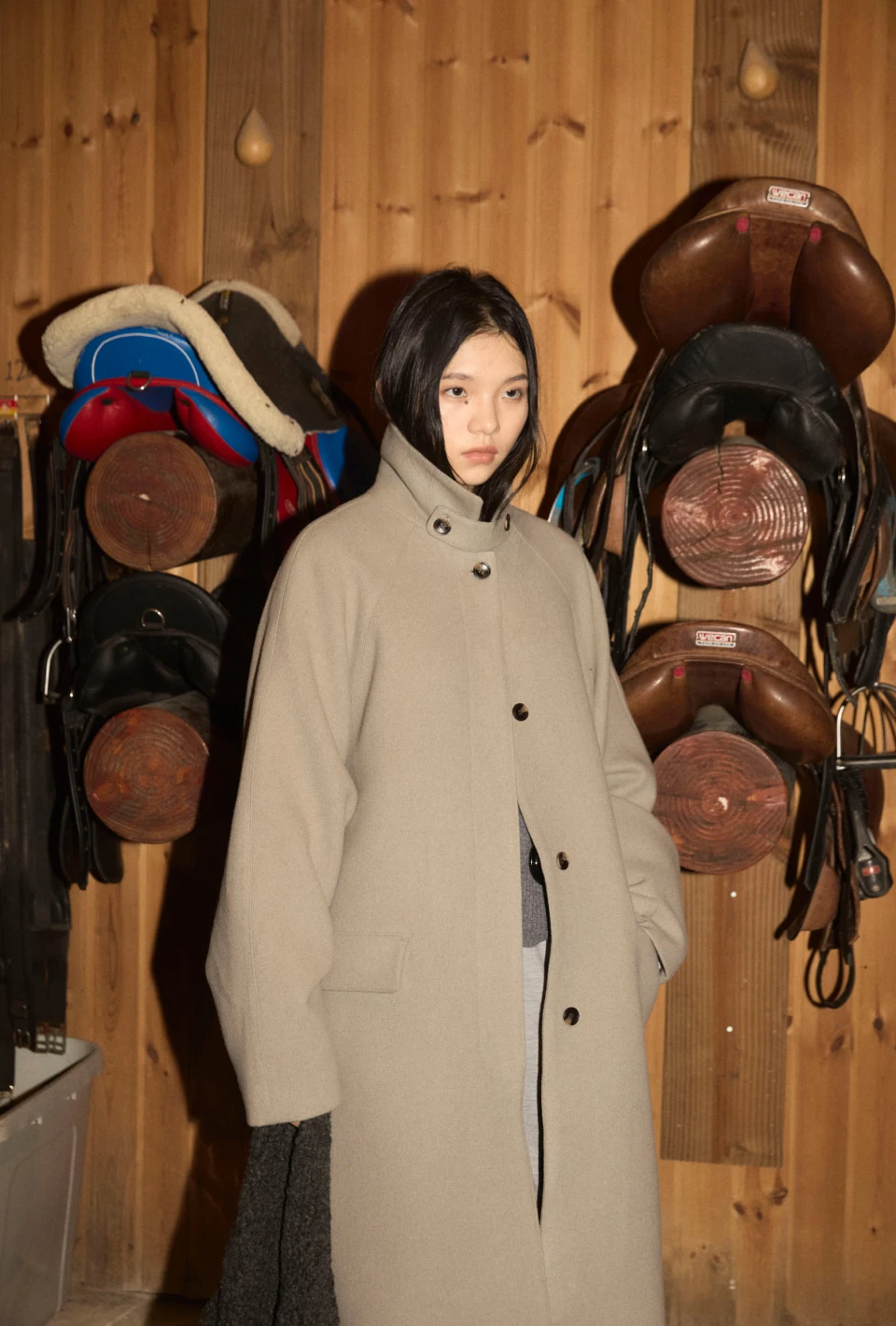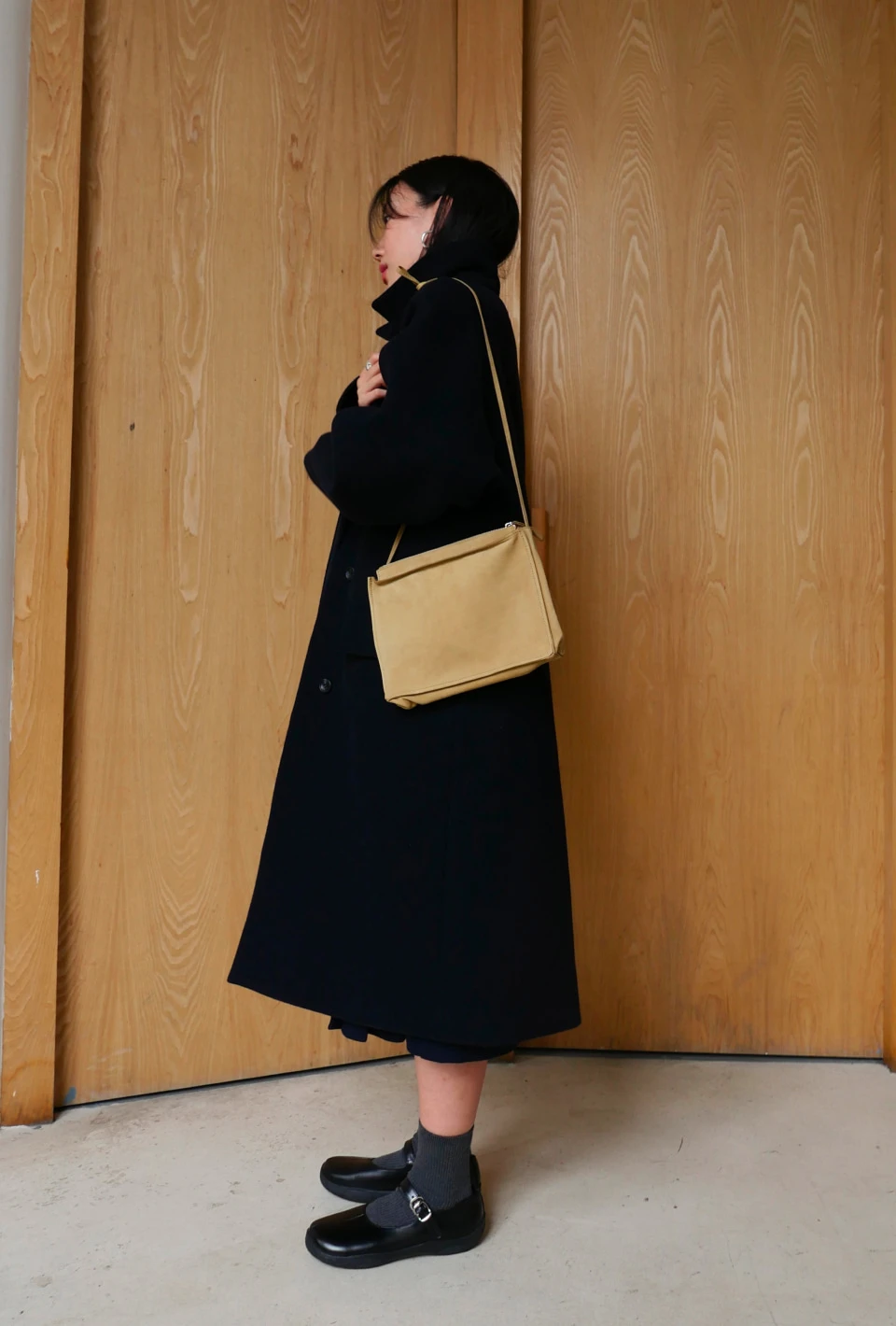 ボタンで閉じるハイネックデザインが、保温性と立体的なシルエットをプラスするディテール。