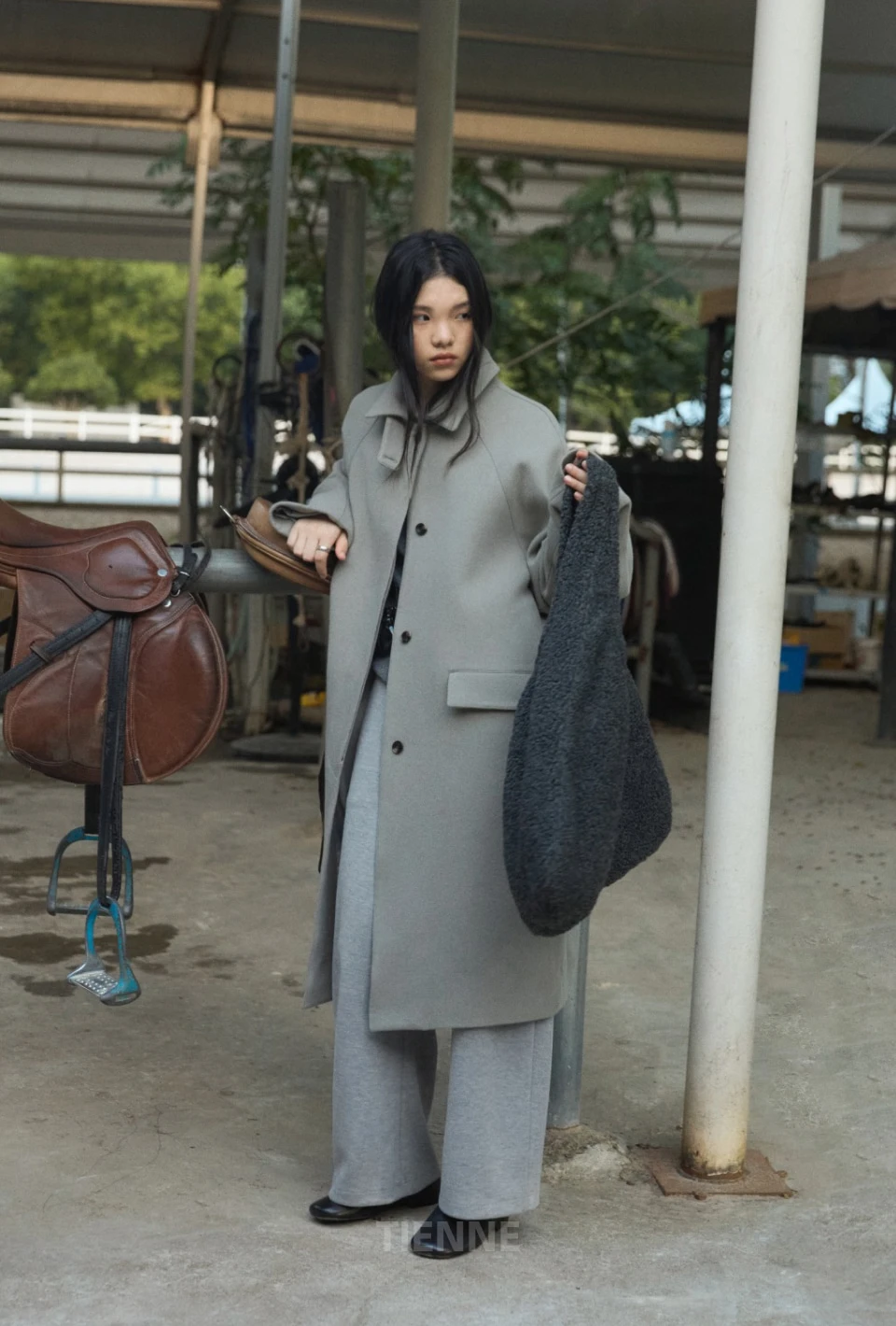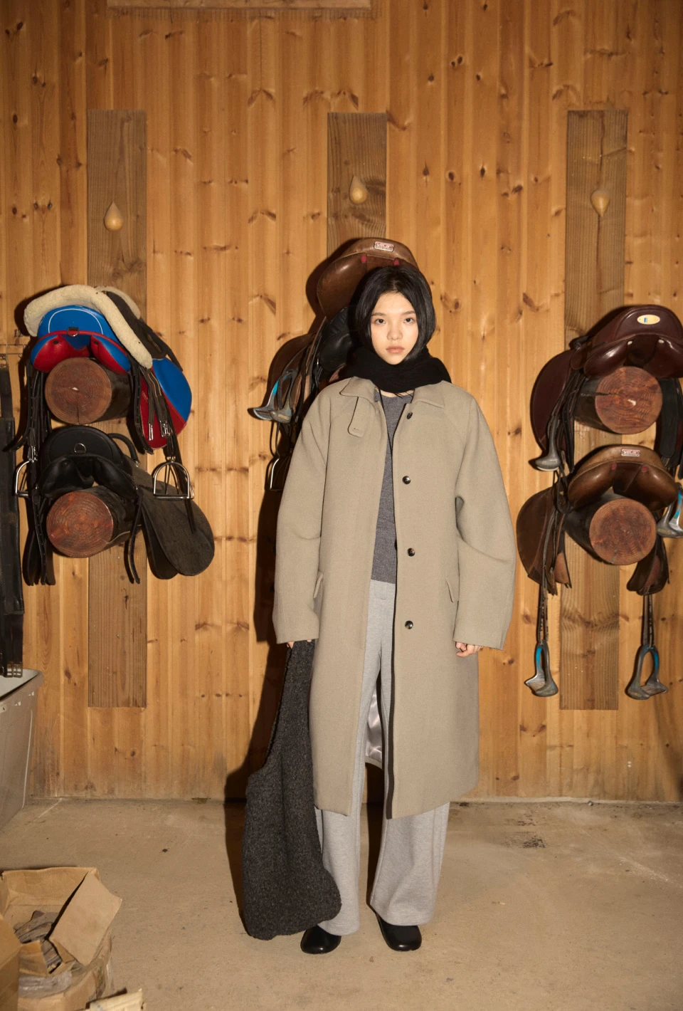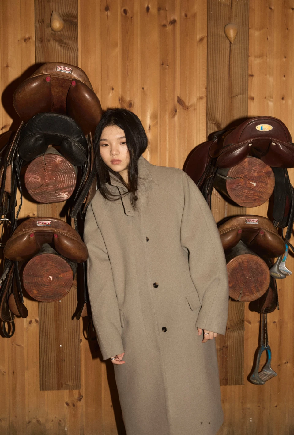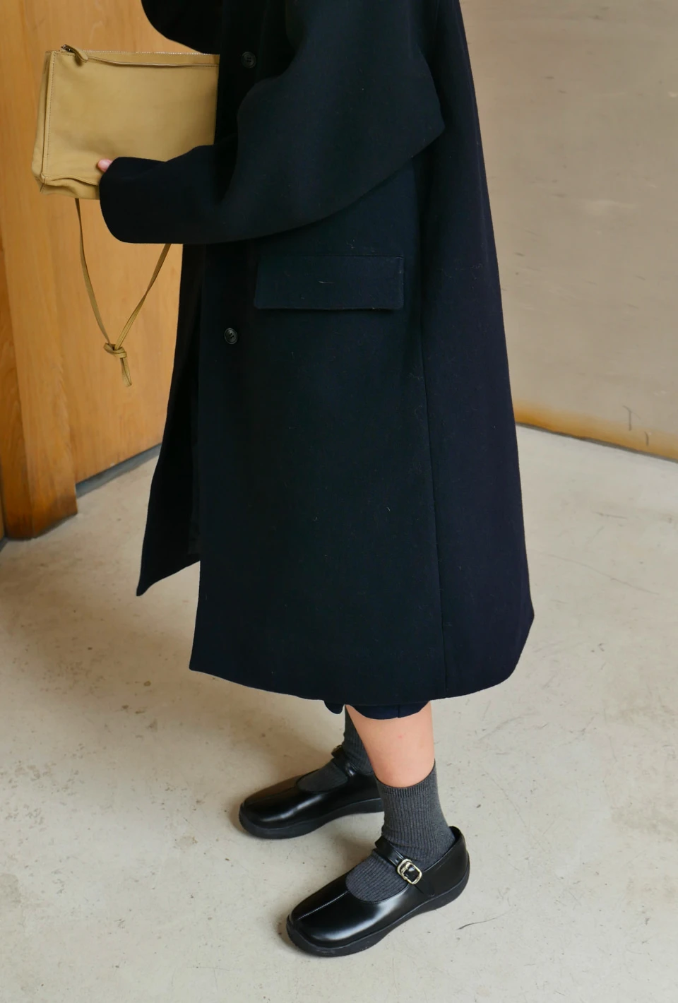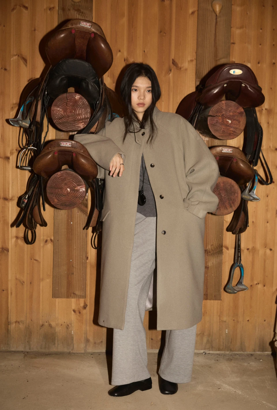 ボタンで閉じるハイネックデザインが、保温性と立体的なシルエットをプラスするディテール。