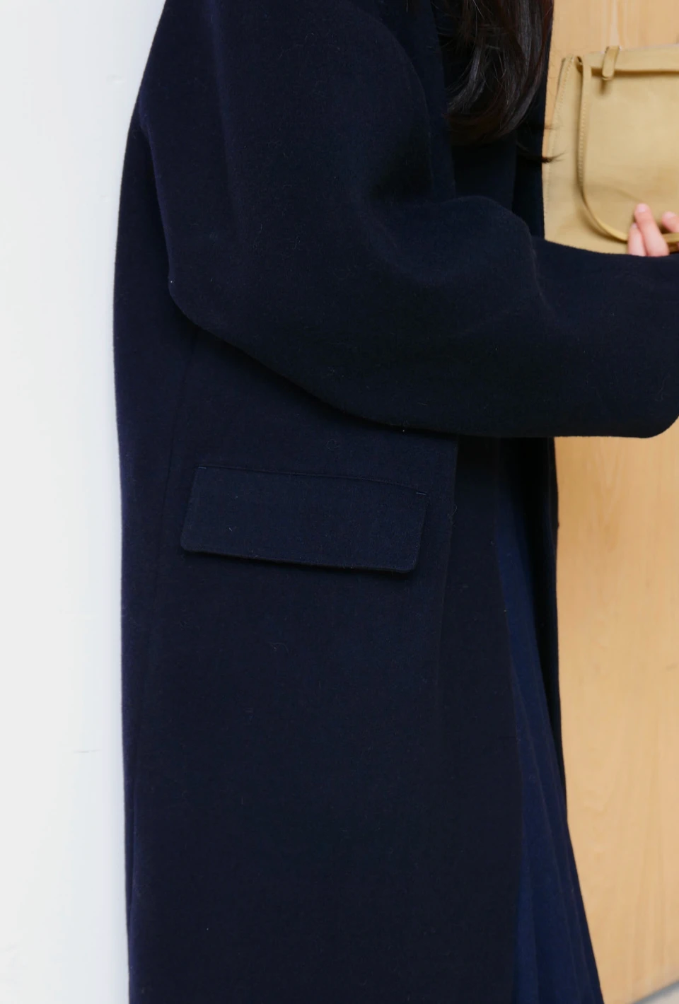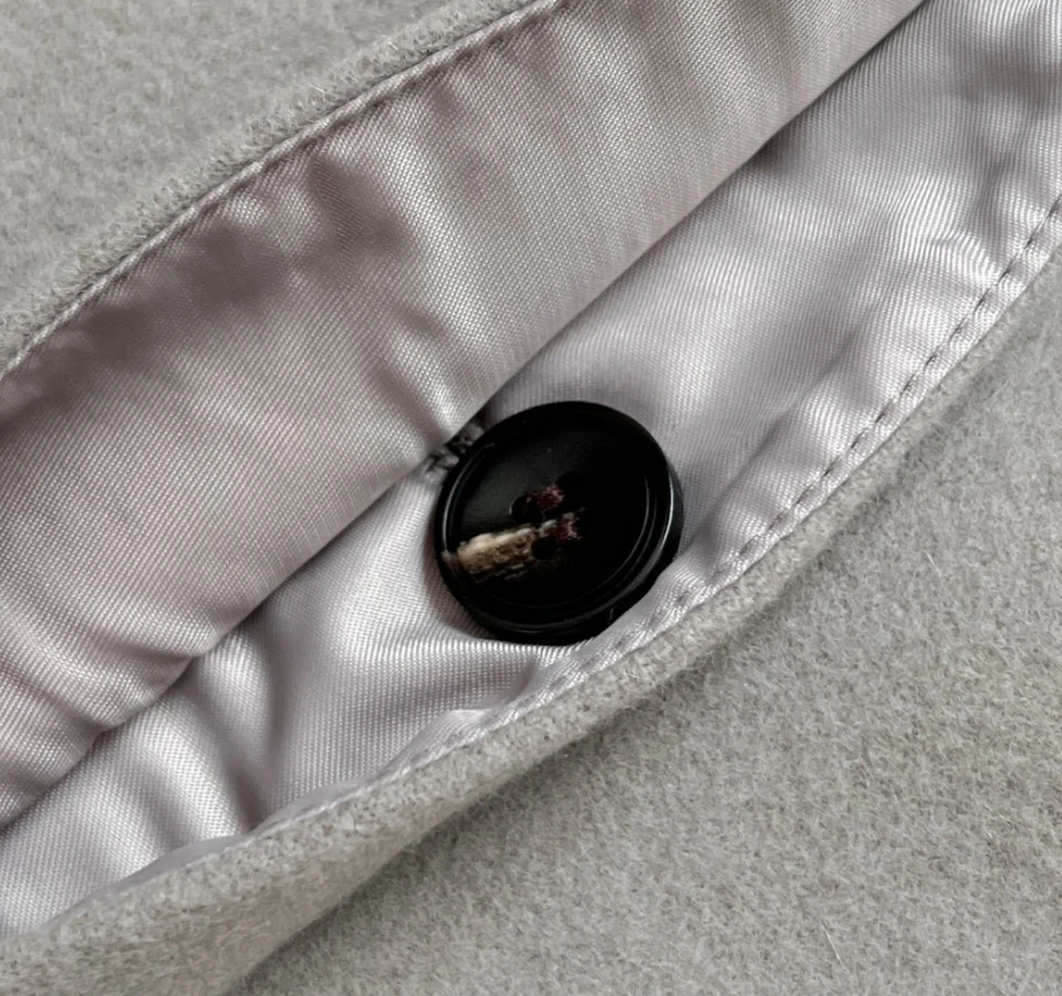 内側に生地を重ねてボタンを隠した、すっきりとした隠し仕上げのディテール。