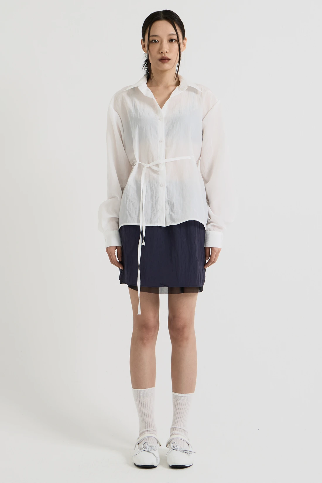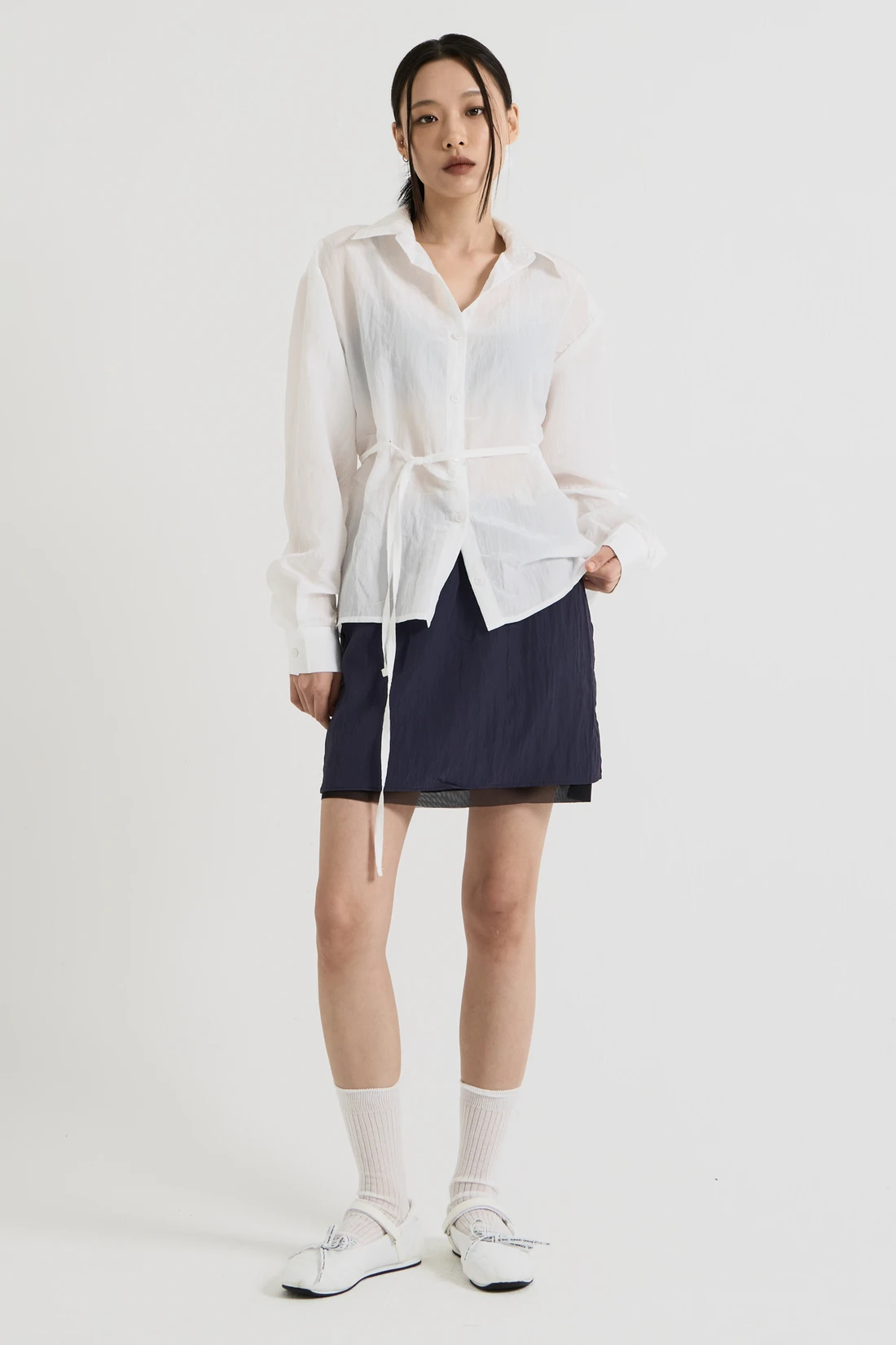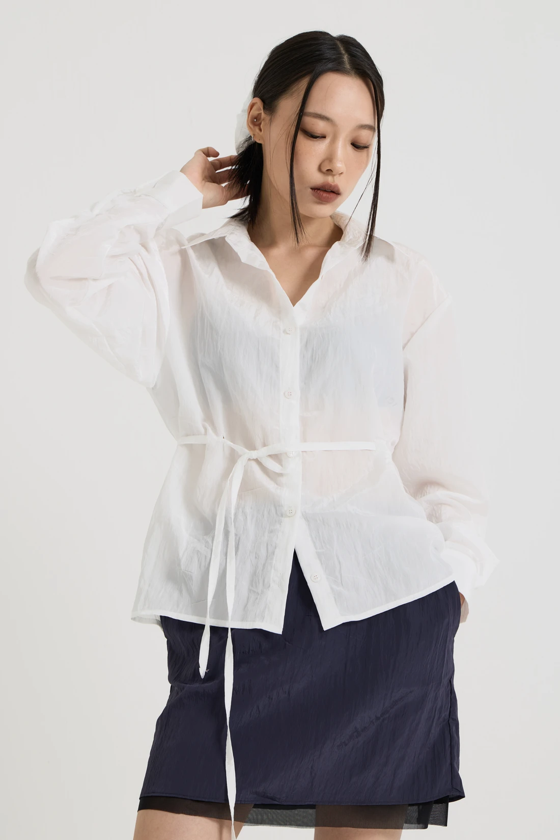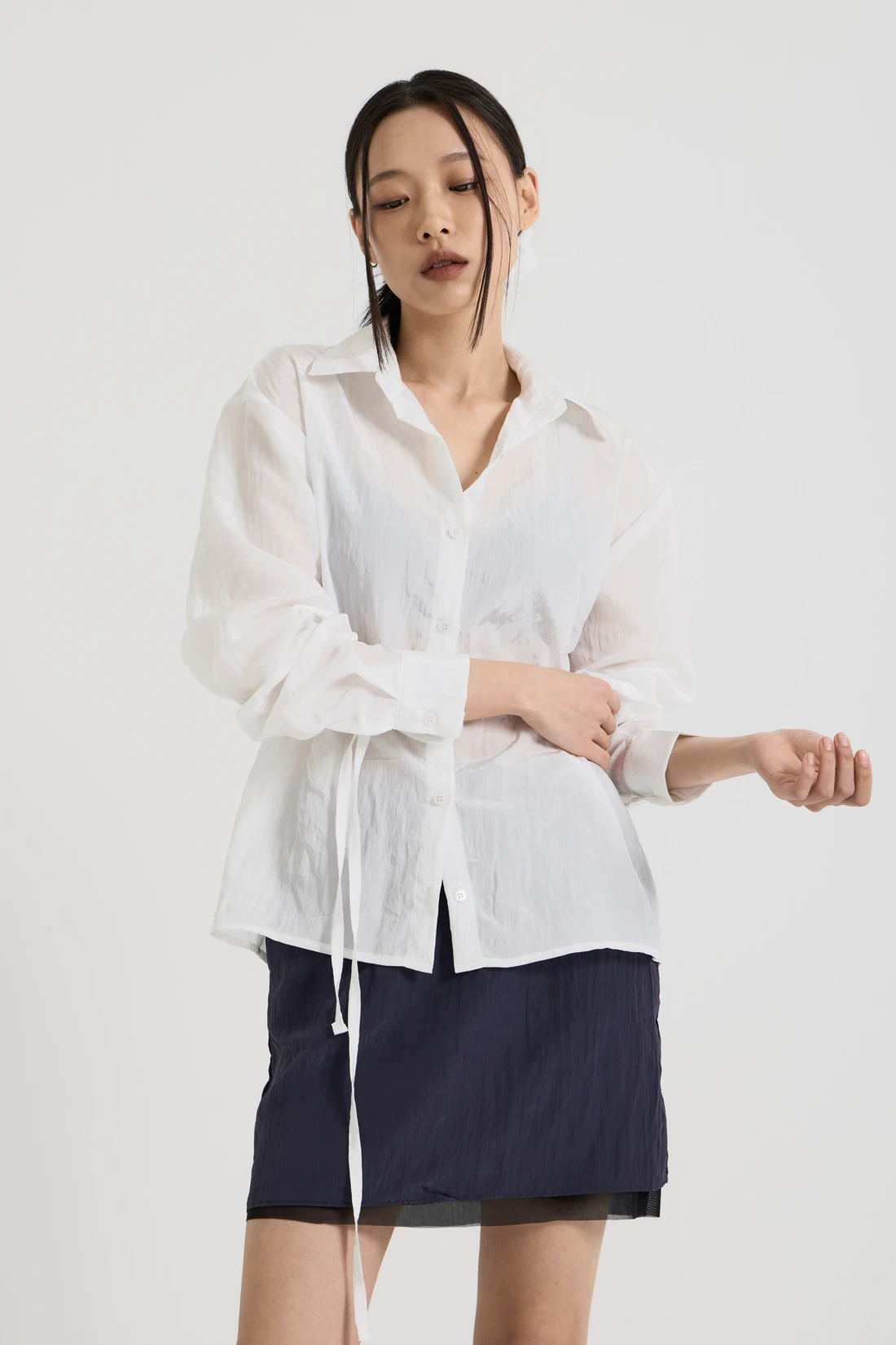 ポリエステルとナイロンをブレンドした生地のブラウス。セミオーバーフィットシルエットで、同素材のストリングと自然なシワ感が特徴です。 素材:ポリエステル 82%、ナイロン 18% カラー:ホワイト モデル:168cm/ONEサイズ着用 サイズ(cm) ONE SIZE:着丈 63/肩幅 44/バスト 51/袖丈 60