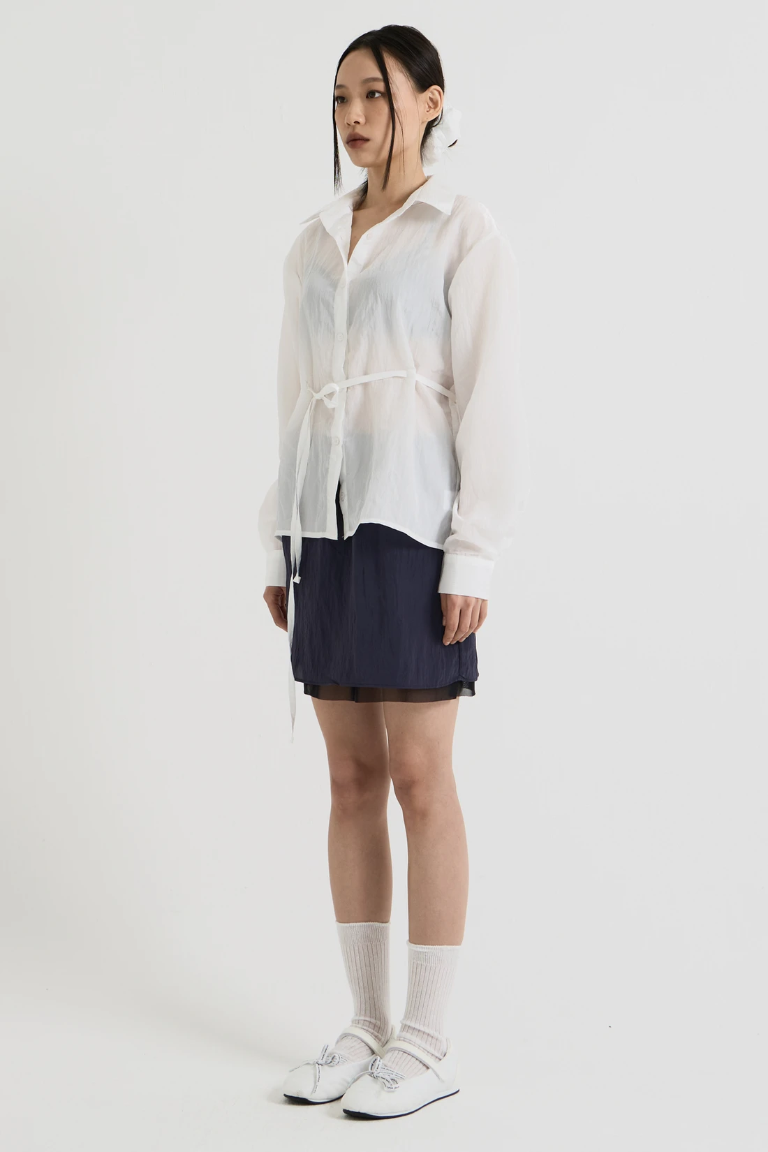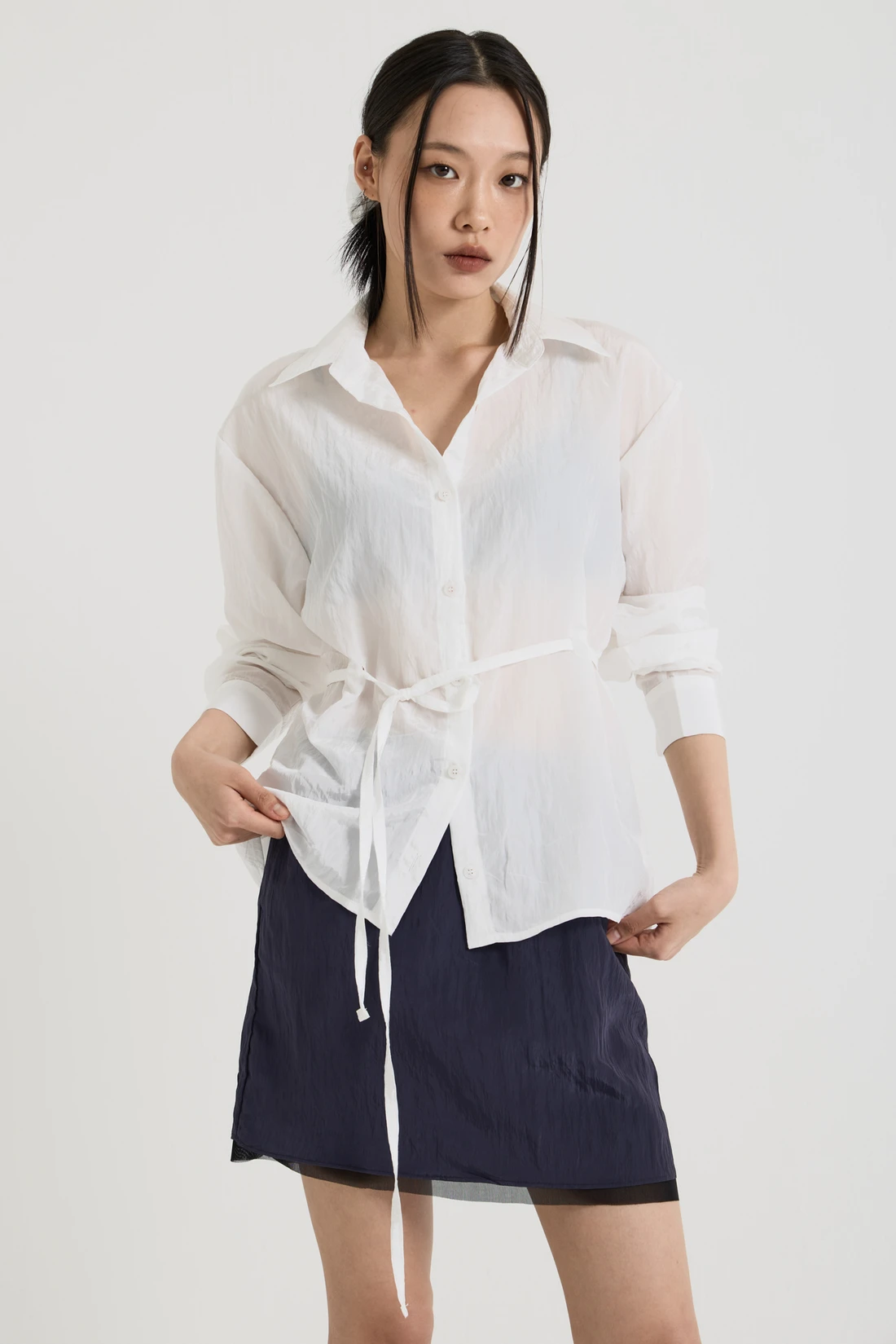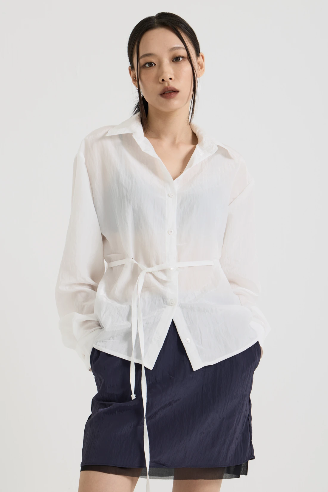 ポリエステルとナイロンをブレンドした生地のブラウス。セミオーバーフィットシルエットで、同素材のストリングと自然なシワ感が特徴です。 素材:ポリエステル 82%、ナイロン 18% カラー:ホワイト モデル:168cm/ONEサイズ着用 サイズ(cm) ONE SIZE:着丈 63/肩幅 44/バスト 51/袖丈 60