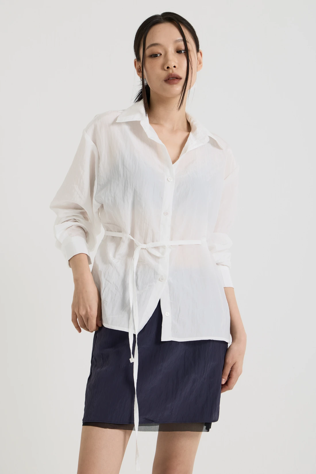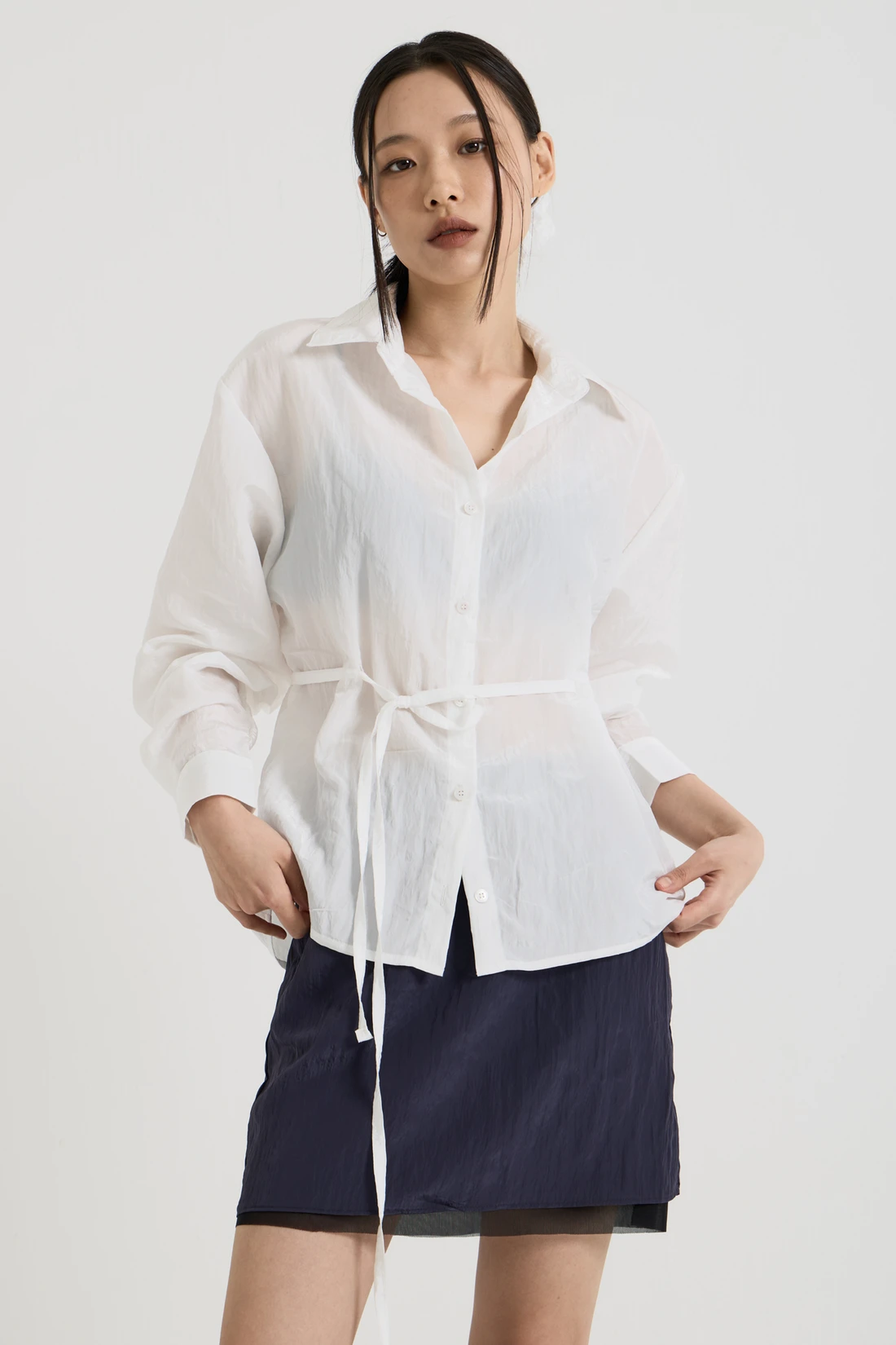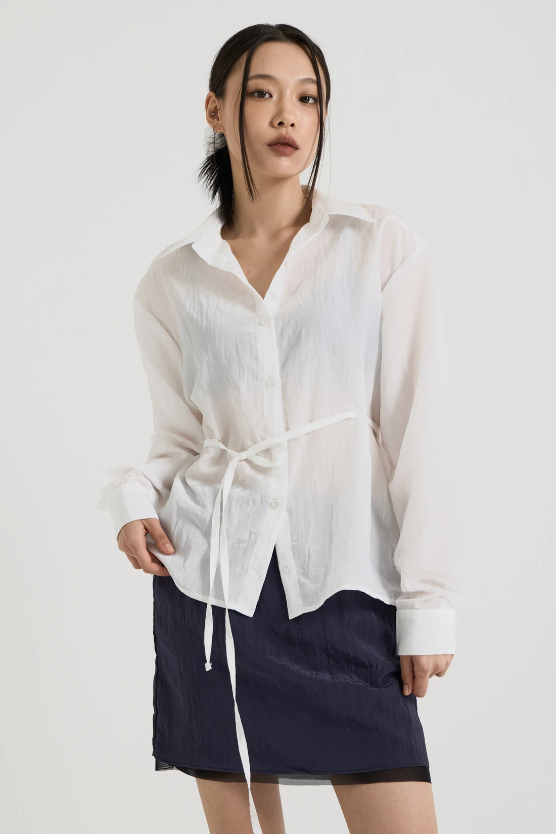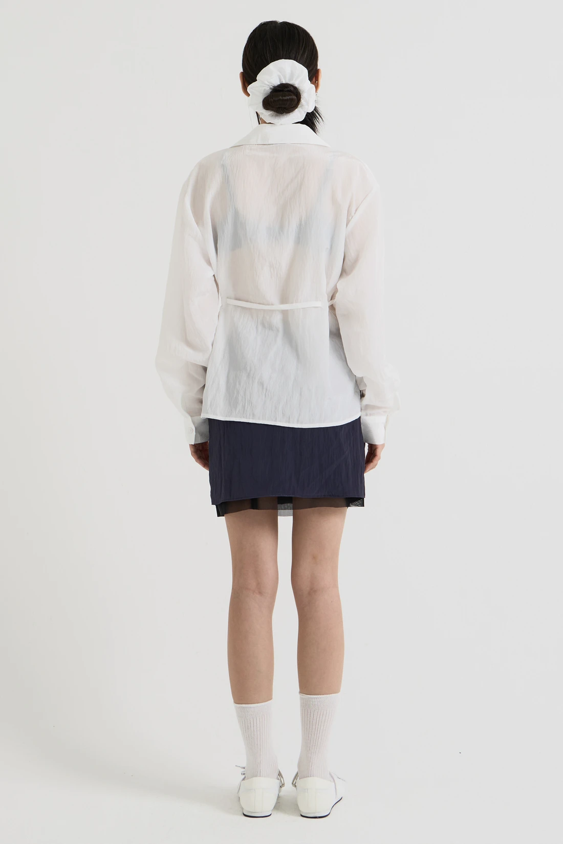 ポリエステルとナイロンをブレンドした生地のブラウス。セミオーバーフィットシルエットで、同素材のストリングと自然なシワ感が特徴です。 素材:ポリエステル 82%、ナイロン 18% カラー:ホワイト モデル:168cm/ONEサイズ着用 サイズ(cm) ONE SIZE:着丈 63/肩幅 44/バスト 51/袖丈 60