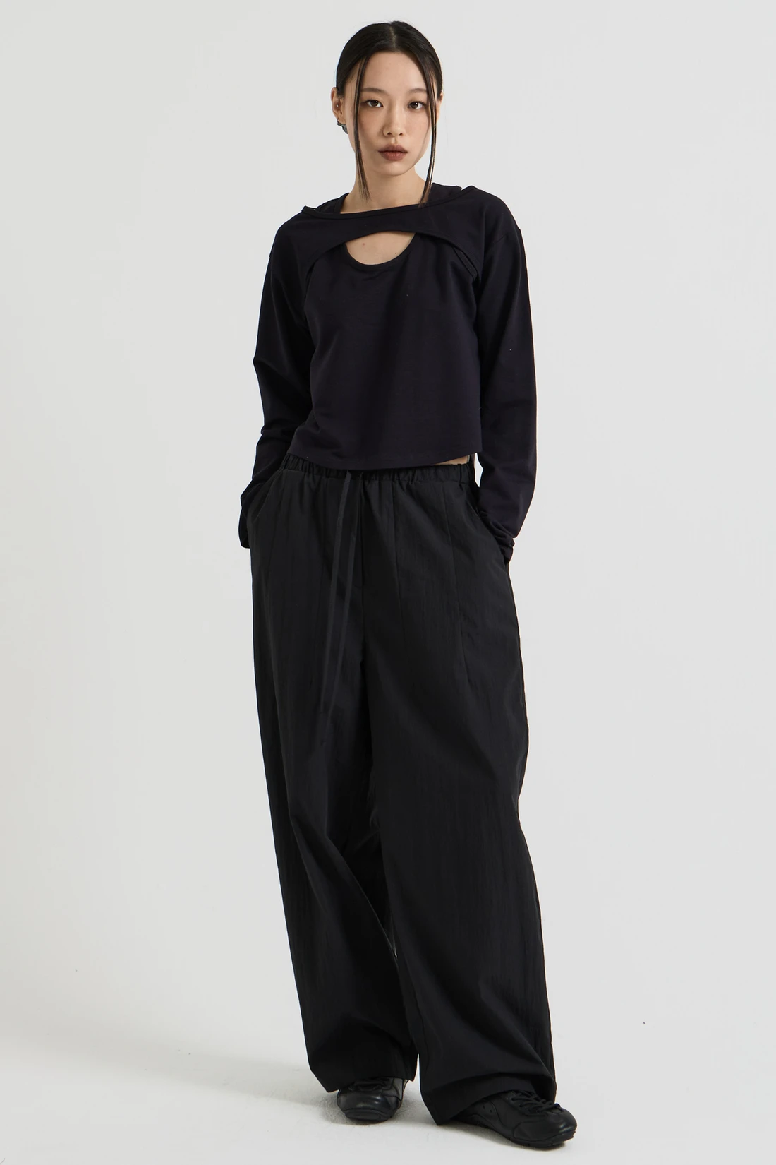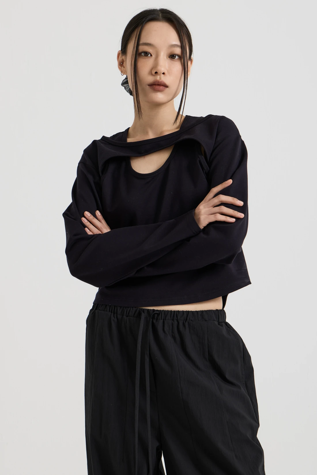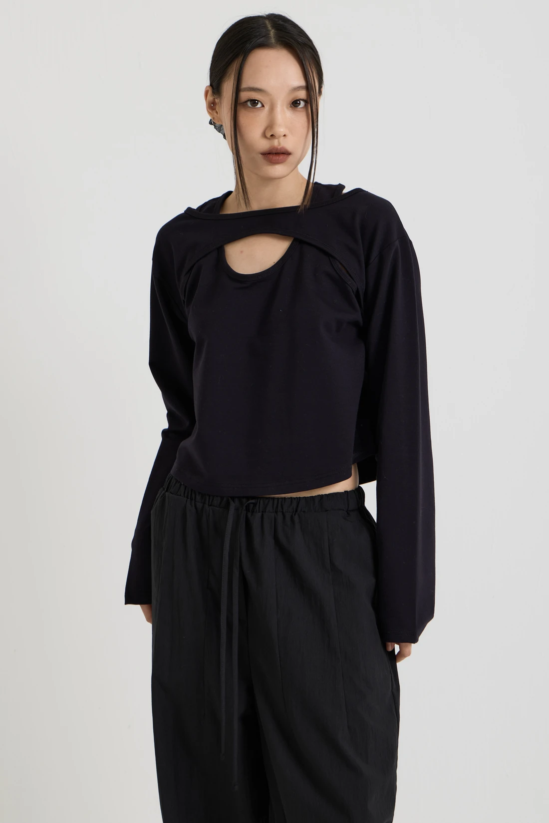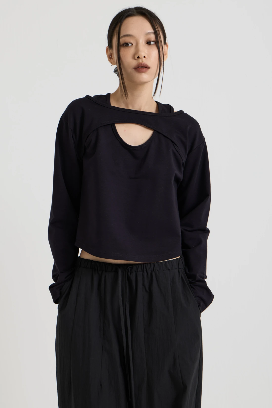 コットン素材を使用したレイヤードロングスリーブトップス。Tシャツとスリーブレスのレイヤードデザインで、長めのスリーブが手の甲まで覆います。 素材:コットン 96%、スパン 4% カラー:ブラック モデル:168cm/ONEサイズ着用 サイズ(cm) ONE SIZE:着丈 48.5/肩幅 45/バスト 41/袖丈 59