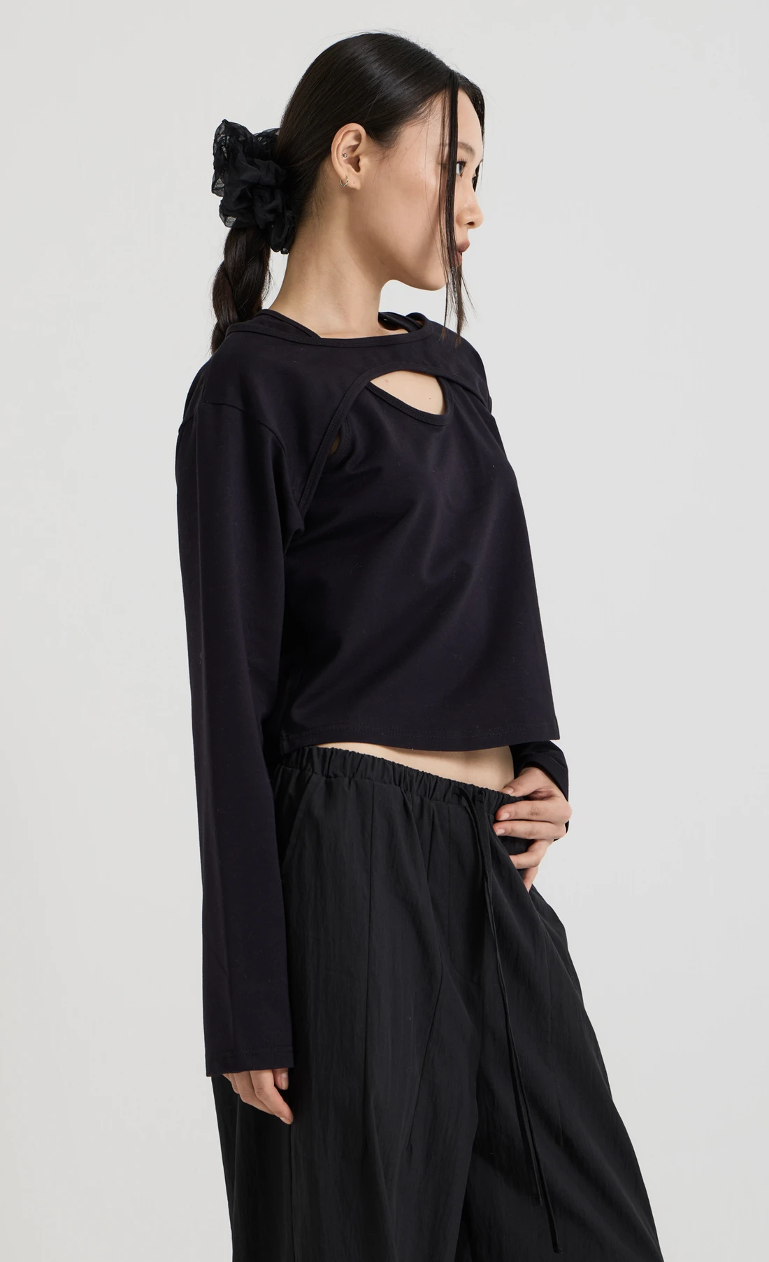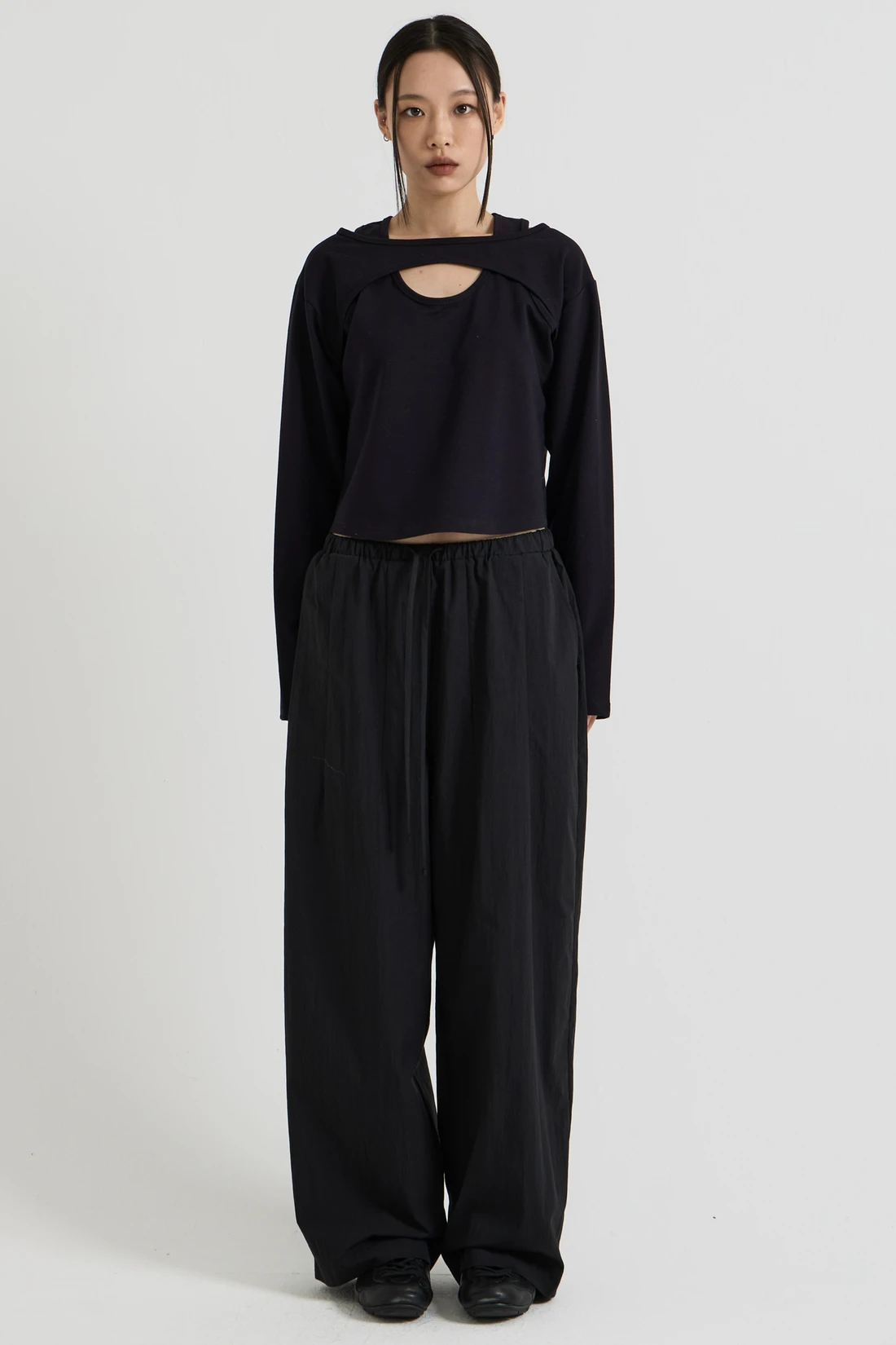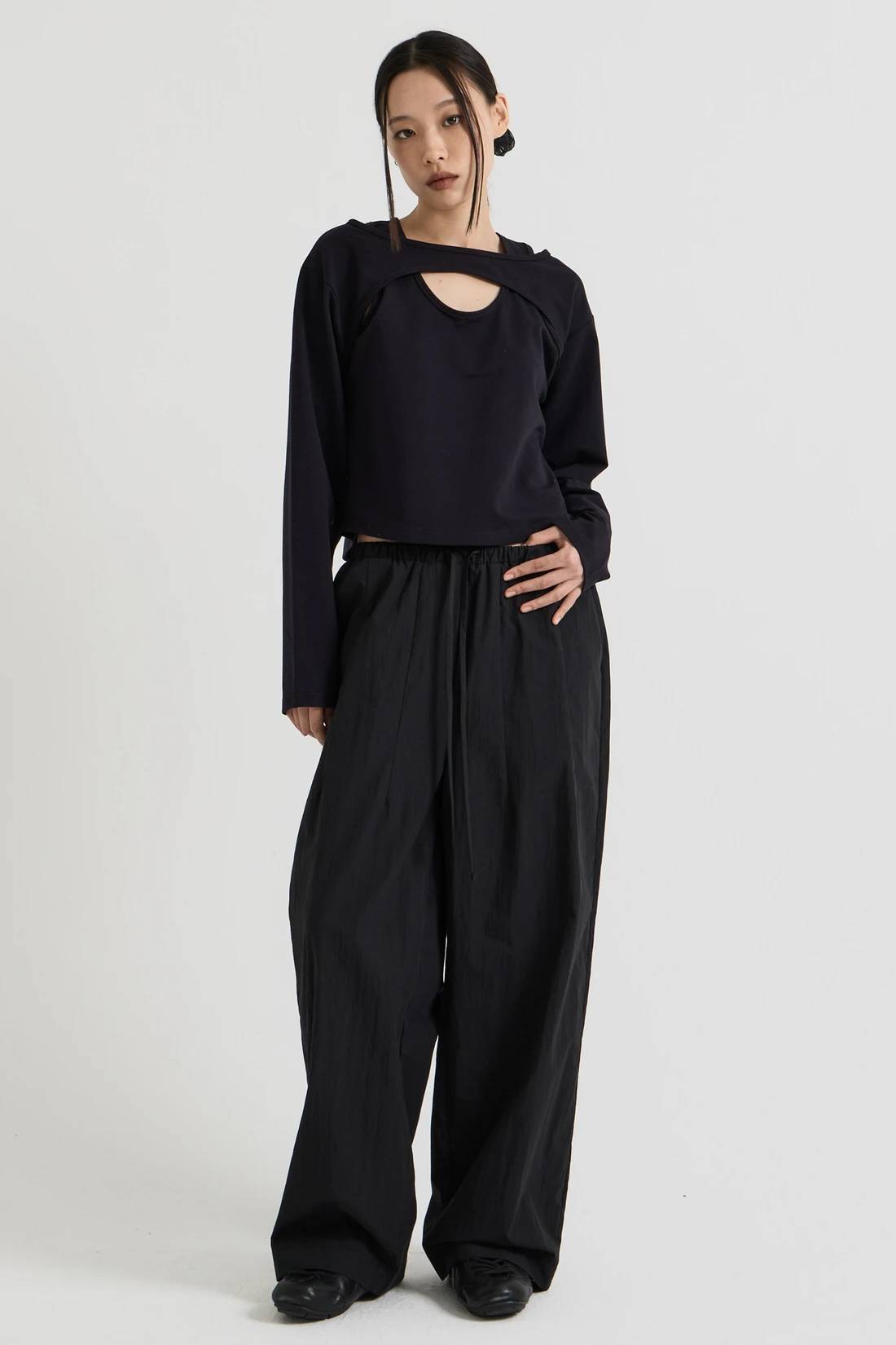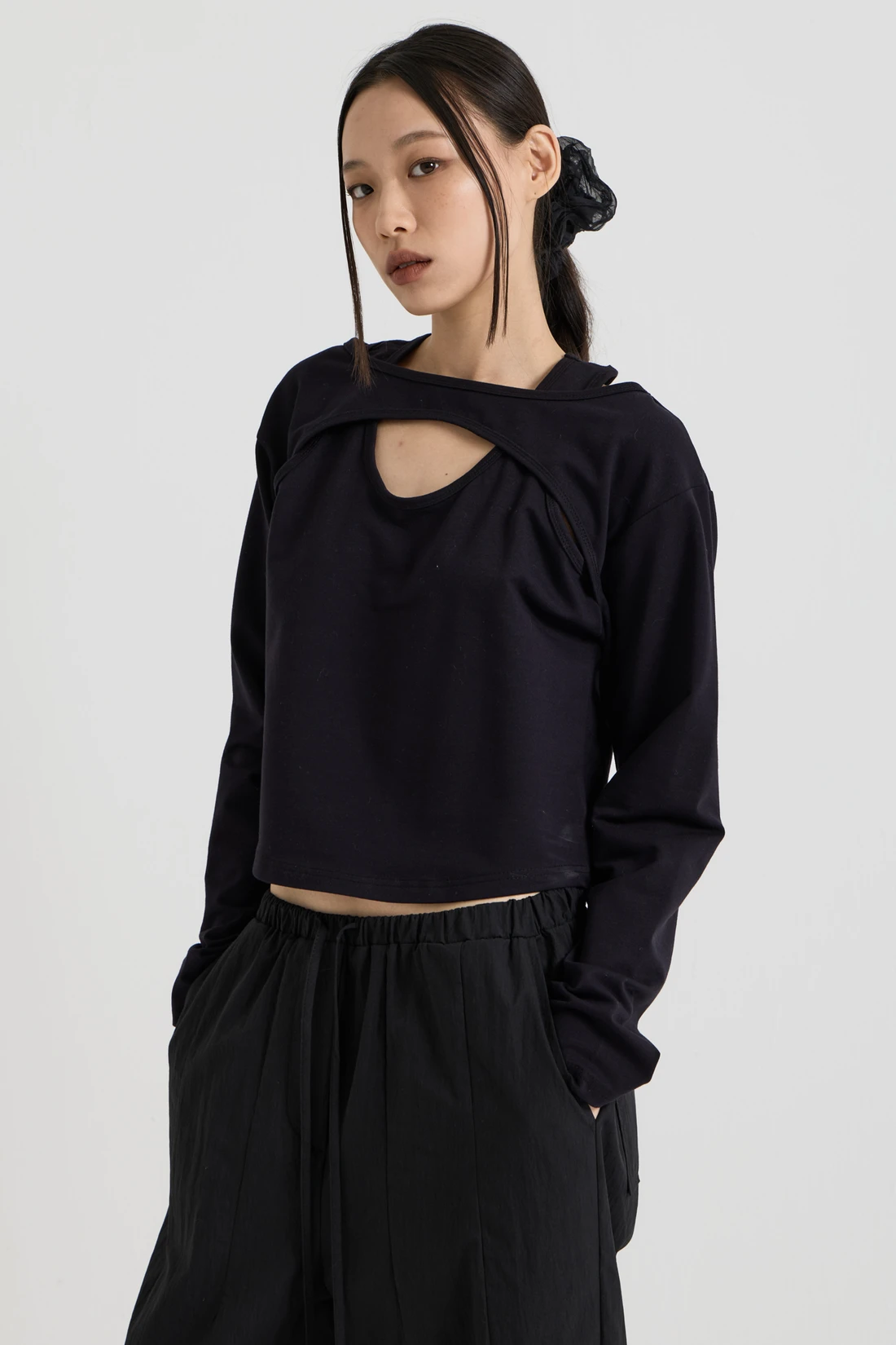 コットン素材を使用したレイヤードロングスリーブトップス。Tシャツとスリーブレスのレイヤードデザインで、長めのスリーブが手の甲まで覆います。 素材:コットン 96%、スパン 4% カラー:ブラック モデル:168cm/ONEサイズ着用 サイズ(cm) ONE SIZE:着丈 48.5/肩幅 45/バスト 41/袖丈 59