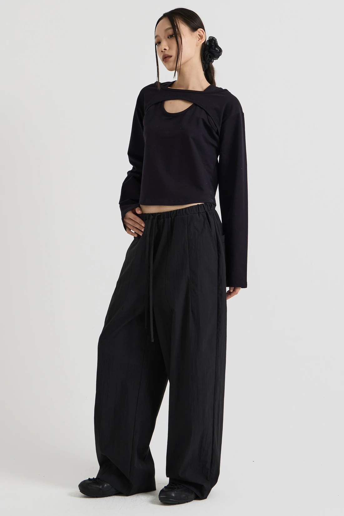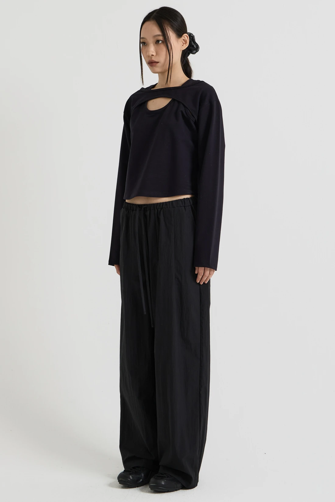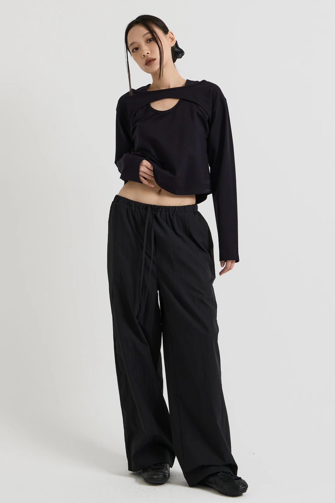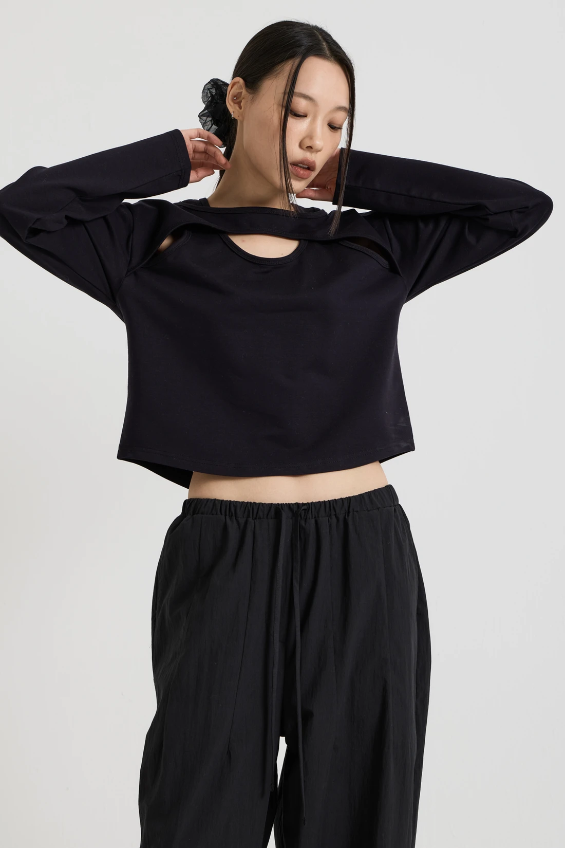 コットン素材を使用したレイヤードロングスリーブトップス。Tシャツとスリーブレスのレイヤードデザインで、長めのスリーブが手の甲まで覆います。 素材:コットン 96%、スパン 4% カラー:ブラック モデル:168cm/ONEサイズ着用 サイズ(cm) ONE SIZE:着丈 48.5/肩幅 45/バスト 41/袖丈 59