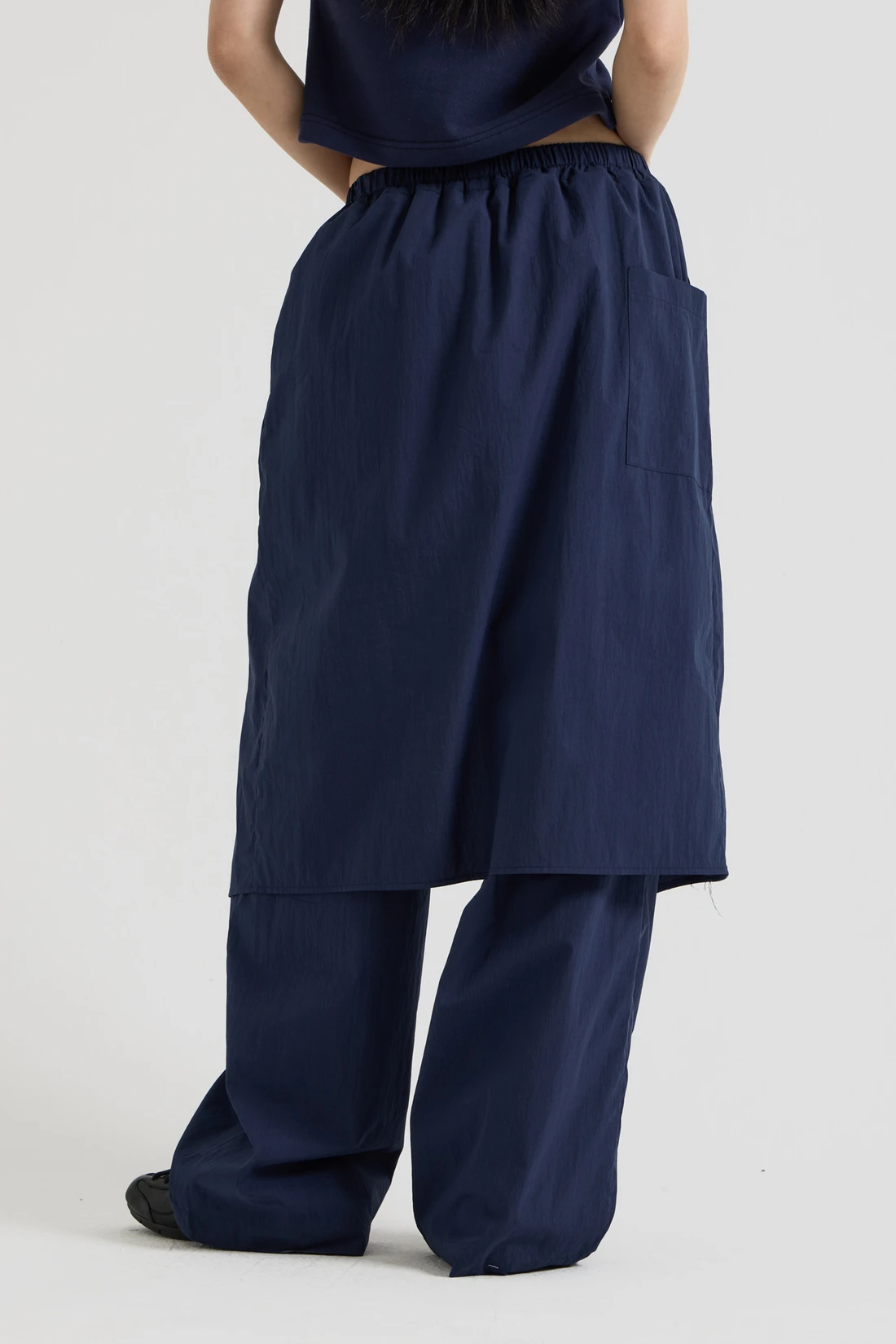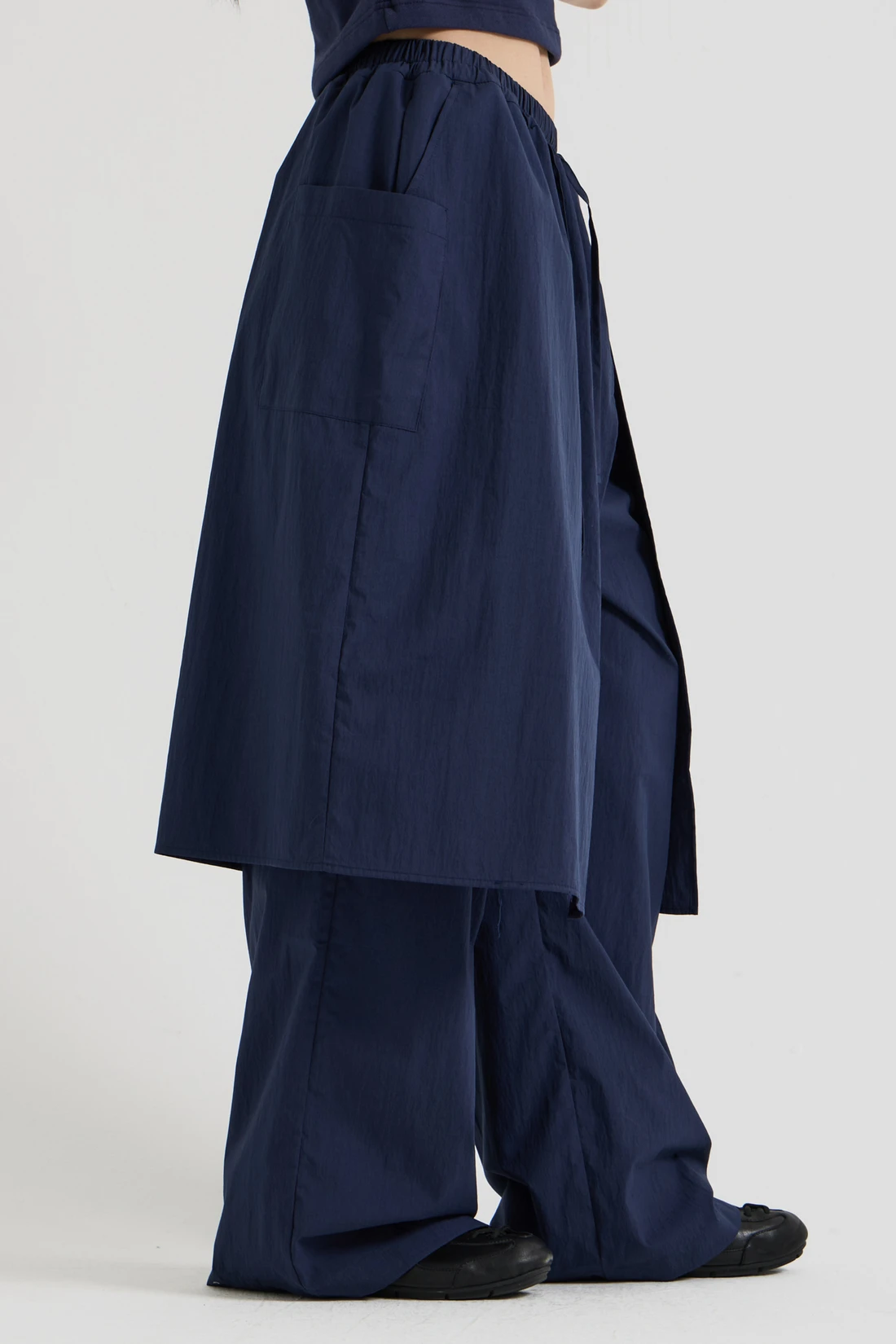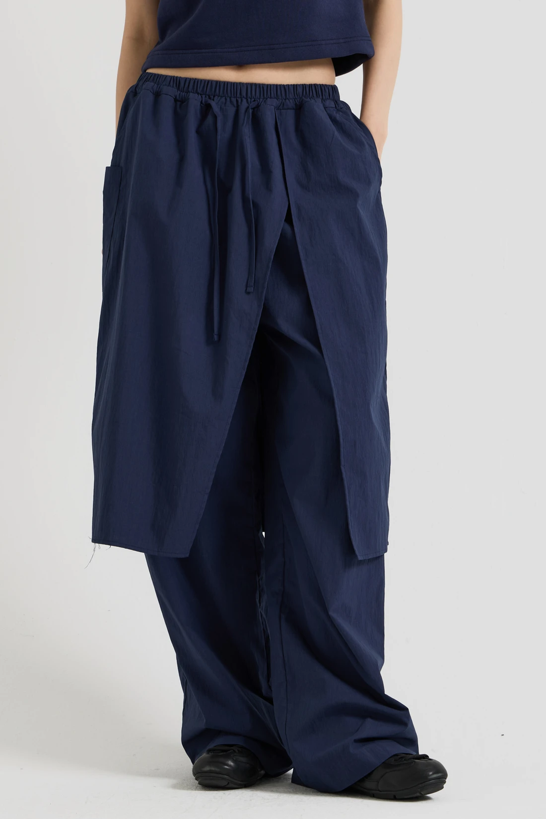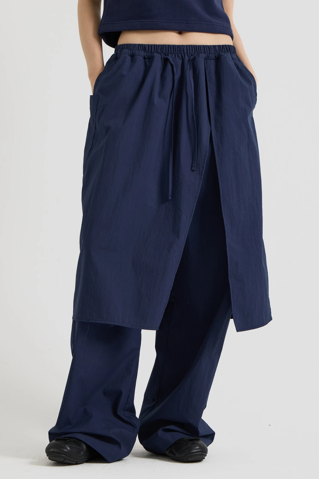 コットン素材を使用したスカートレイヤードデザインのバンディングパンツ。ワイドフィットシルエットで、スカート一体型のディテールが個性的なポイント。リラックス感とスタイル性を兼ね備えたデイリーアイテムです。 素材:コットン 64%、ナイロン 36% カラー:ネイビー モデル:168cm/ONEサイズ着用 サイズ(cm) ONE SIZE:総丈 100.5/ウエスト 32/ヒップ 54/太もも 34.5/股上 40/裾幅 29.5/スカート丈 67