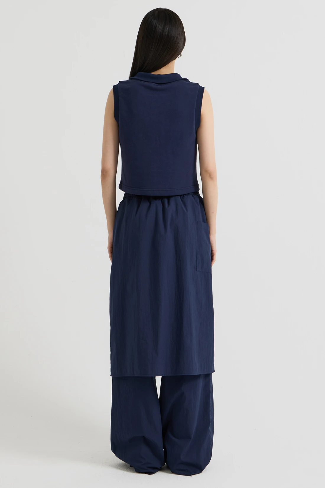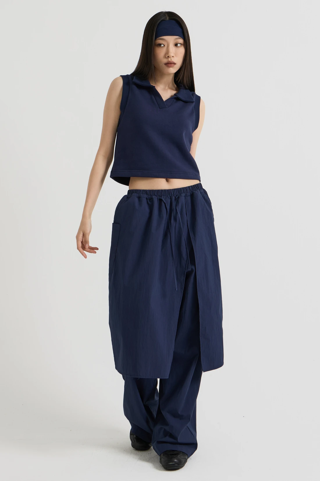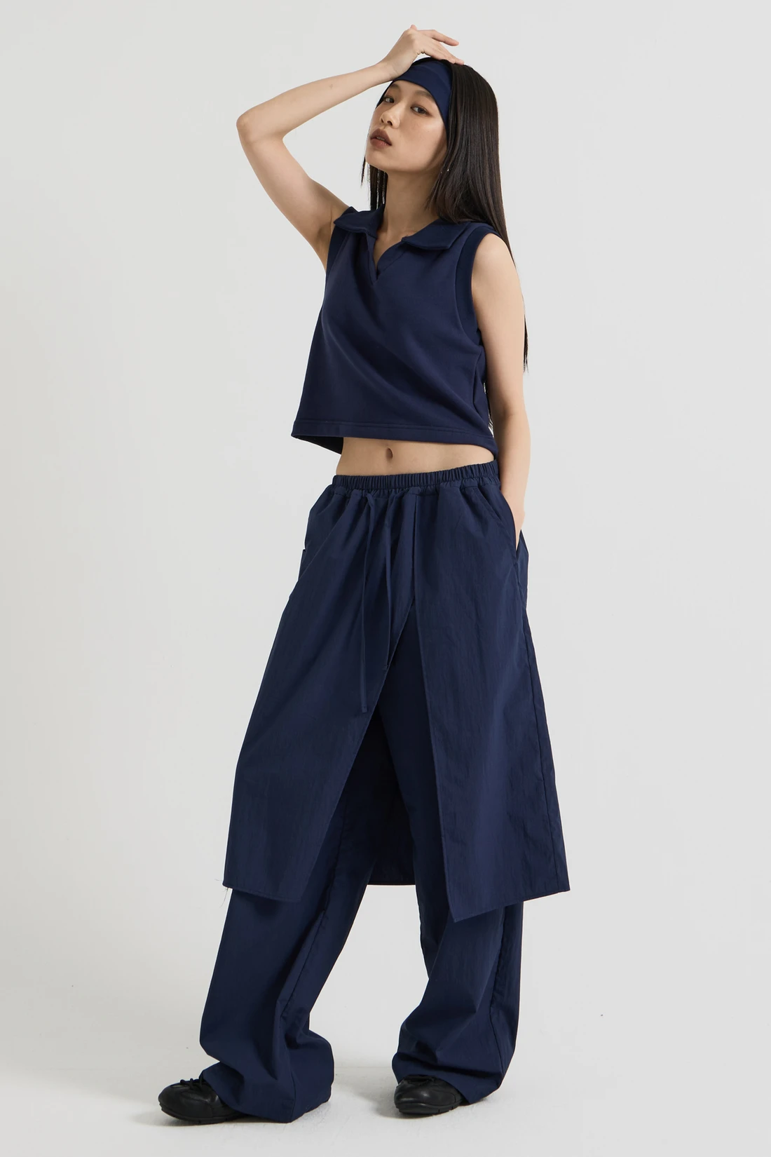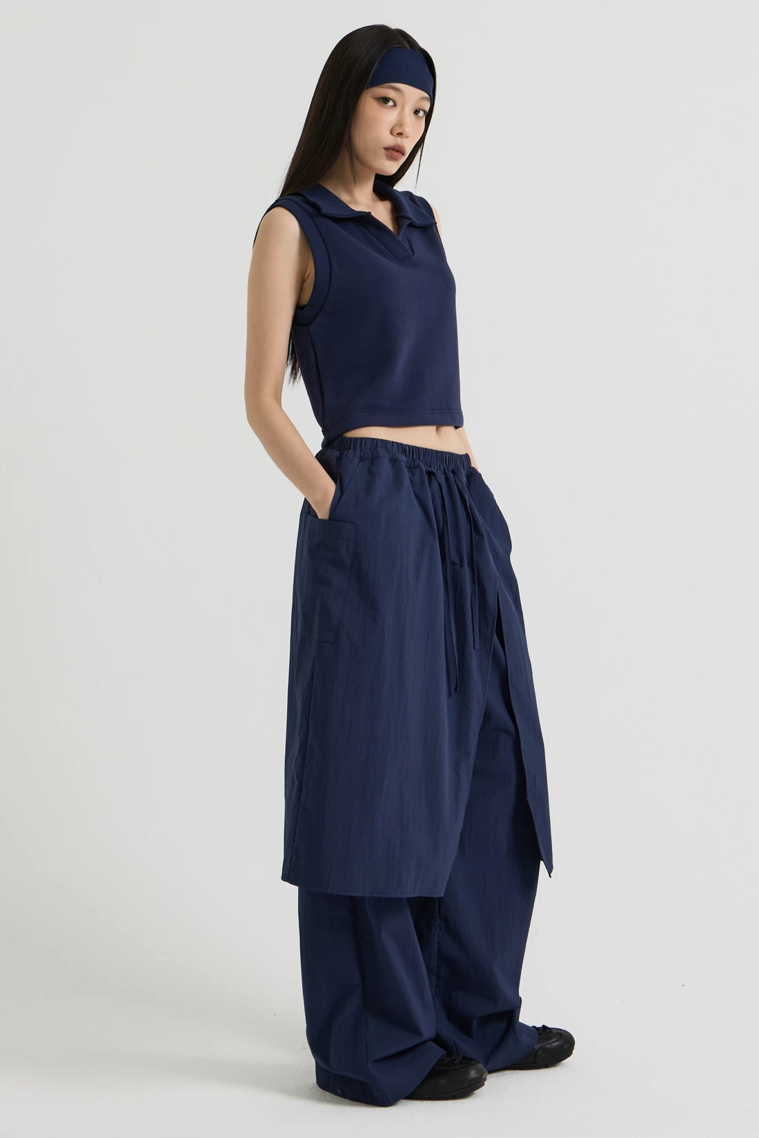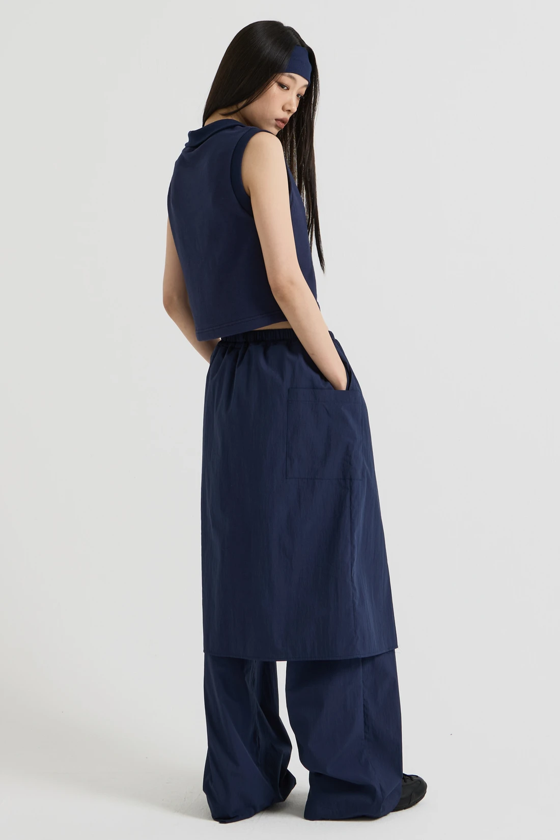 コットン素材を使用したスカートレイヤードデザインのバンディングパンツ。ワイドフィットシルエットで、スカート一体型のディテールが個性的なポイント。リラックス感とスタイル性を兼ね備えたデイリーアイテムです。 素材:コットン 64%、ナイロン 36% カラー:ネイビー モデル:168cm/ONEサイズ着用 サイズ(cm) ONE SIZE:総丈 100.5/ウエスト 32/ヒップ 54/太もも 34.5/股上 40/裾幅 29.5/スカート丈 67