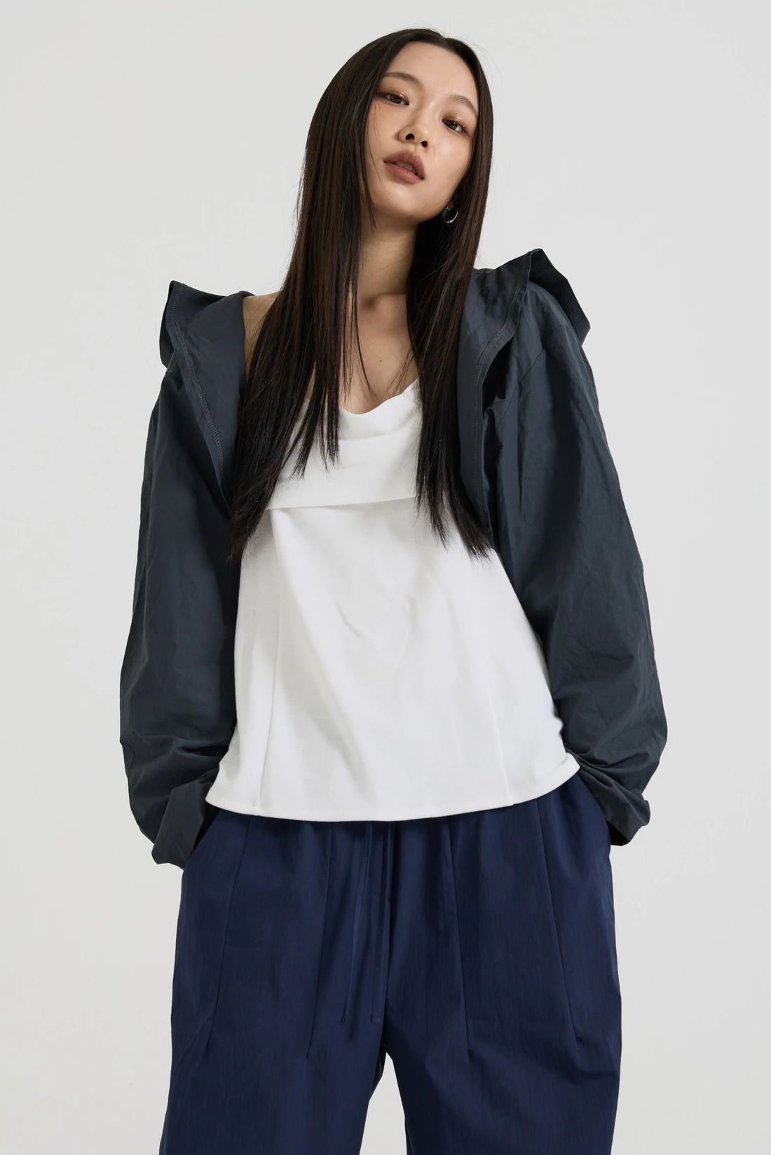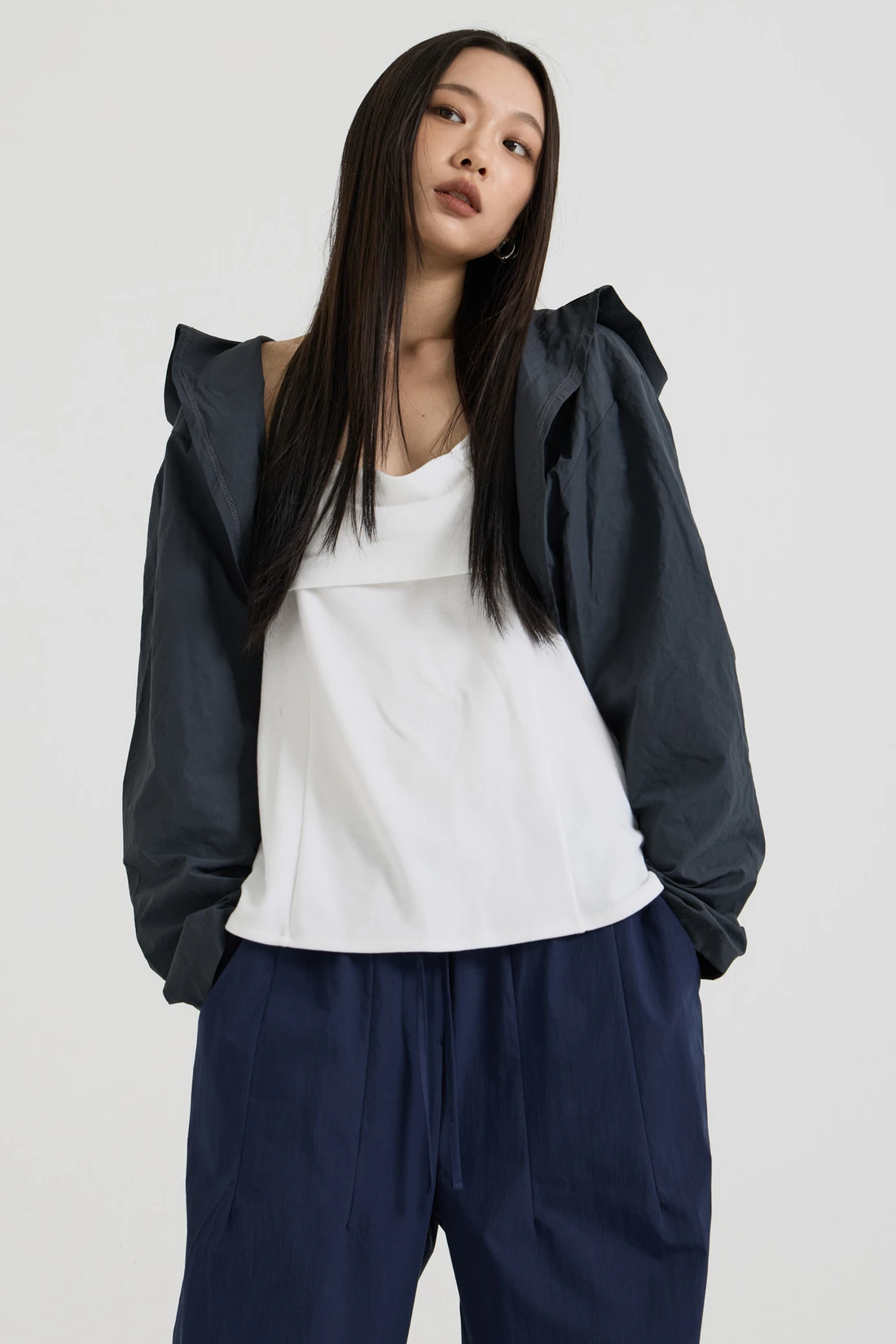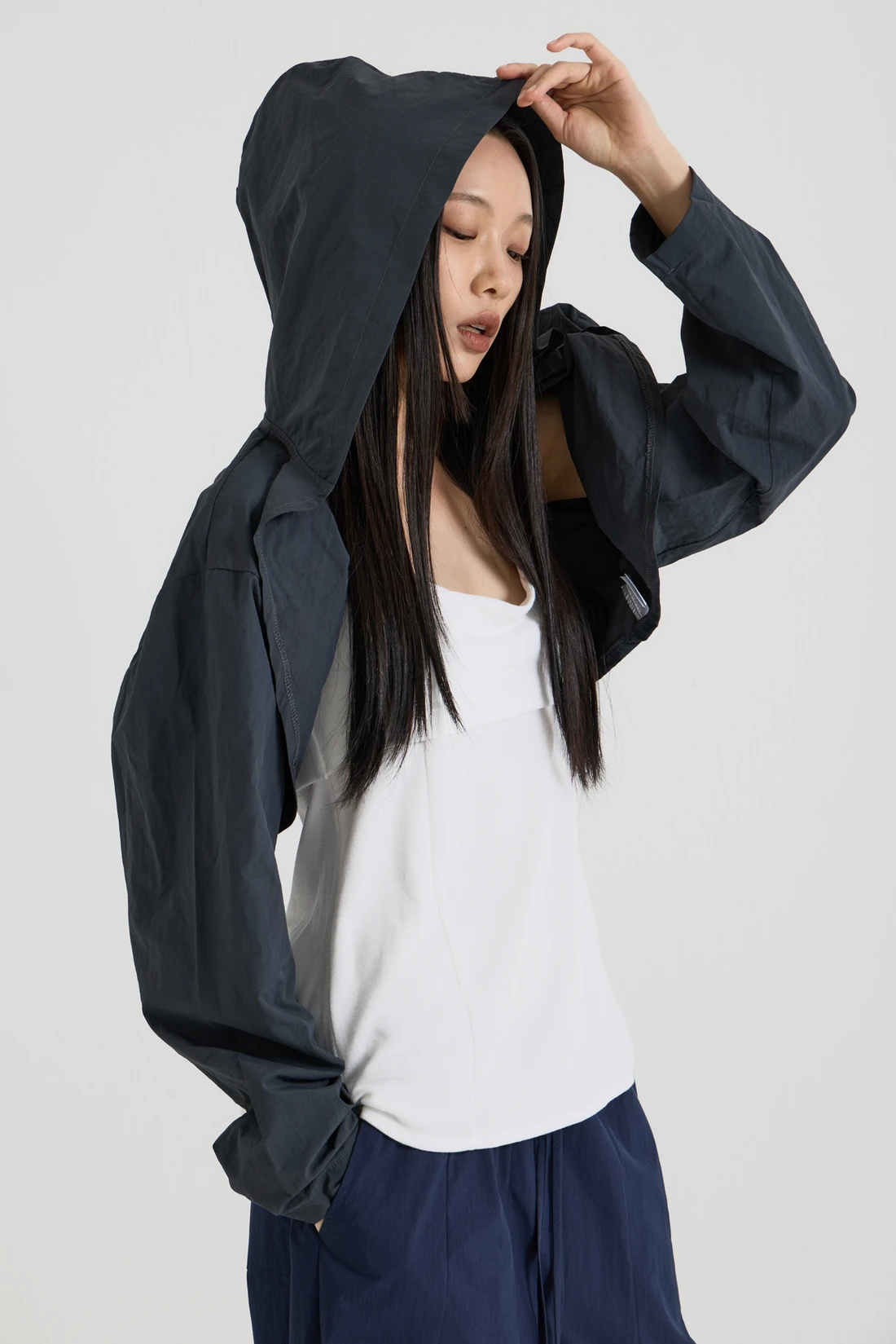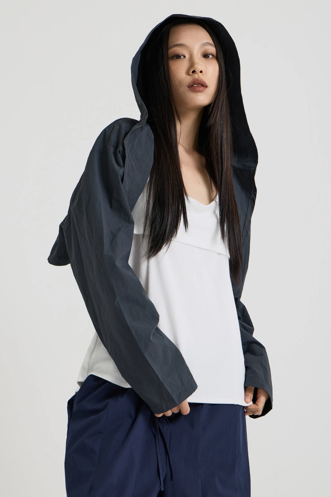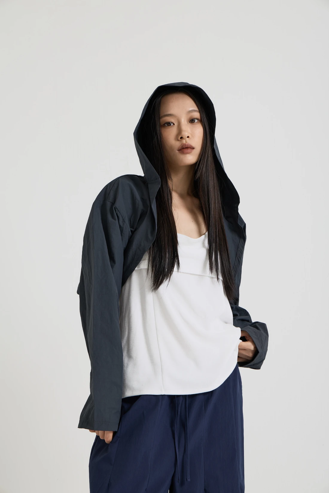 軽量ウーブン素材のフードボレロ。オープンデザインで、リサイクルナイロンを使用したサステナブルなアイテムです。 素材:ナイロン 75%、コットン 25% カラー:チャコール モデル:168cm/ONEサイズ着用 サイズ(cm) ONE SIZE:着丈 35/肩幅 55/バスト 53/アームホール 35/袖丈 59/裾幅 57