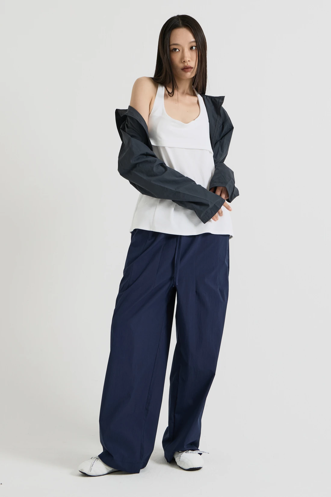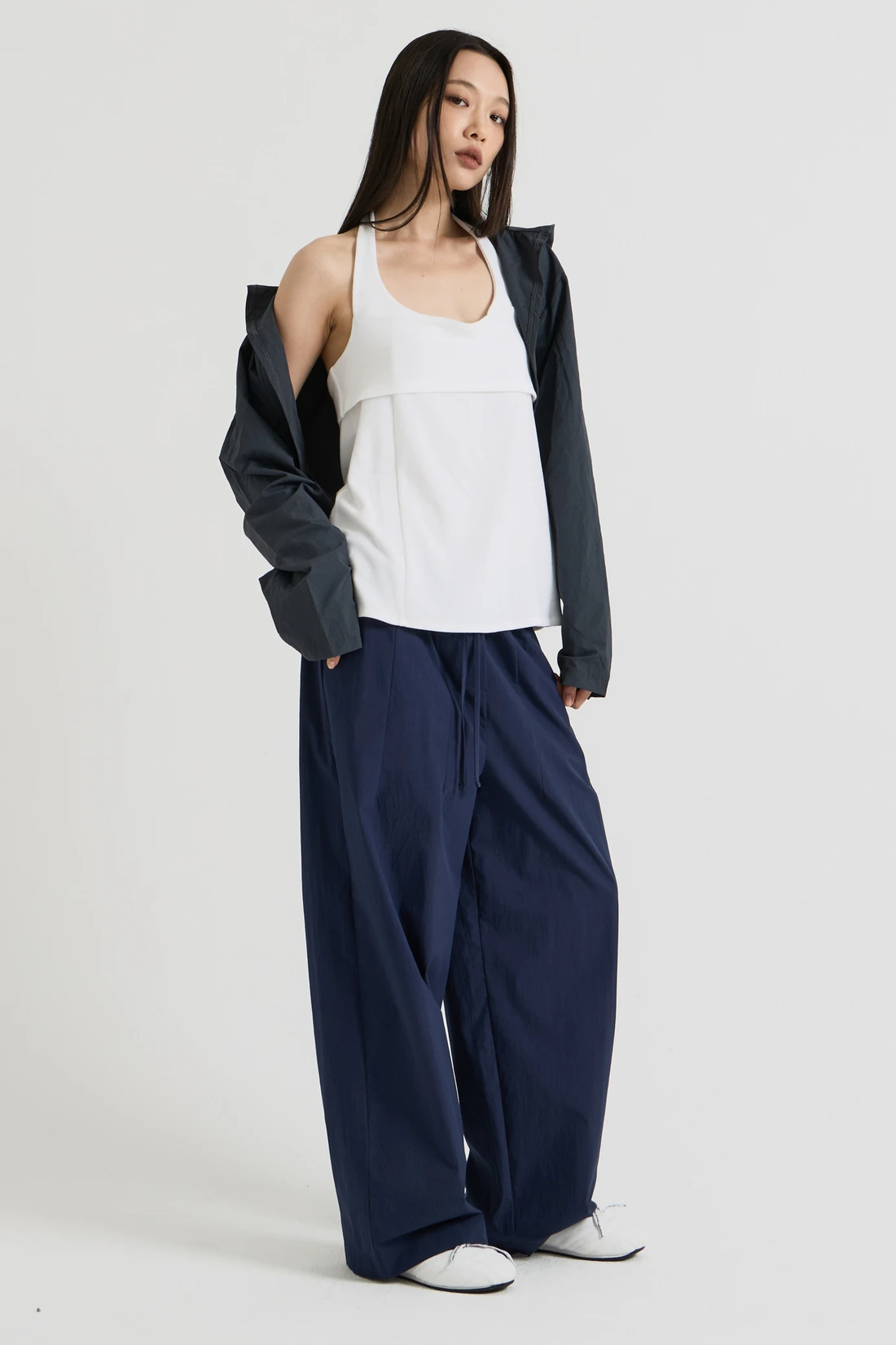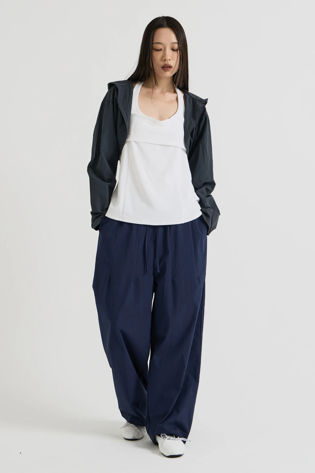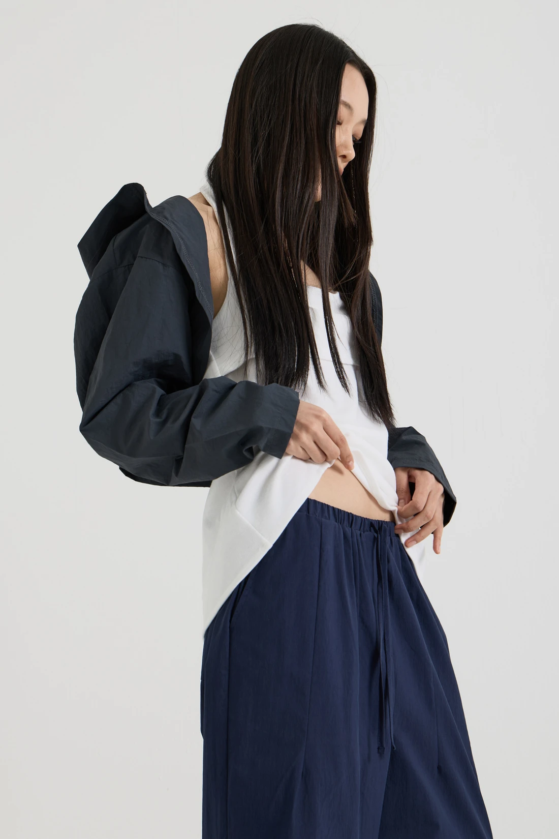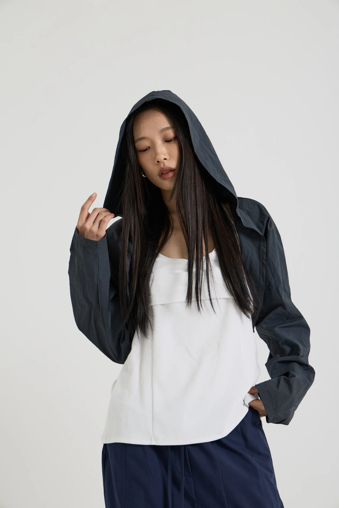 軽量ウーブン素材のフードボレロ。オープンデザインで、リサイクルナイロンを使用したサステナブルなアイテムです。 素材:ナイロン 75%、コットン 25% カラー:チャコール モデル:168cm/ONEサイズ着用 サイズ(cm) ONE SIZE:着丈 35/肩幅 55/バスト 53/アームホール 35/袖丈 59/裾幅 57