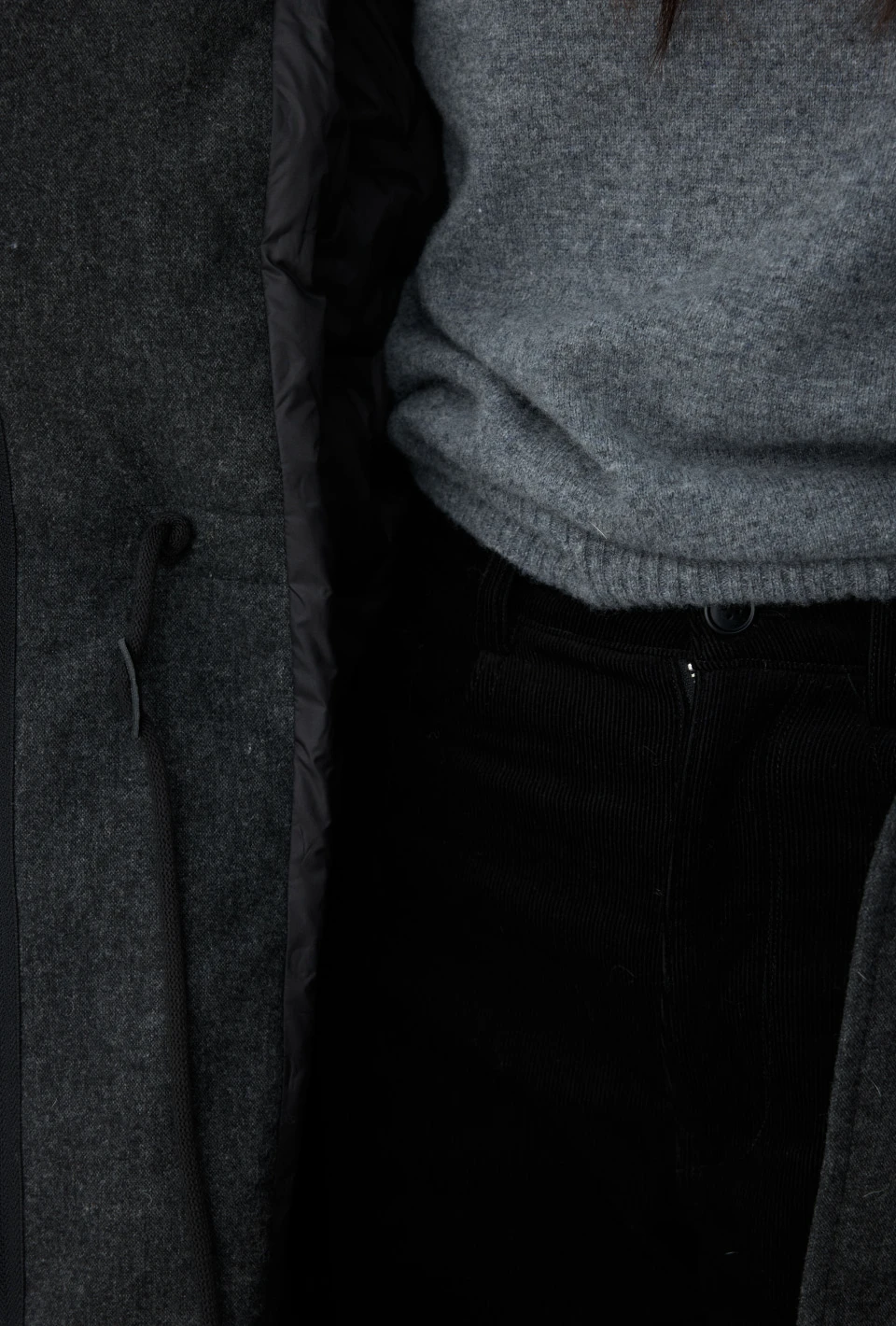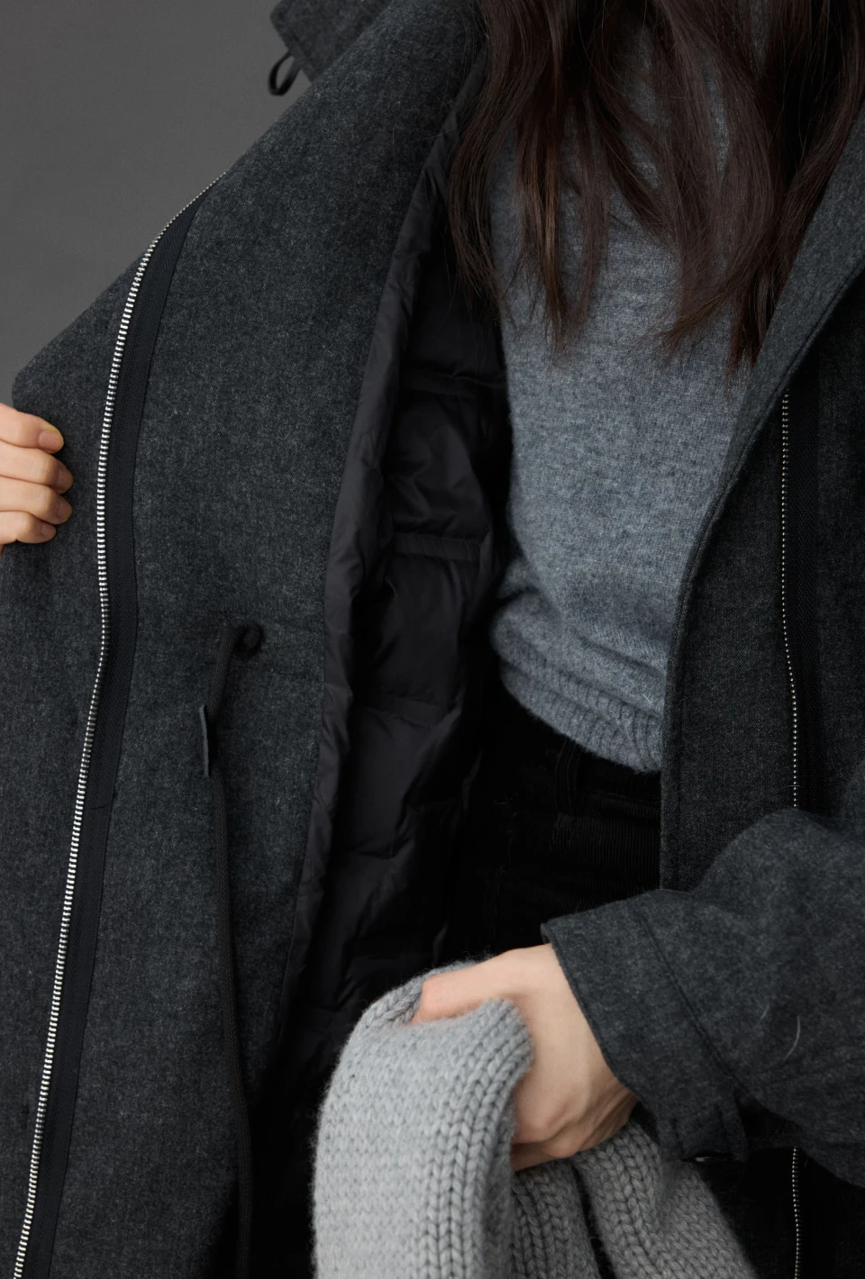 ストリングでシルエットを調整でき、ツーウェイジップでスタイルに変化をつけられるデザイン。