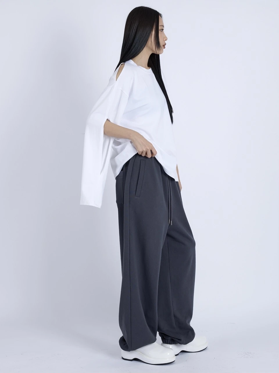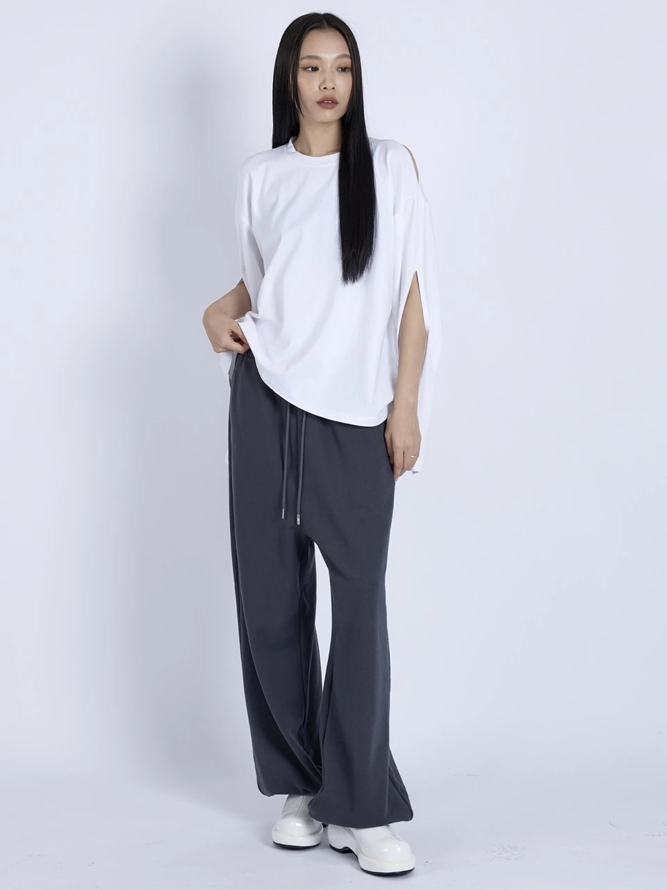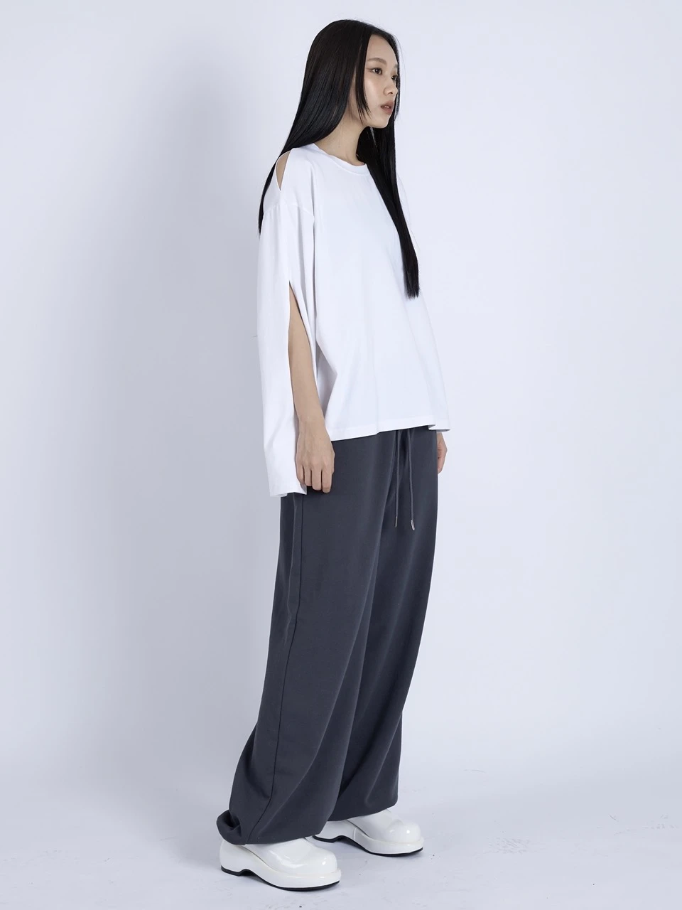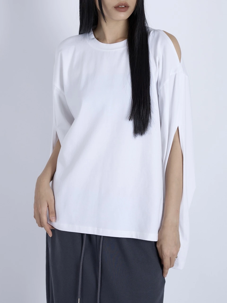 伸縮性のあるコットンジャージー素材を使用したロングスリーブトップ。ショルダーとスリーブに施されたカットアウトディテールが、程よい肌見せと抜け感を演出します。ゆったりとしたオーバーサイズシルエットで、カジュアルながらも洗練されたスタイルに仕上がります。 素材:コットン 95%、スパンデックス 5% カラー:ホワイト モデル:168cm/ONEサイズ着用 サイズ(cm) ONE SIZE:着丈 60/肩幅 54/バスト 58/アームホール 24/袖丈 57/裾幅 60
