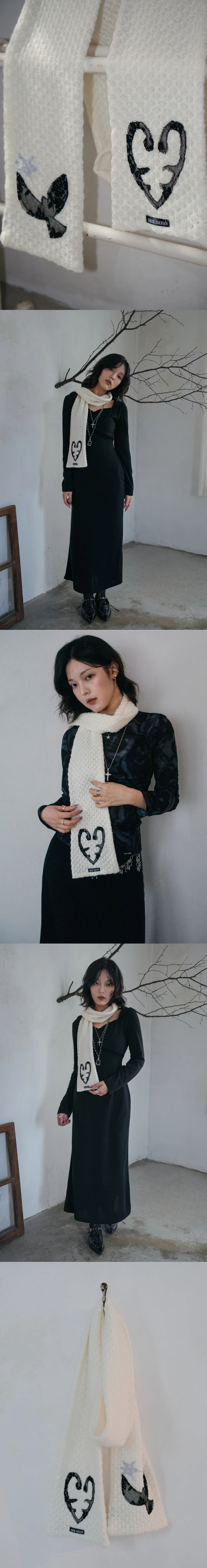 ウール混素材を使用したクロシェ編みのニットマフラー。温かみのある素材感と立体的な編み目が、冬のスタイリングにアクセントを添えます。