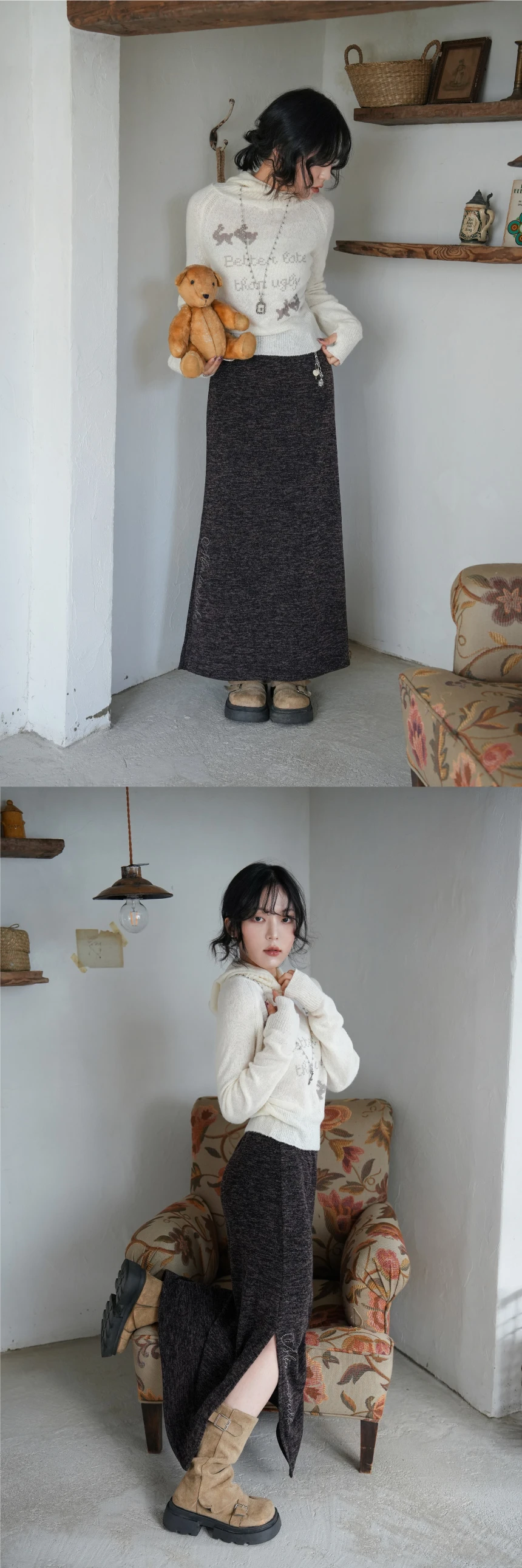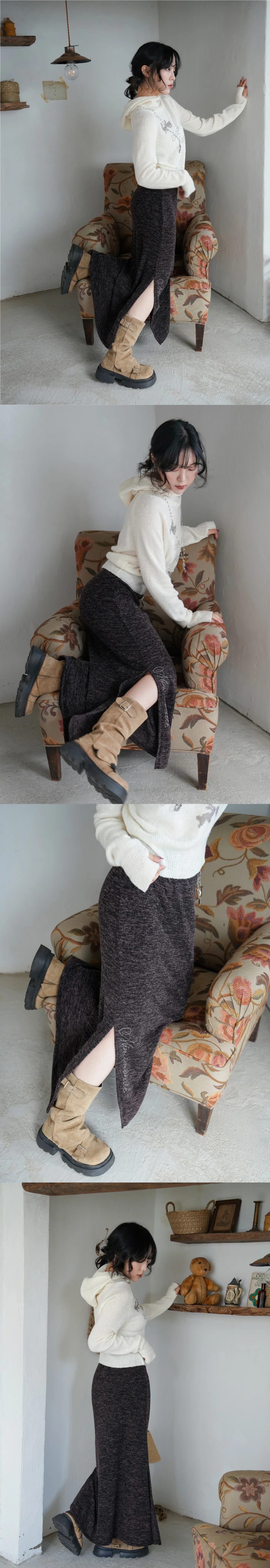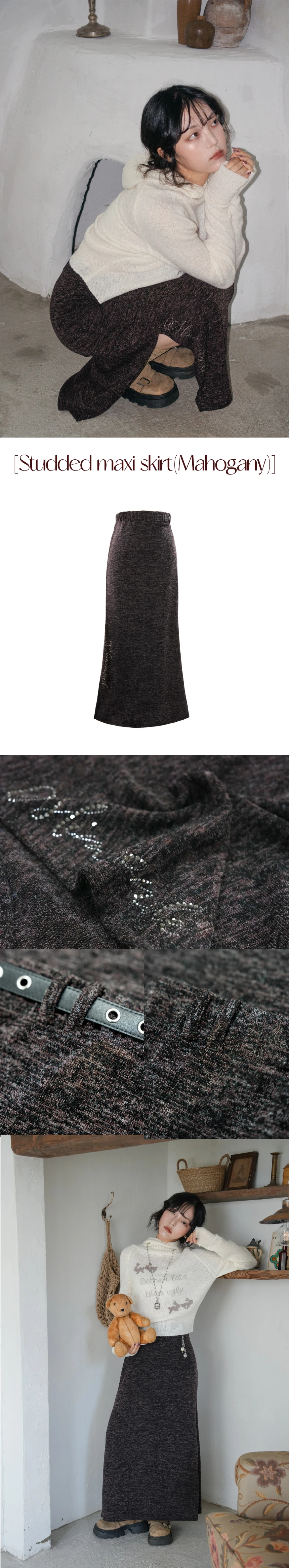 伸縮性のあるニット素材で、下着のラインが目立ちにくい適度な厚みのマキシスカート。ウエスト全体にゴムバンドが入っており、サイズ44~66半まで対応可能です。ウエストにはベルトループ付き。スカート右下のスタッズ装飾とスリットが程よくアクセントとなり、パンキッシュな印象を演出。ゆったりとしたマーメイドラインが、デイリー使いでもフェミニンでセンシュアルな雰囲気をプラスします。