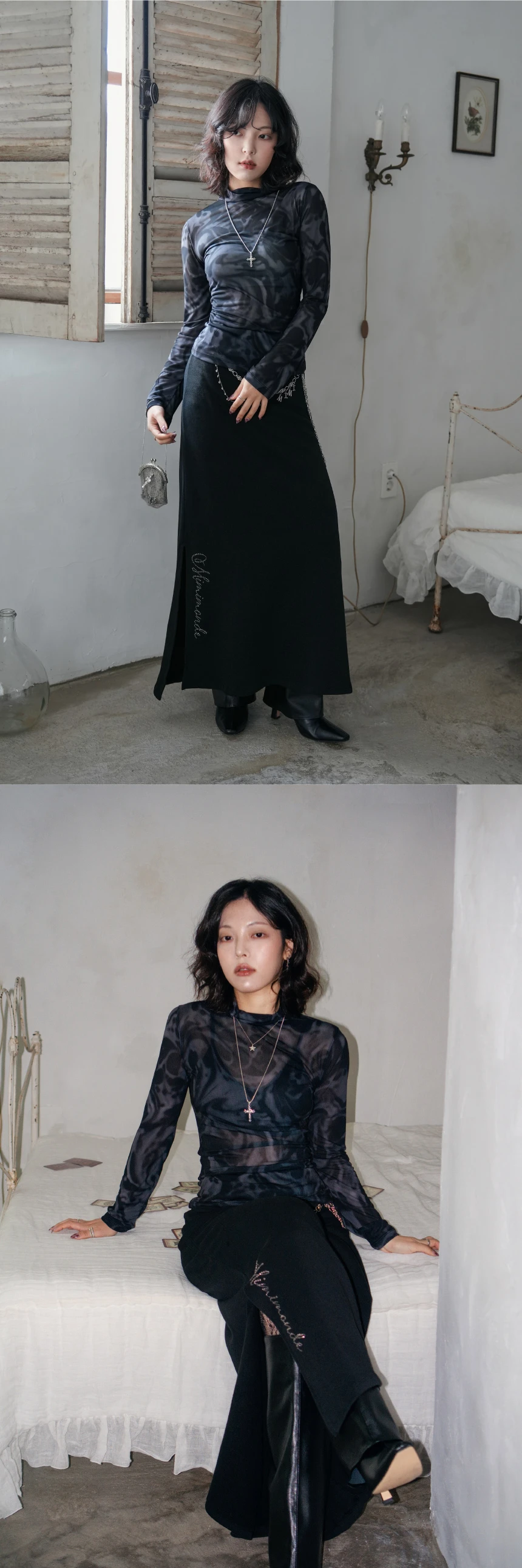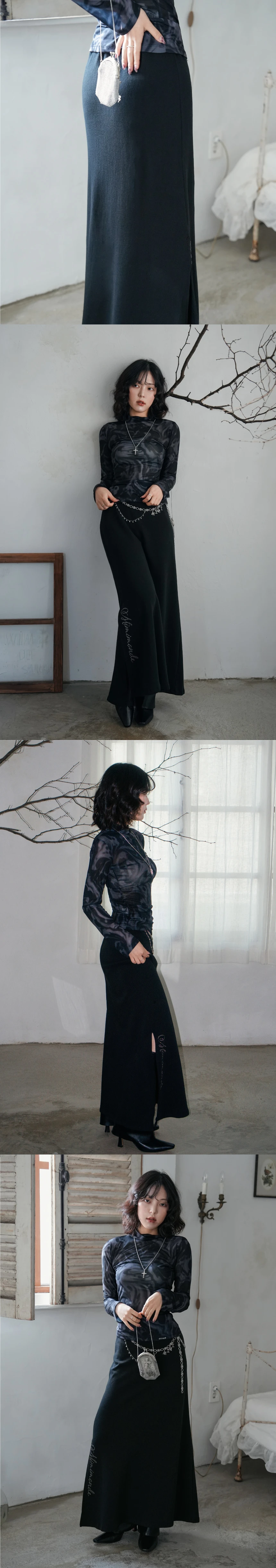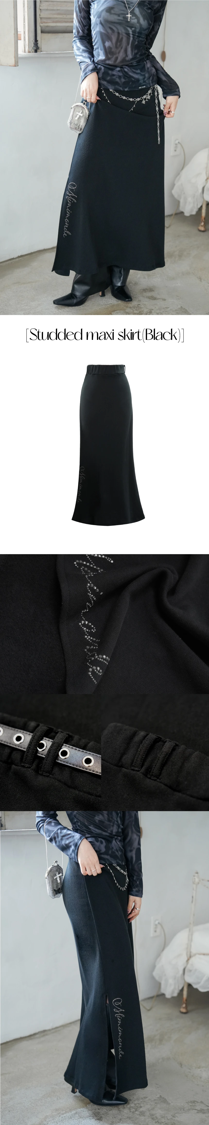伸縮性のある綿100%の起毛素材で、下着のラインが目立ちにくい適度な厚みのマキシスカート。ウエスト全体にゴムバンドが入っており、サイズ44~66半まで対応可能です。ウエストにはベルトループ付き。スカート右下のスタッズ装飾とスリットがアクセントになり、パンキッシュな雰囲気を演出。ゆったりとしたマーメイドラインが、デイリー使いでもフェミニンでセンシュアルな印象を与えます。