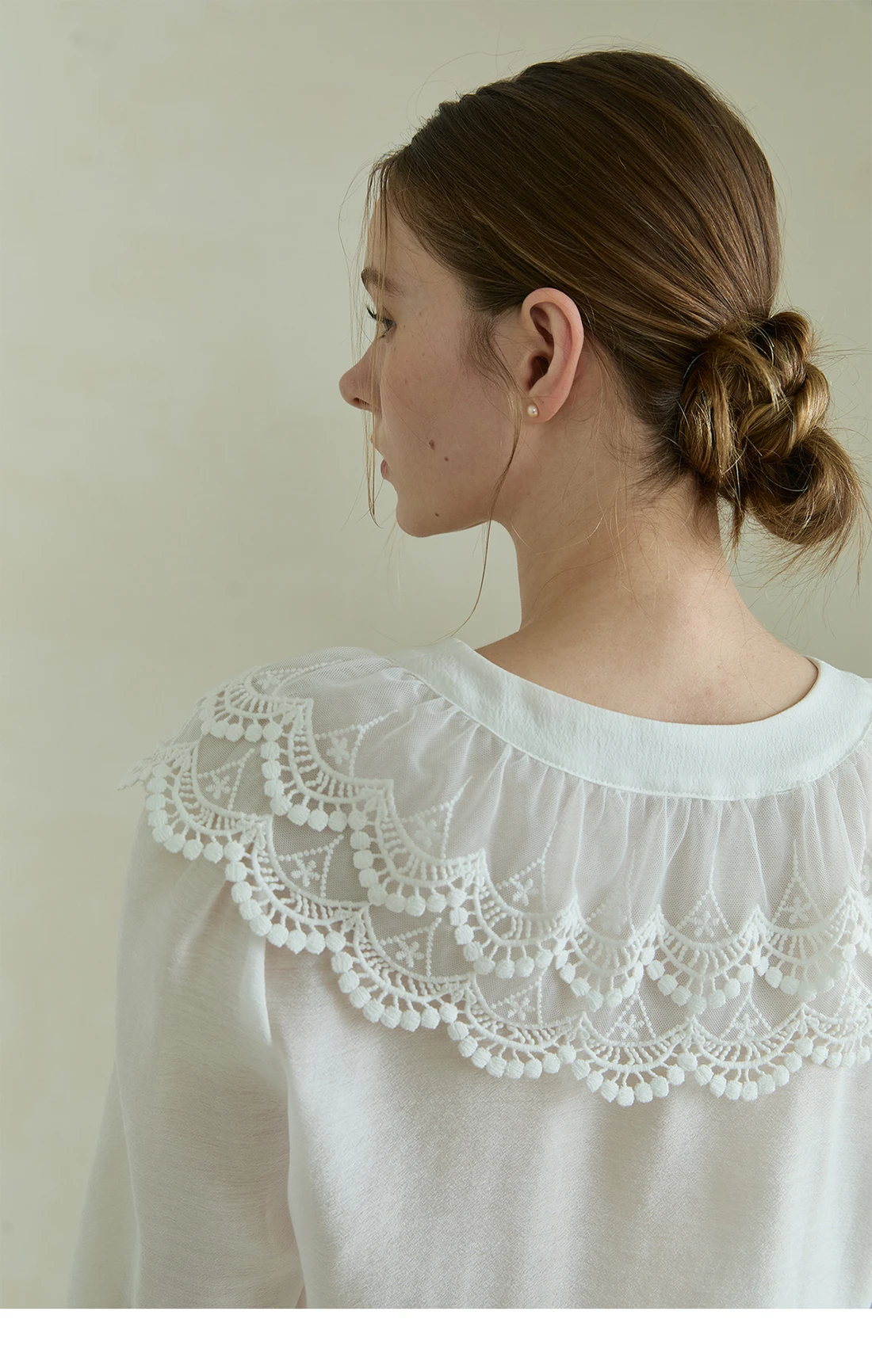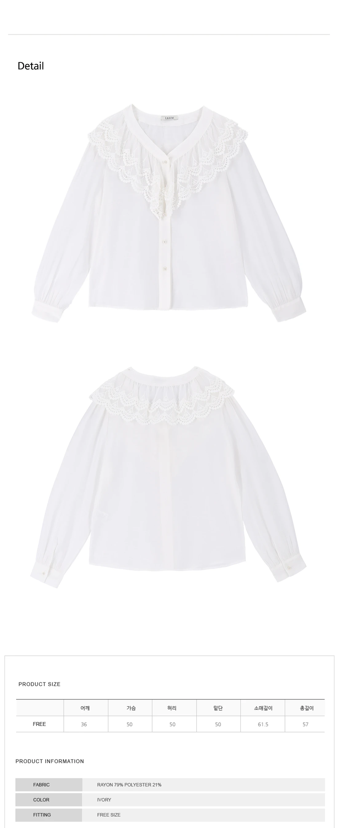 しずくのように澄んだ透明感のあるテクスチャーに、繊細に流れるダブルレースのディテールが映えるDewy Double Lace Blouseです。 華やかでありながら落ち着いたムードのクリームホワイトカラーは、どんなボトムスとも調和し、フェミニンな雰囲気を演出します。 程よいVネックラインがすっきりとした印象を与え、清楚なパールボタンが上品なアクセントに。軽やかで柔らかな着心地で、特別な日にはもちろん、デイリールックとしても活躍します。スカートと合わせればより完成度の高いスタイリングに。主役になりたい日の自然と手に取りたくなる一枚です。 Material Rayon 79% Polyester 21%