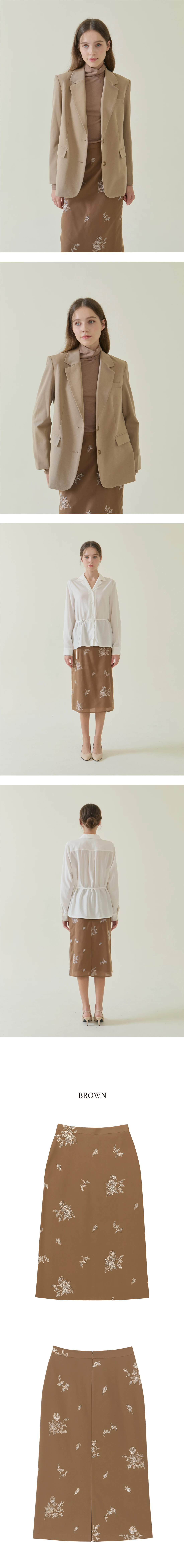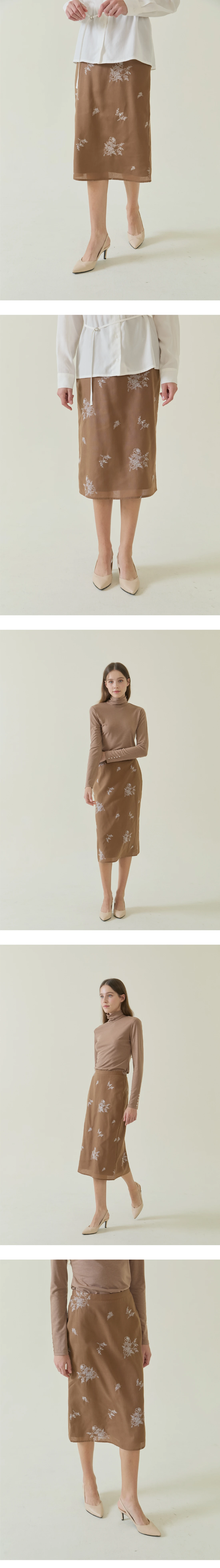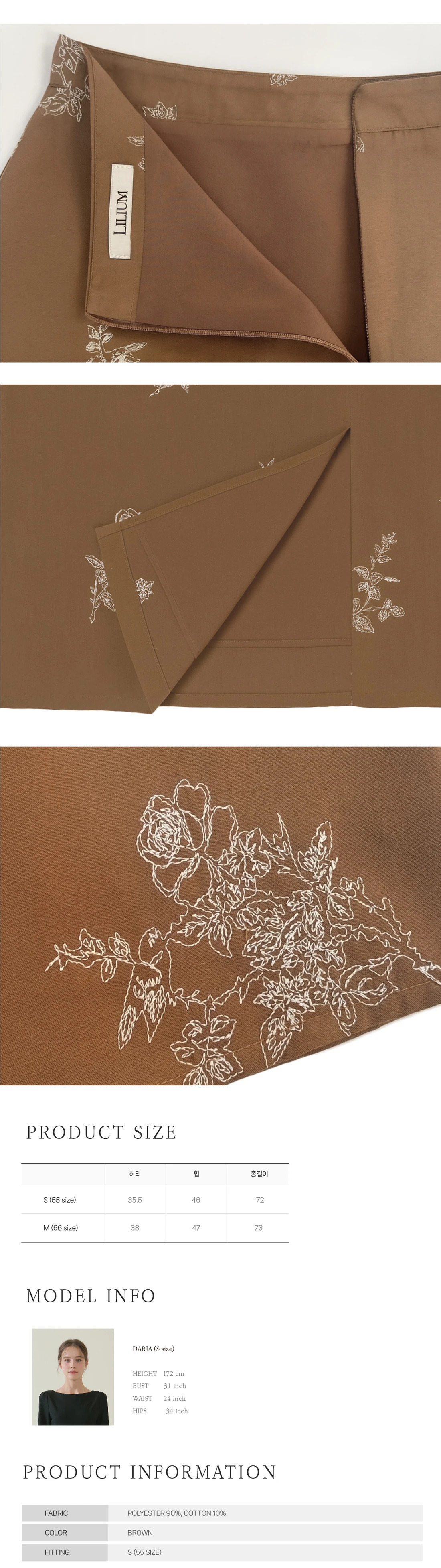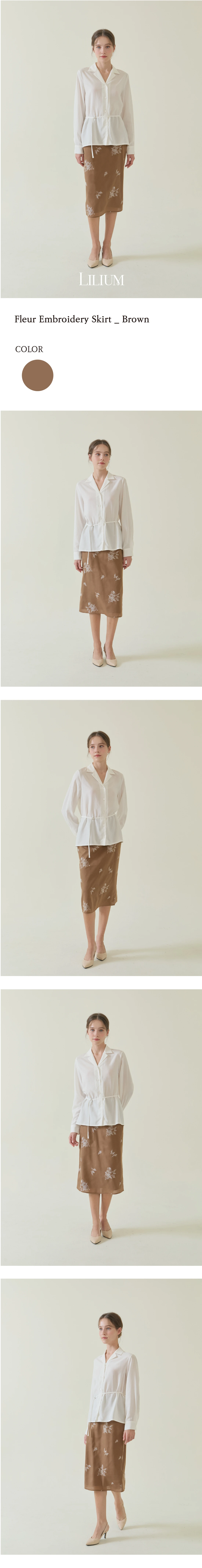 さりげない光沢のある生地に、ホワイトフラワーの刺繍が繊細に施された Lilium Fleur Embroidery Skirtです。 すっきりとしたHラインシルエットにバックベントを加え、動きやすさを確保。上品な刺繍の質感と柔らかな生地感が自然な女性らしさを演出します。 総裏地付きで透け感を気にせず安心して着用でき、秋の光を帯びたようなブラウンカラーが温かみと上品さを添えます。